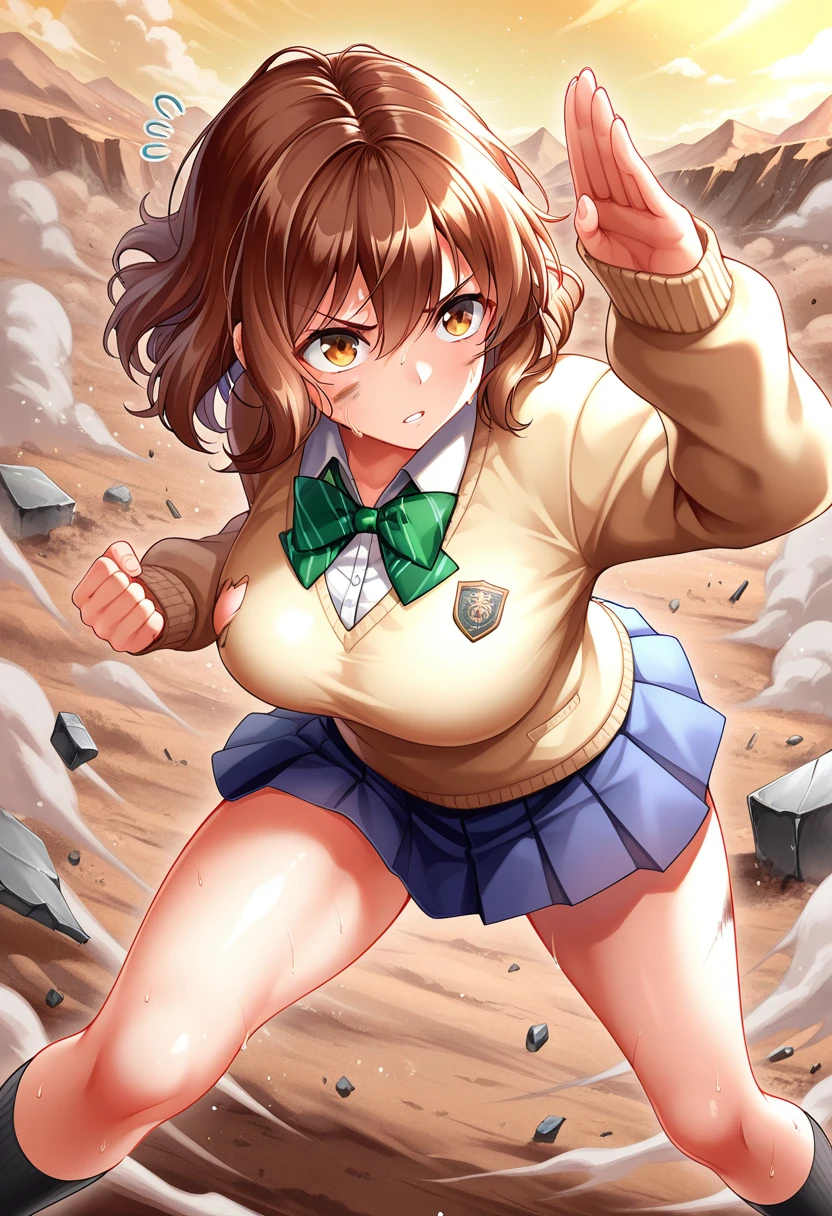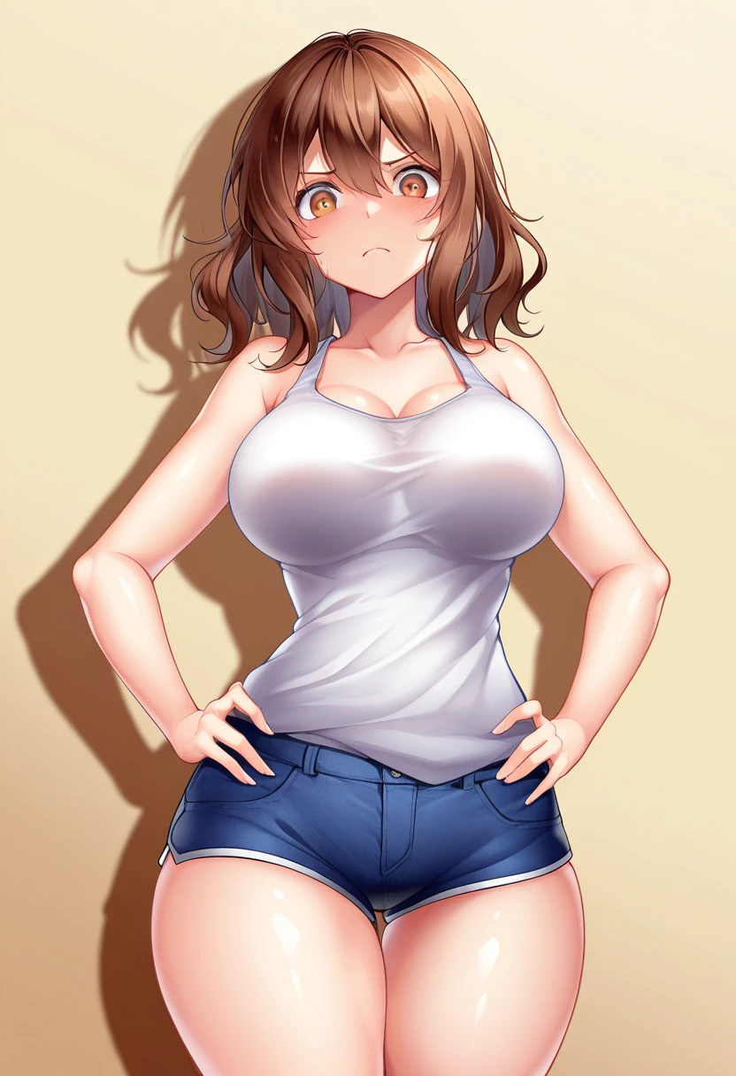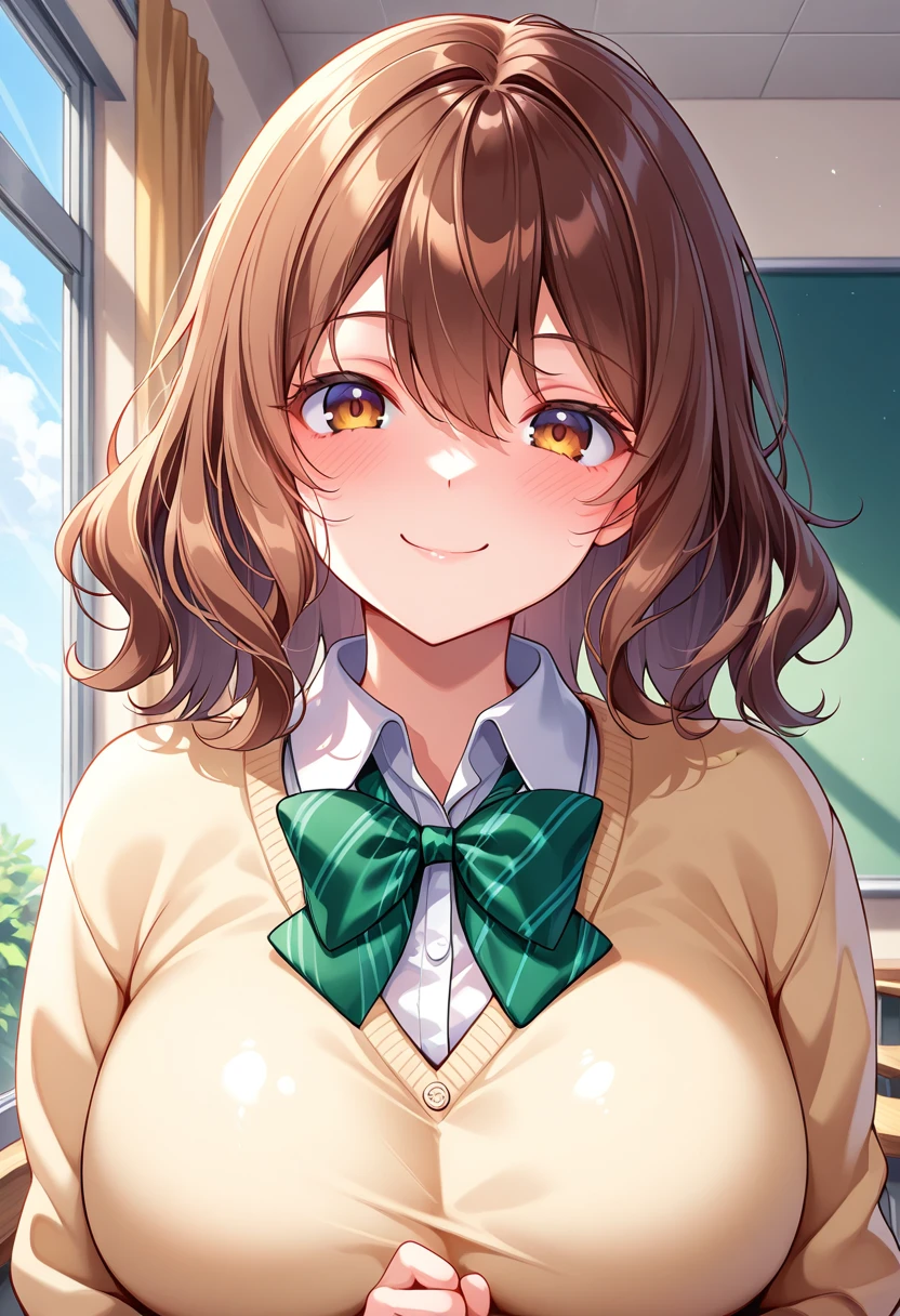 hinaww, brown eyes, brown hair, medium hair, hair between eyes, large breasts,