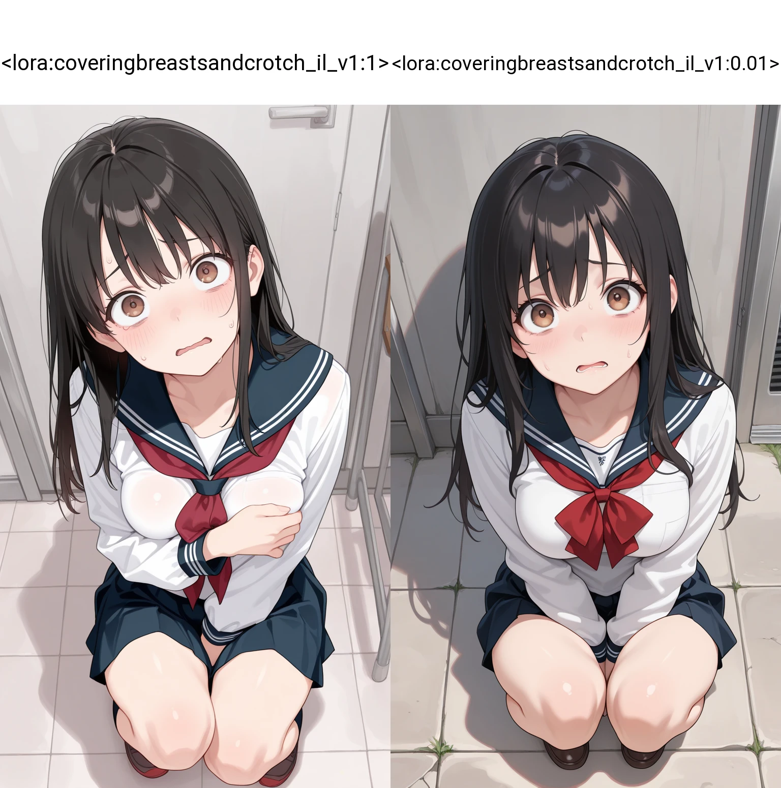 片手は胸を覆い、もう一方の片手はを覆う構図を生成しやすくするLoRA