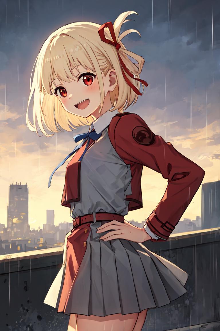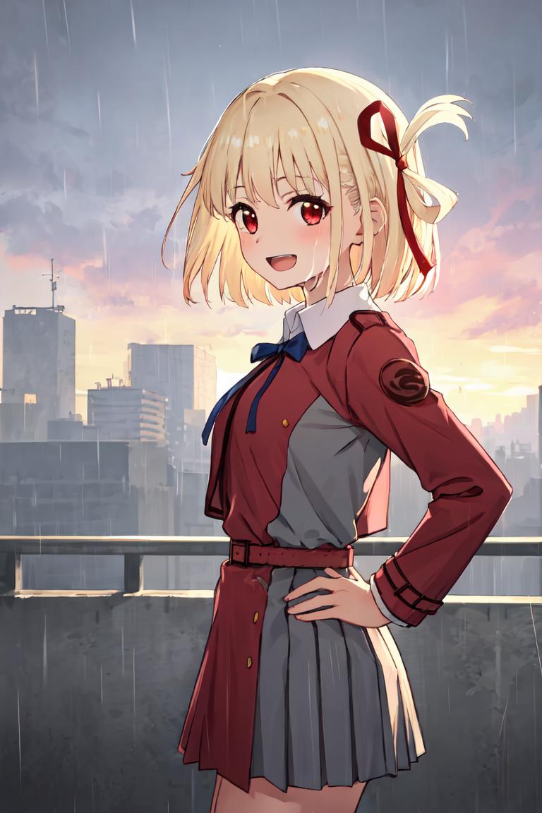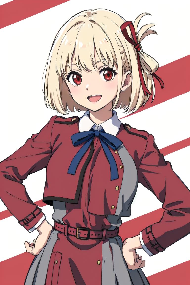 リコリス制服:lycoris uniform, two-tone dress, grey dress, pleated dress, belt, red belt,neck ribbon, blue ribbon, long sleeves,