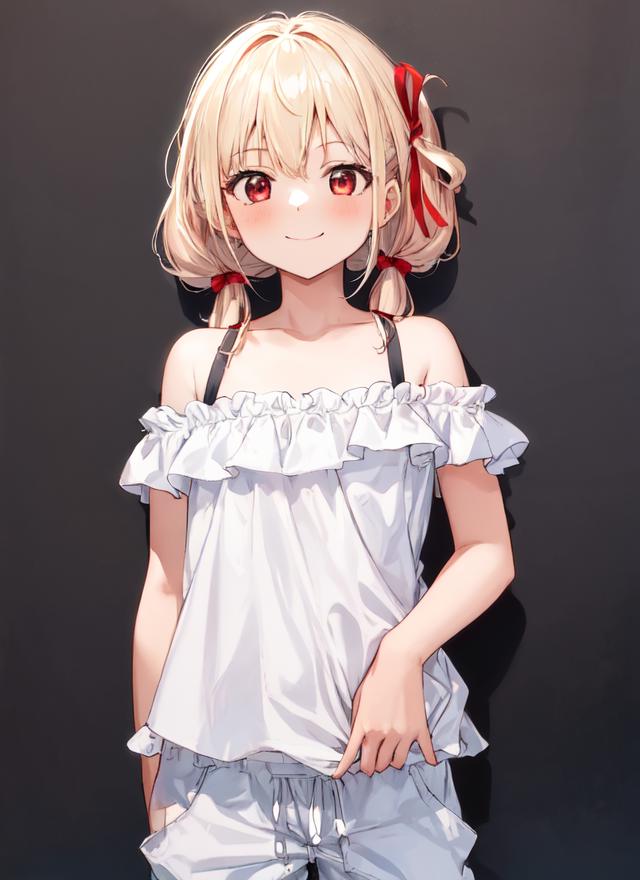 私服(部屋着):frilled shirt, shirt, twintails, white shirt, frills, white pants, pants, collarbone, off-shoulder shirt, off shoulder, short twintails, pajamas, bare shoulders,