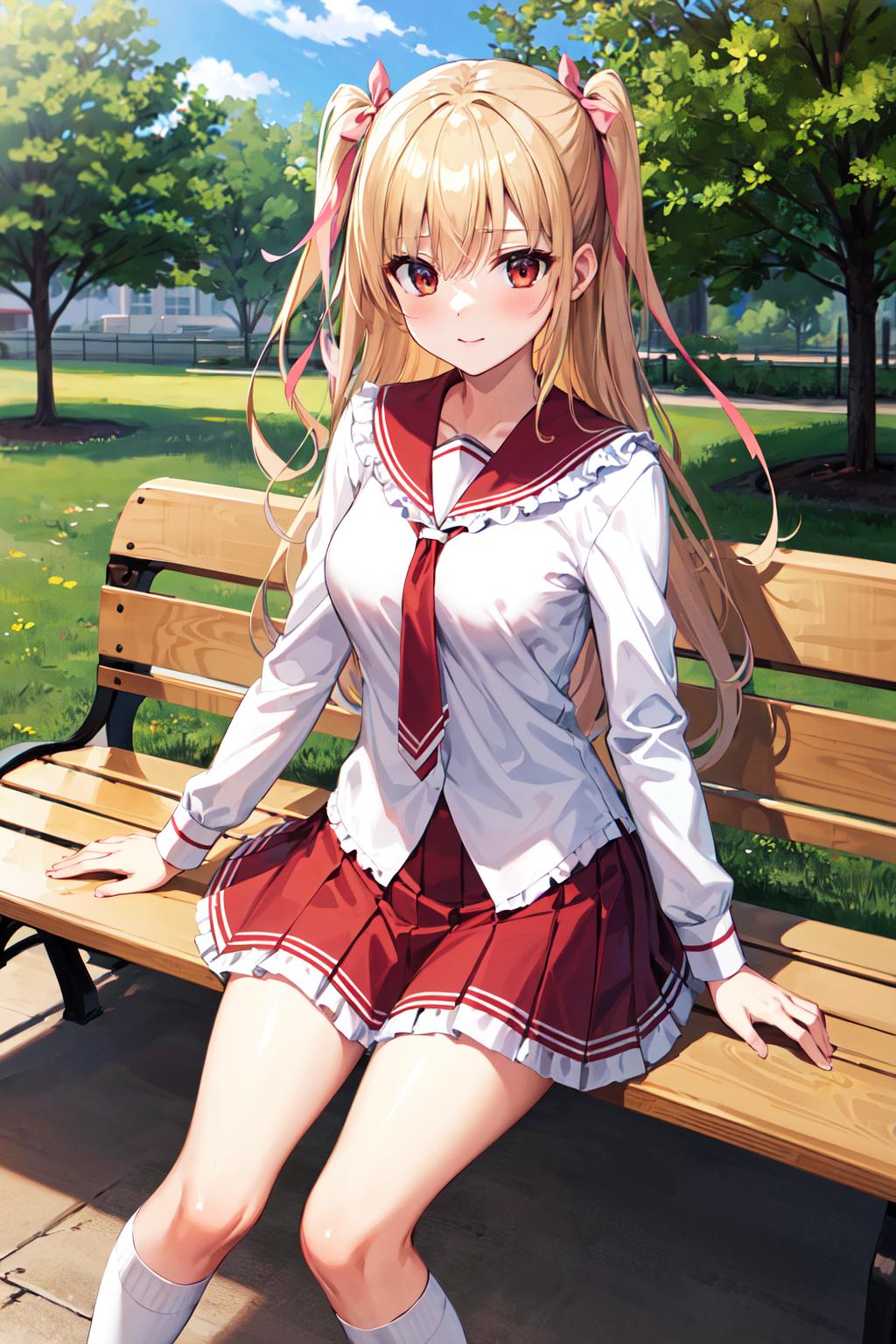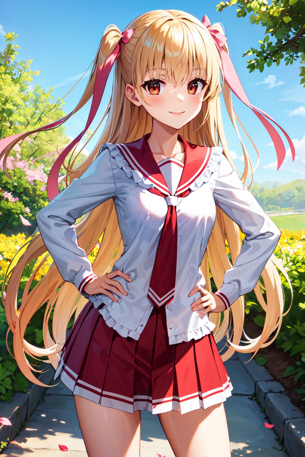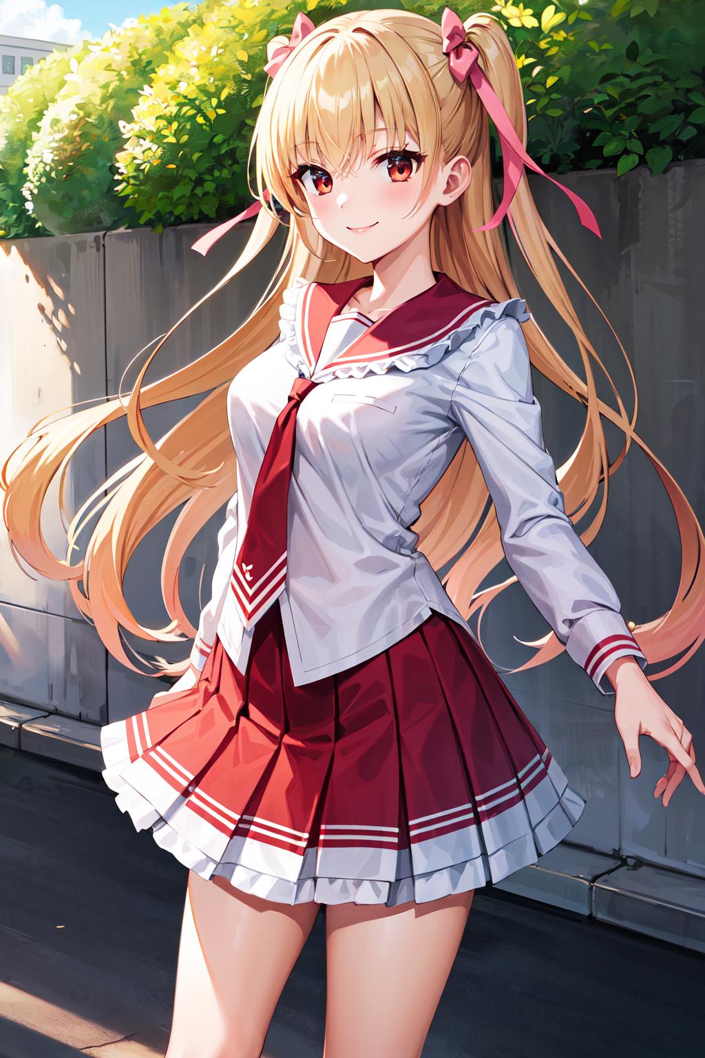 outfit1aariko, long hair, blonde hair, two side up, hair ribbon, pink ribbon, school uniform, frills, serafuku, sailor collar, necktie, white shirt, long sleeves, red skirt