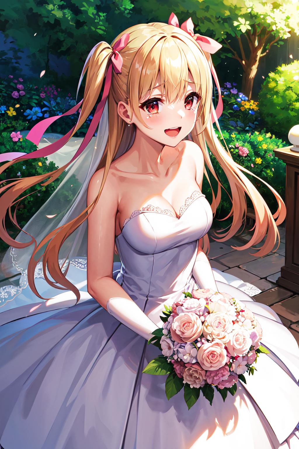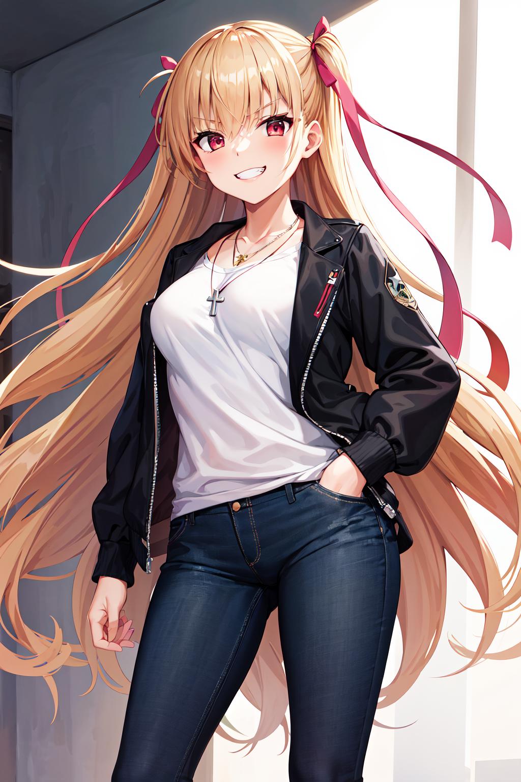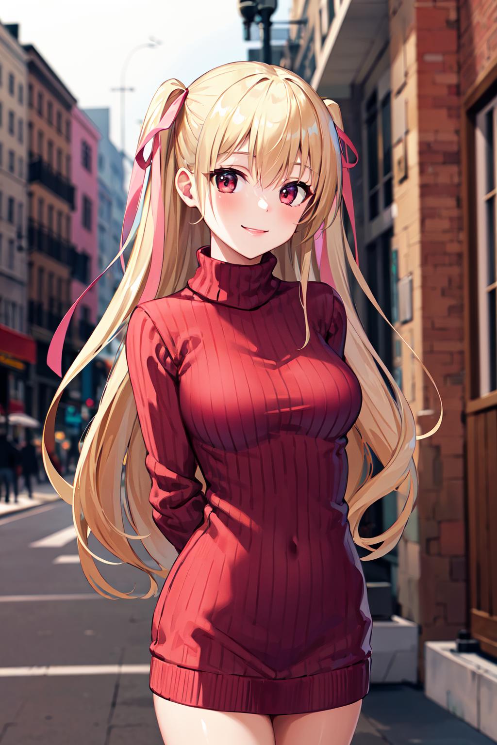 outfit1aariko, long hair, blonde hair, two side up, hair ribbon, pink ribbon, school uniform, frills, serafuku, sailor collar, necktie, white shirt, long sleeves, red skirt