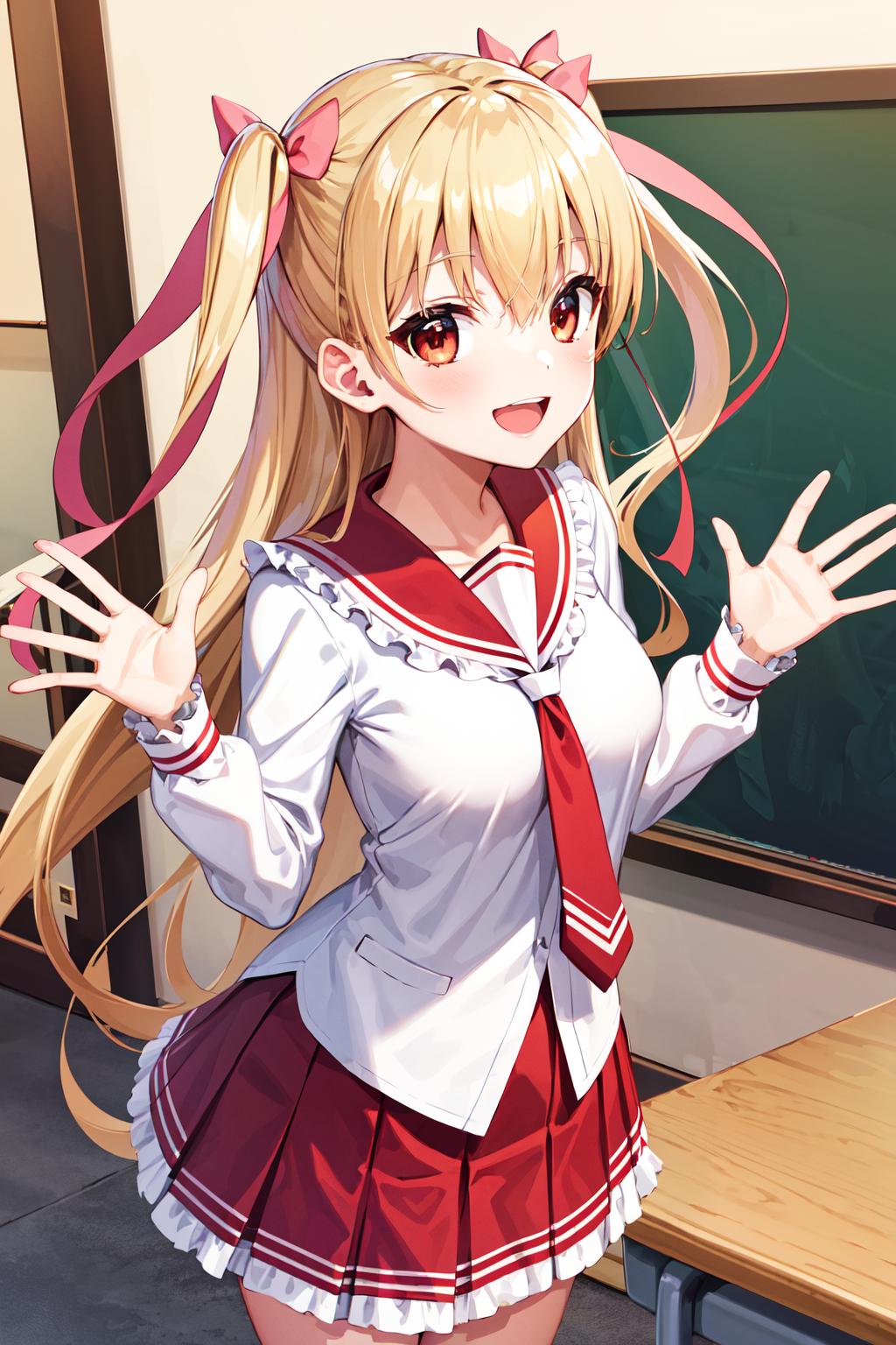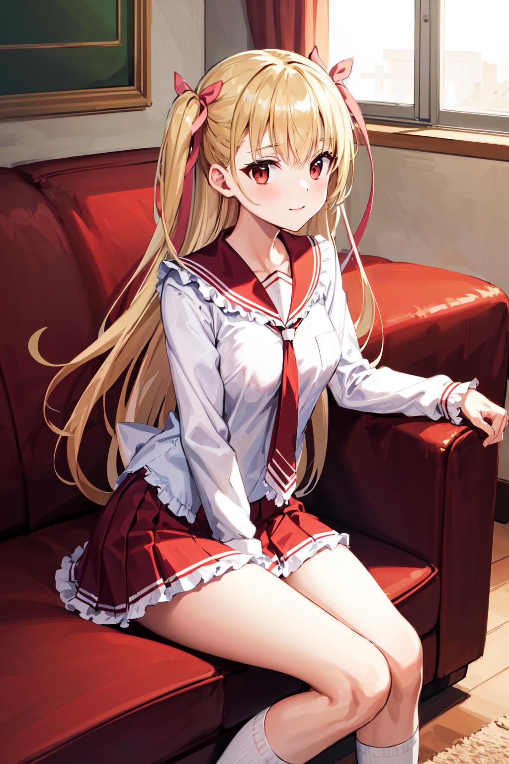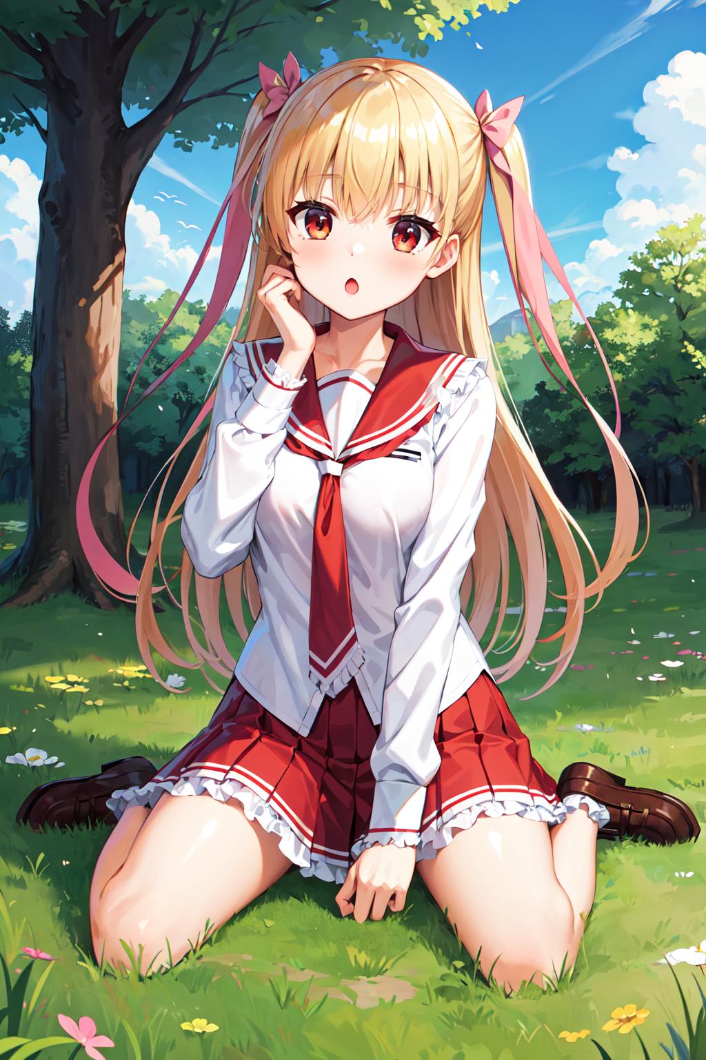 aariko, long hair, blonde hair, two side up, hair ribbon, pink ribbon, school uniform, frills, serafuku, sailor collar, necktie, white shirt, long sleeves, red skirt