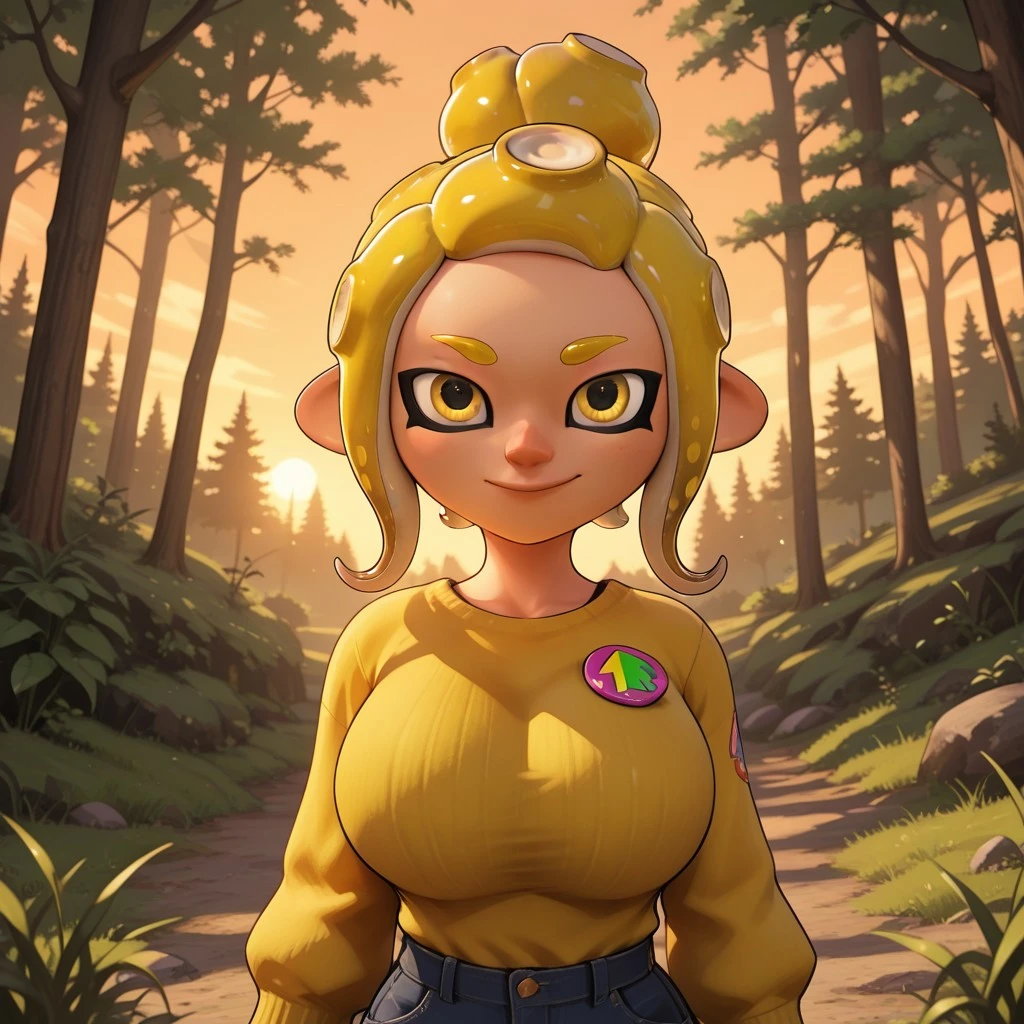 SilviaOC, splatoon, octoling, female octoling, 1girl, cute, tentacle hair, ponytail, yellow hair, yellow eyes, cute eyes, yellow eyebrows, yellow clothing, dark blue pants, yellow shoes