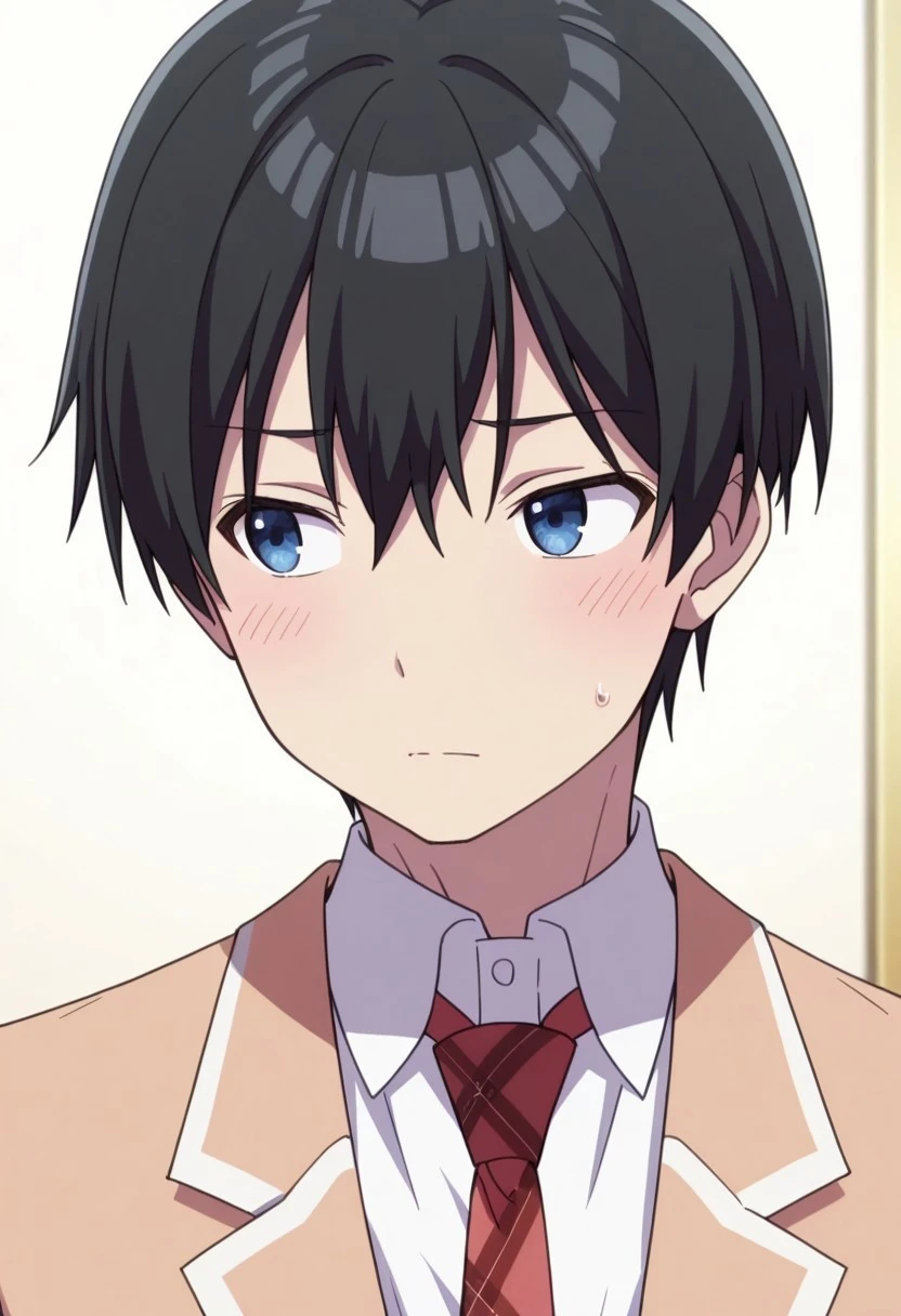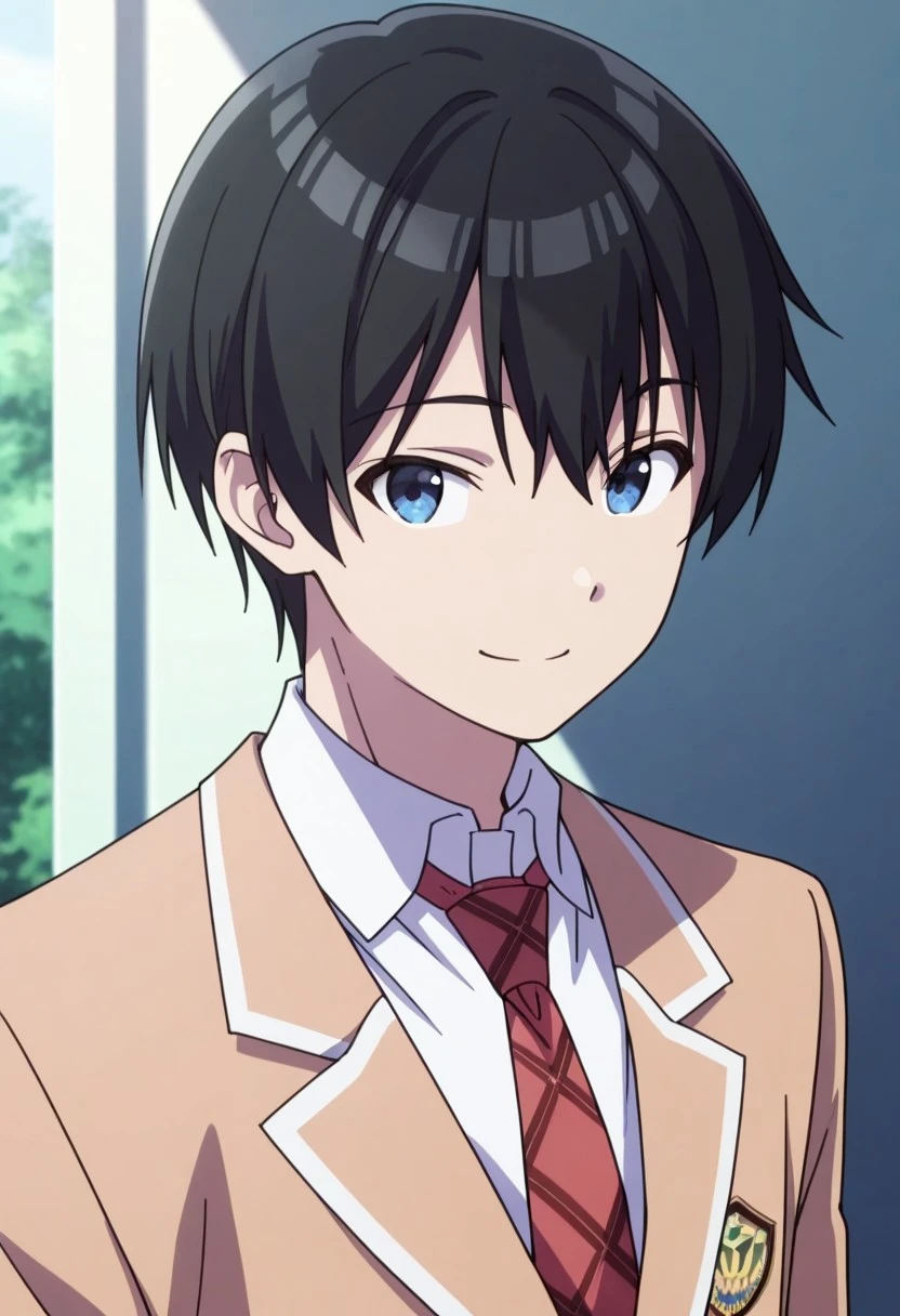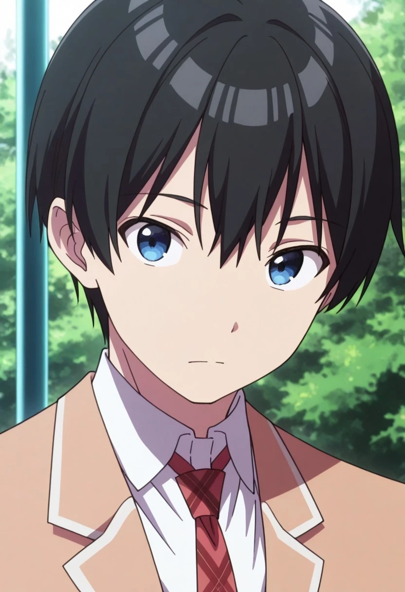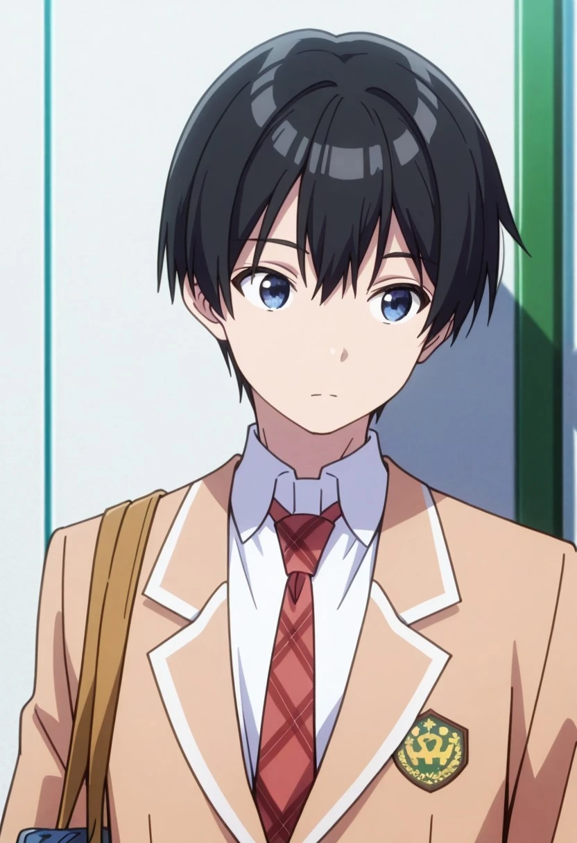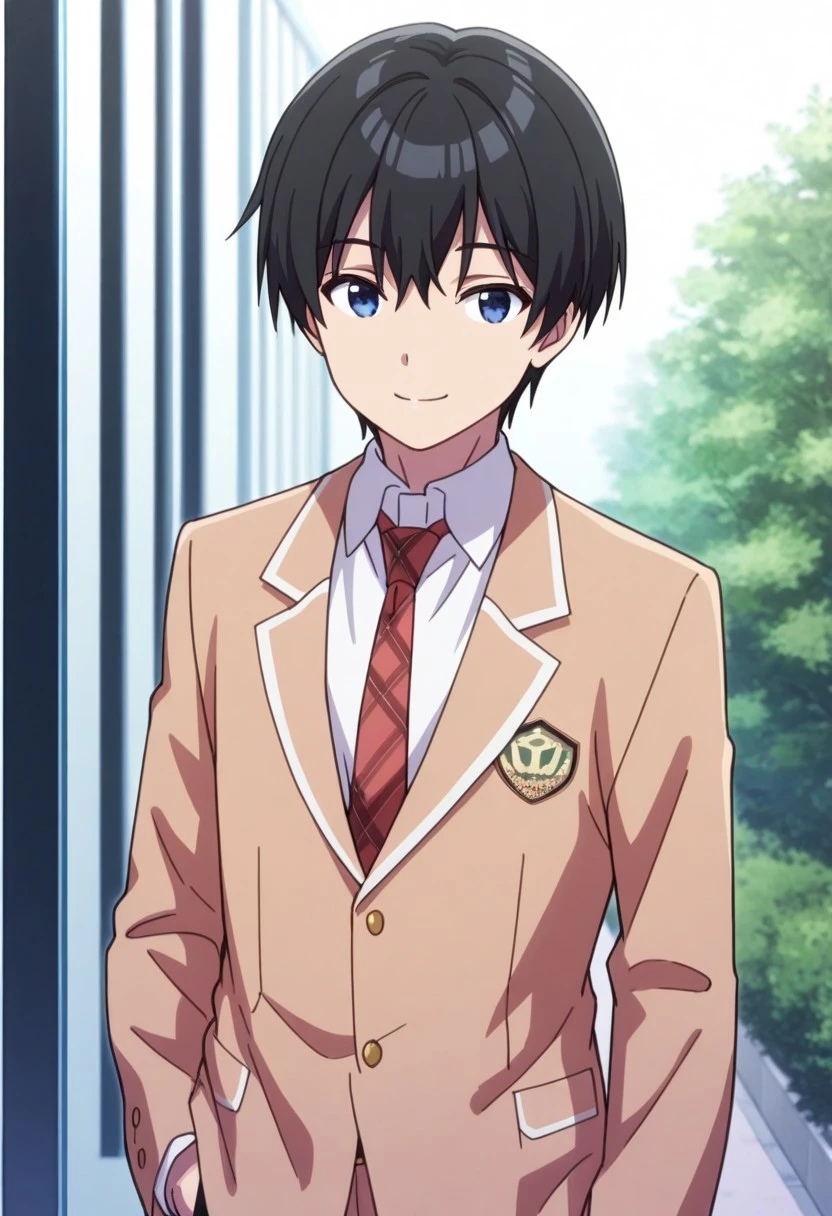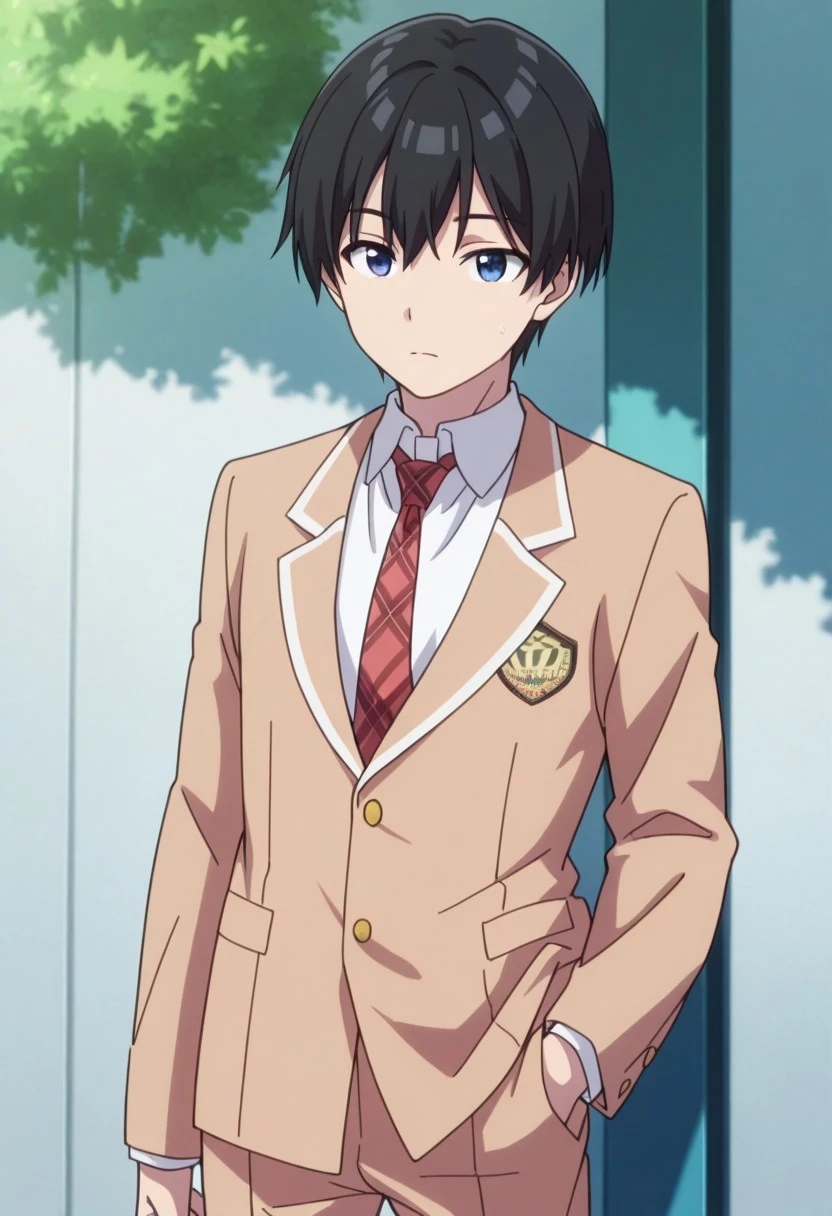 saritoho, 1boy, male focus, solo, blue eyes, black hair, short hair, hair between eyes, school uniform, shirt, white shirt, collared shirt, necktie, red necktie, plaid necktie, plaid, jacket, blazer, brown jacket, long sleeves, pants, brown pants, shoes, brown footwear