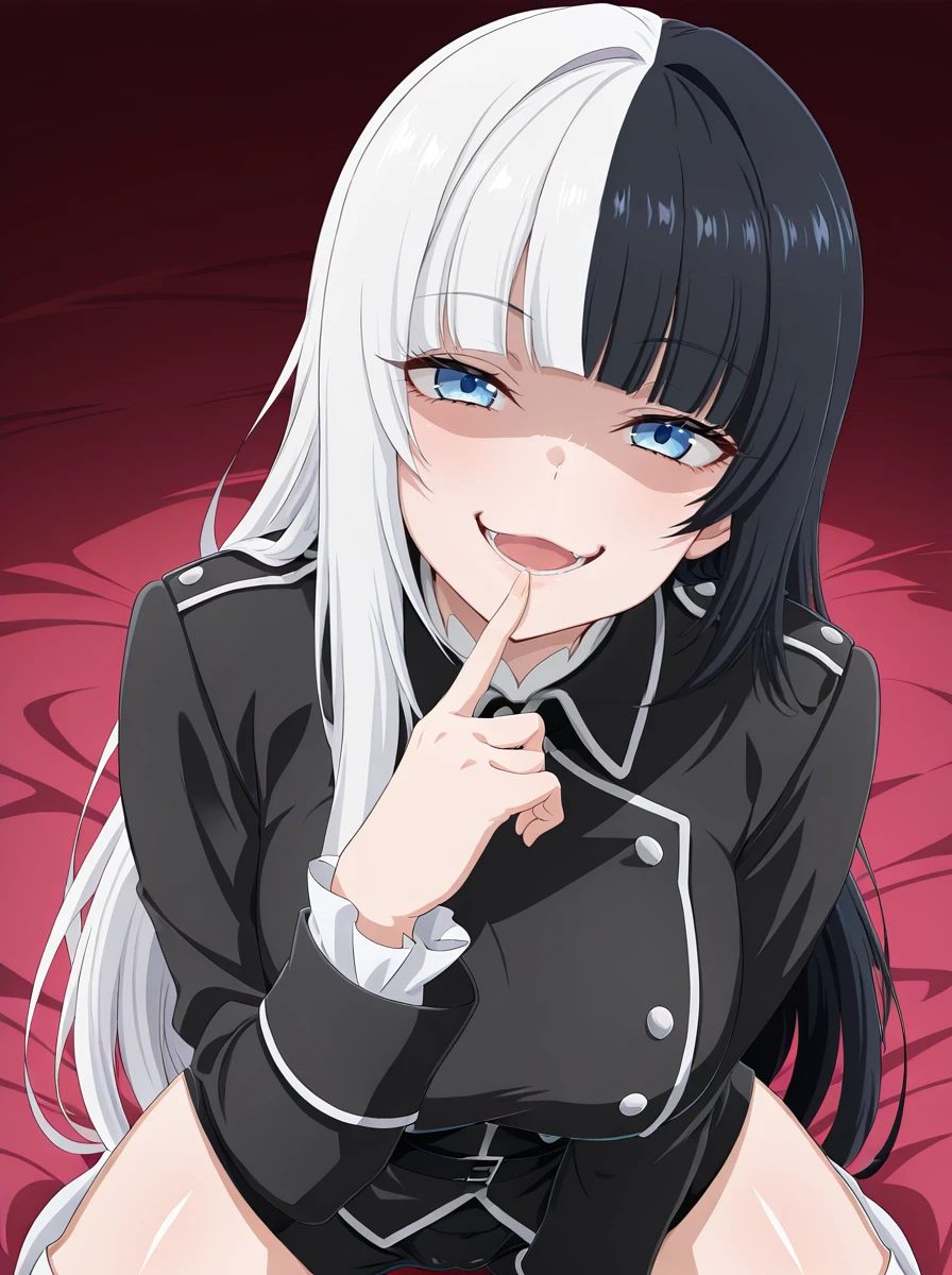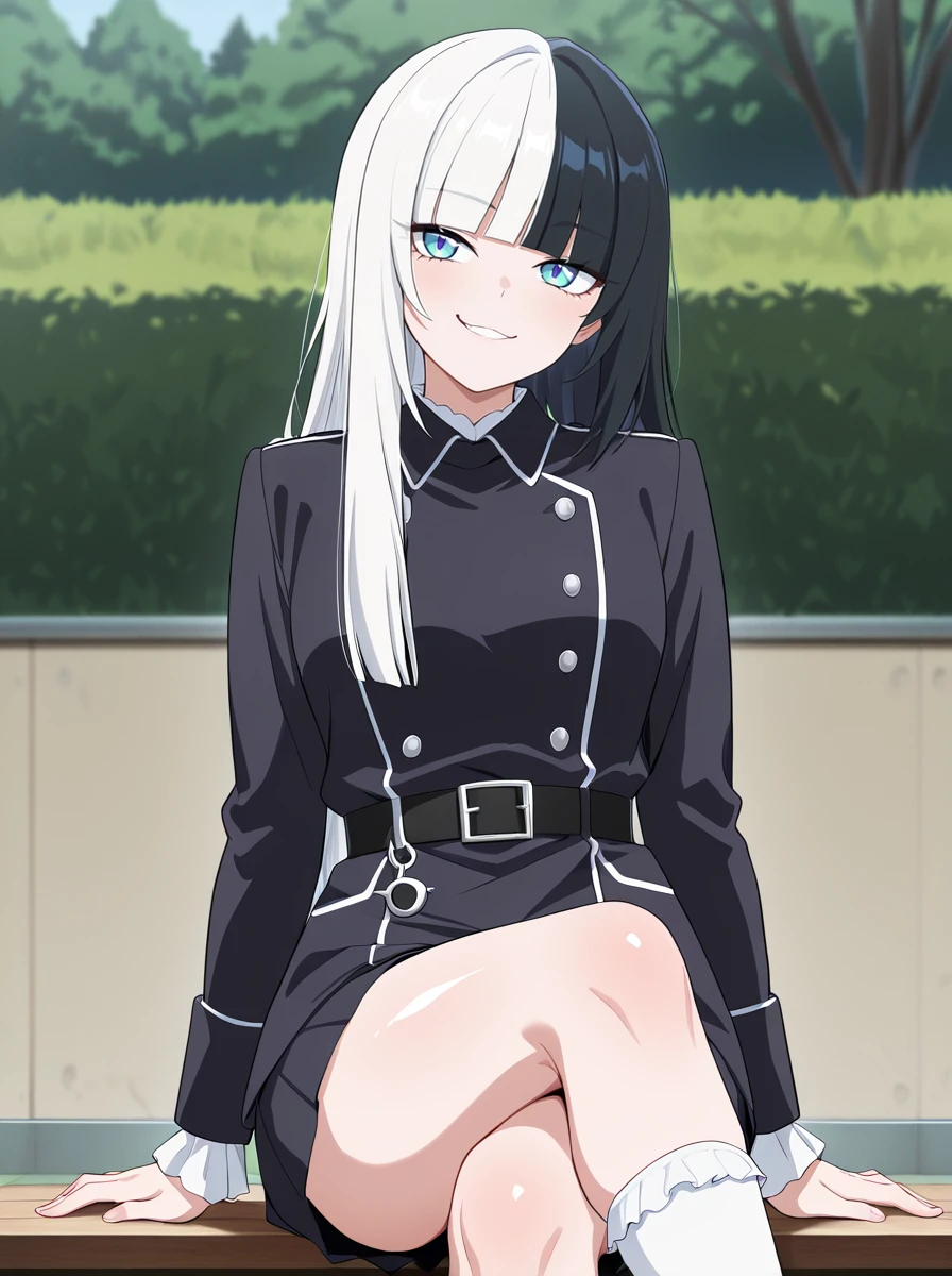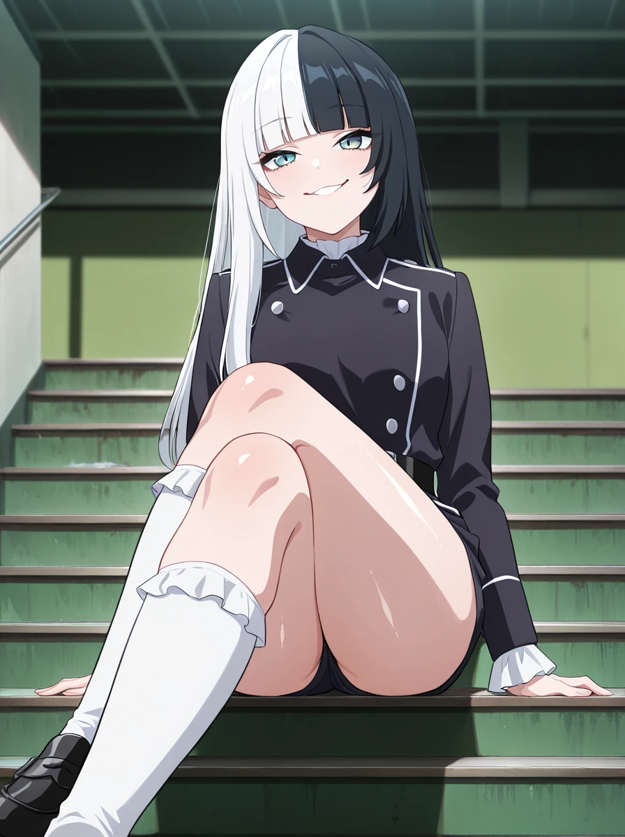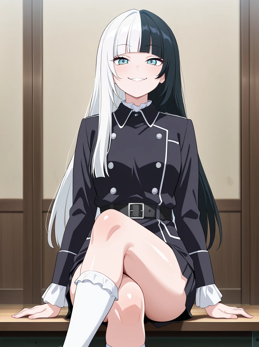 Prompts black hair, multicolored hair, solo, white hair, 1girl, two-tone hair, bangs, long hair, blunt bangs, split-color hair, socks black_shorts belt,