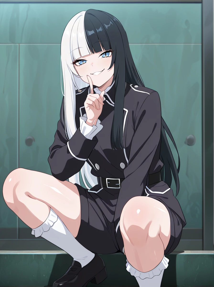 black hair, multicolored hair, solo, white hair, 1girl, two-tone hair, bangs, long hair, blunt bangs, split-color hair, socks black_shorts belt,