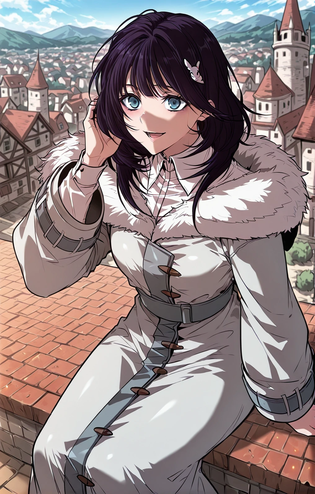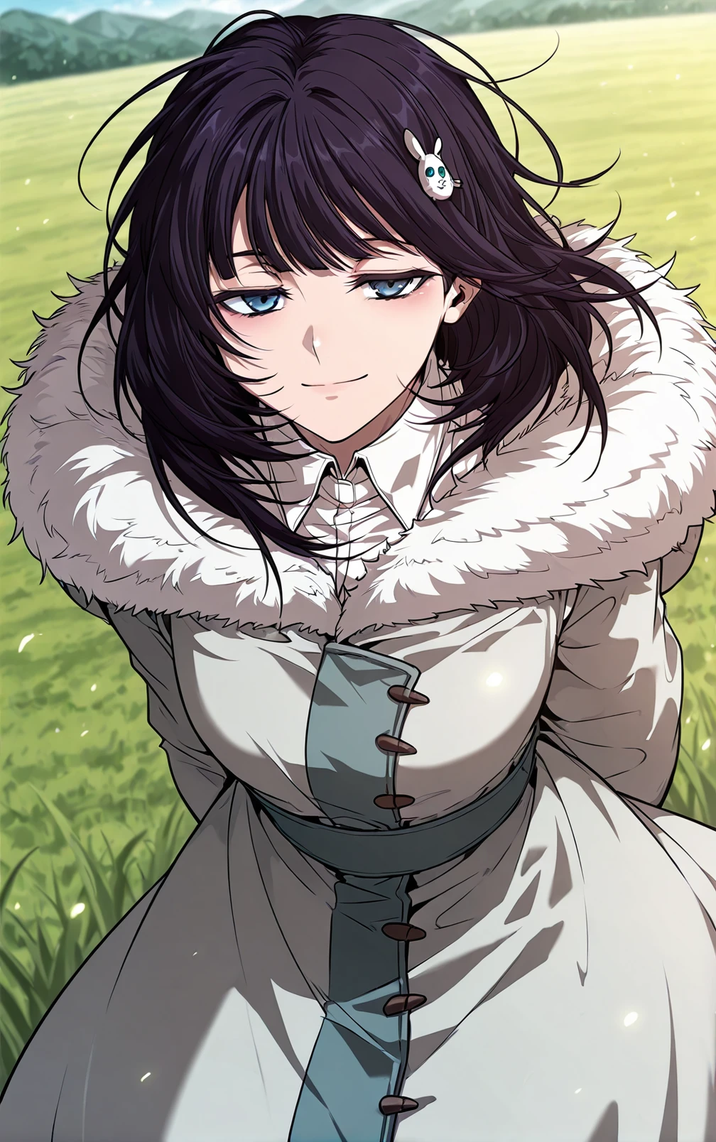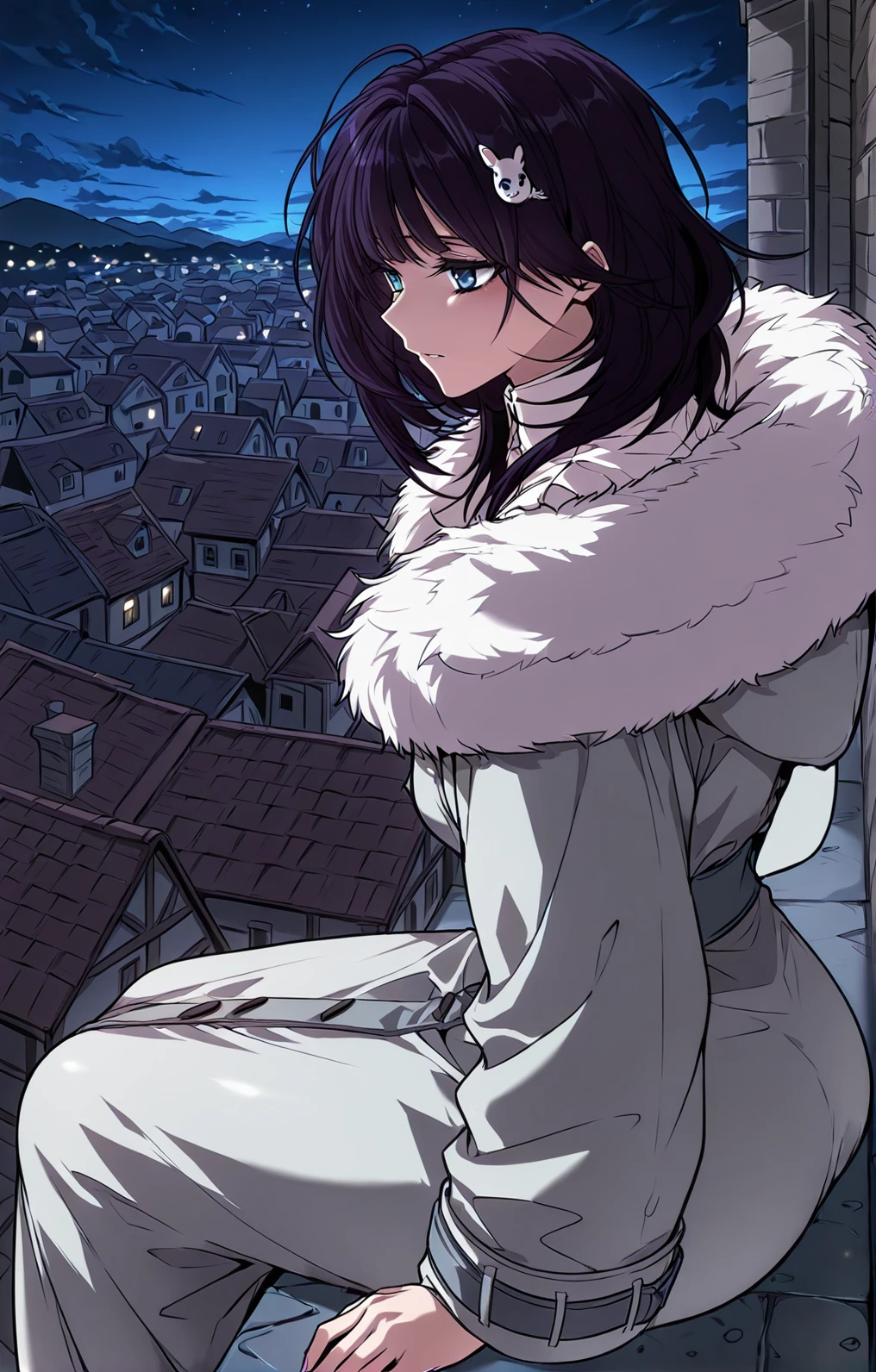 Shannon, 1girl, solo, blue eyes, dark purple hair, medium hair, straight bangs, hair between eyes, messy hair, hair ornament, hair clip,