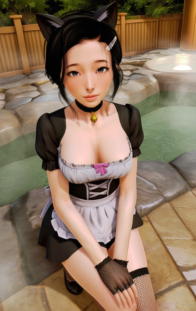 Cat Maid Outfit: MoonCatMaid Outfit, maid, cat ears, black thighhighs, apron, choker, neck bell, fake animal ears, cleavage, fishnets, zettai ryouiki, gloves