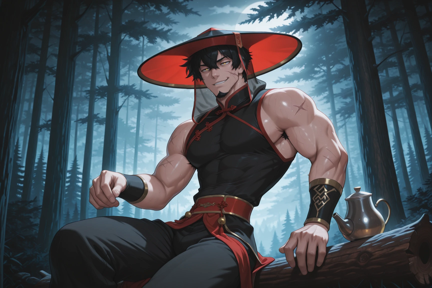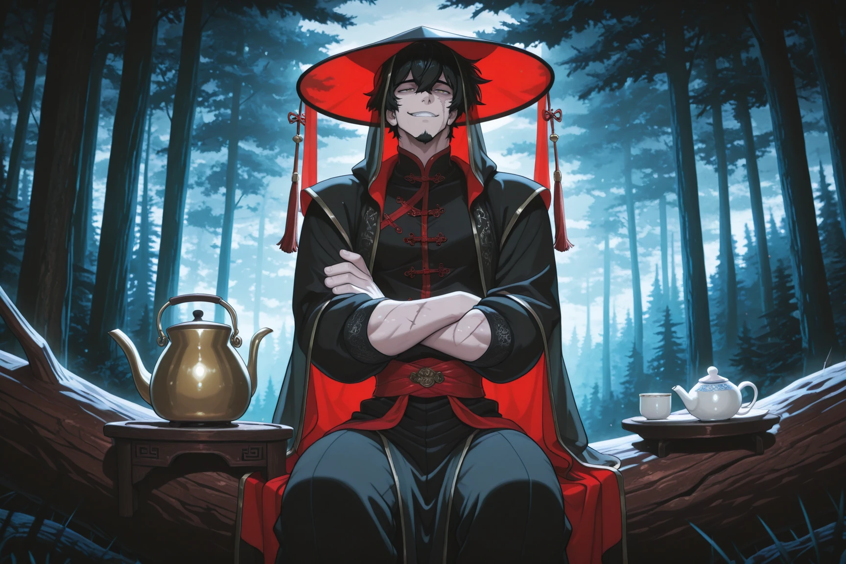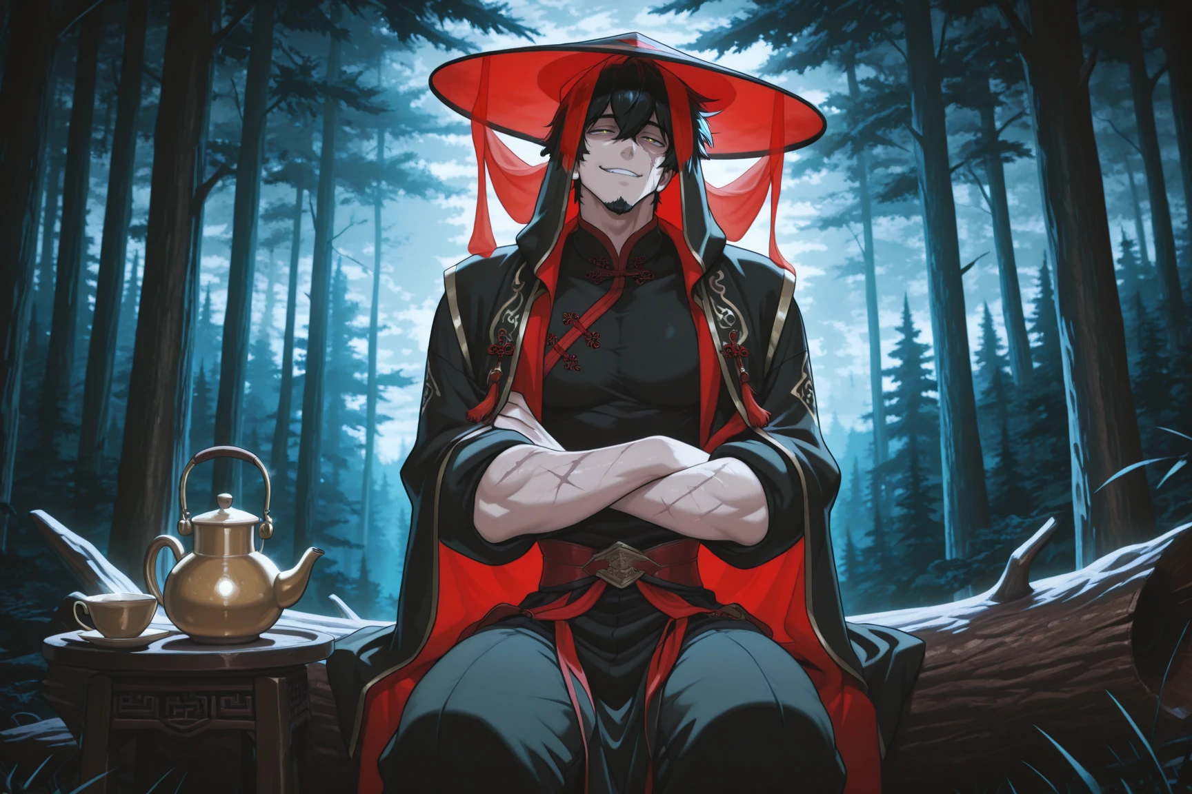 Xia, black hair, scar, hair between eyes, gold eyes, goatee, chinese clothes, transparent veil, wide-brimmed hat
