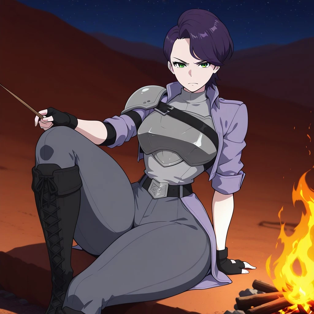 purple trench coat, left sleeve rolled up, asymmetrical sleeves, left elbow pad, black gloves, right fingerless glove, asymmetrical gloves, grey shirt, steel breastplate, black belt with a silver buckle, steel shoulder armor, asymmetrical shoulder armor, shoulder belt, high coat collar, dark grey pants, black knee boots, lace-up boots,