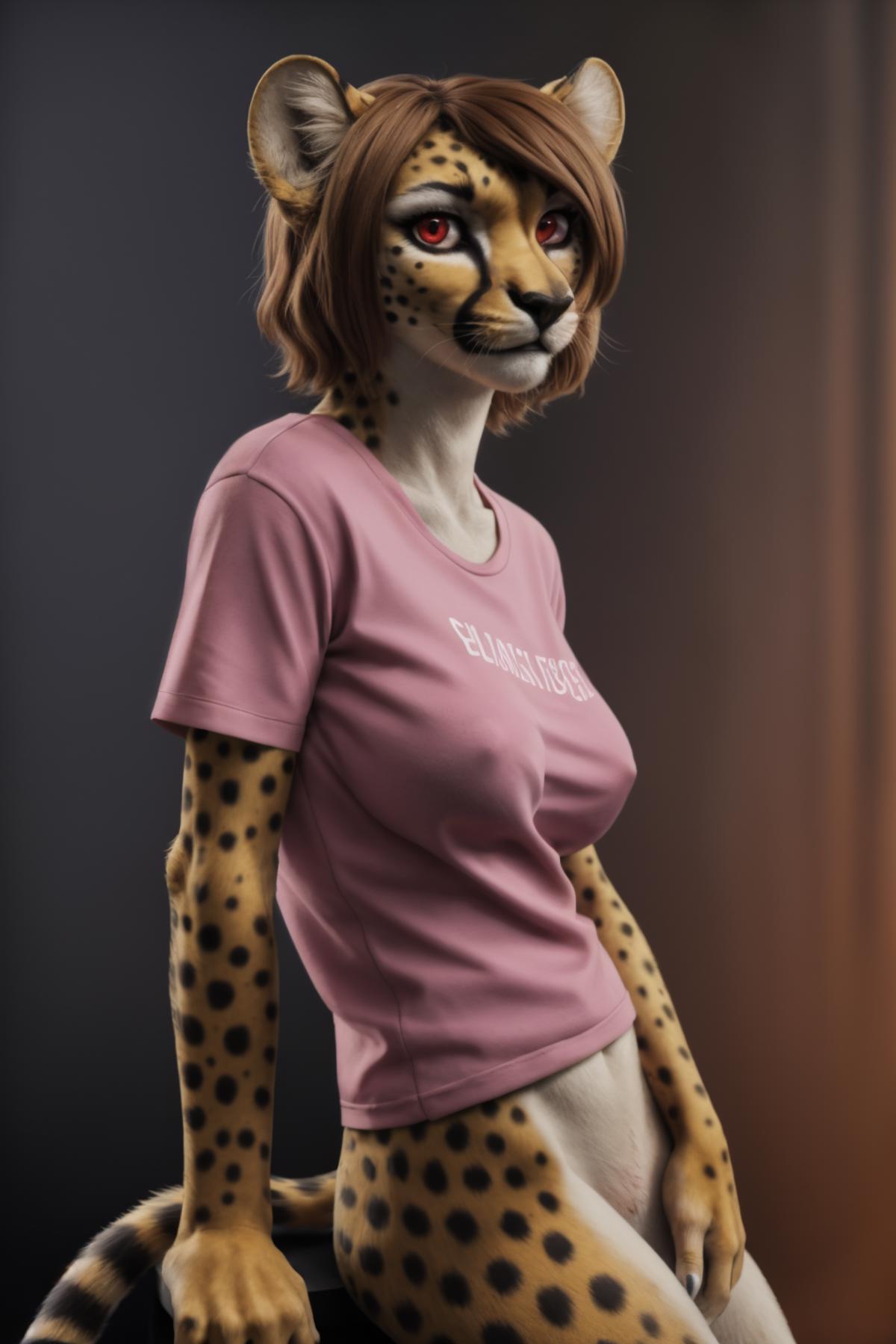 BruteCheetah, animal ears, body fur, breast, brown hair, claws, navel, nude, red eyes, short hair, tail