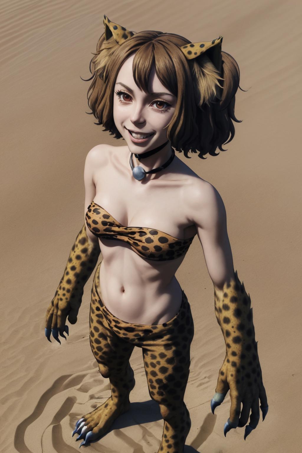 EruzaNakanishi, animal ears, animal hands, animal print, brown hair, claws, midriff, monster girl, navel, red eyes, sharp teeth, short hair, tailFull cheetah form :