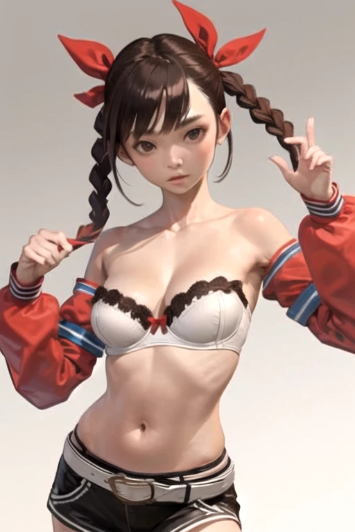 AigleRumble, 1girl, solo, twin braids, long hair, brown hair, short shorts, navel, strapless bra, midriff, detached sleeves, long sleeves, brown eyes, black shorts, white bra, medium breasts, cleavage, belt, bow, twintails, micro shorts