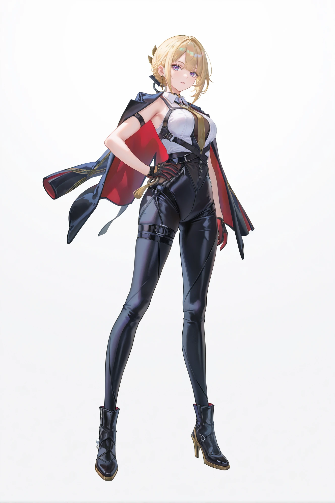 Evelyn \(zenless zone zero\), clothes: def Evelyn clothes, Evelyn jacket, 1girl, gloves, blonde hair, necktie, short hair, black pants, black footwear