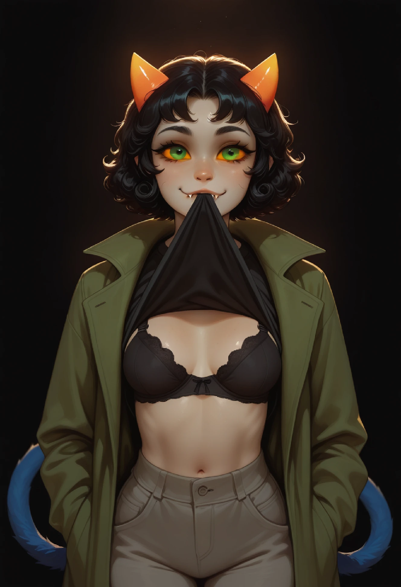 nepeta leijon horns colored skin black hair colored sclera yellow sclera short hair grey skin cat tail blue tail green coat green eyes gray_pants leo symbol shirt black_shirt