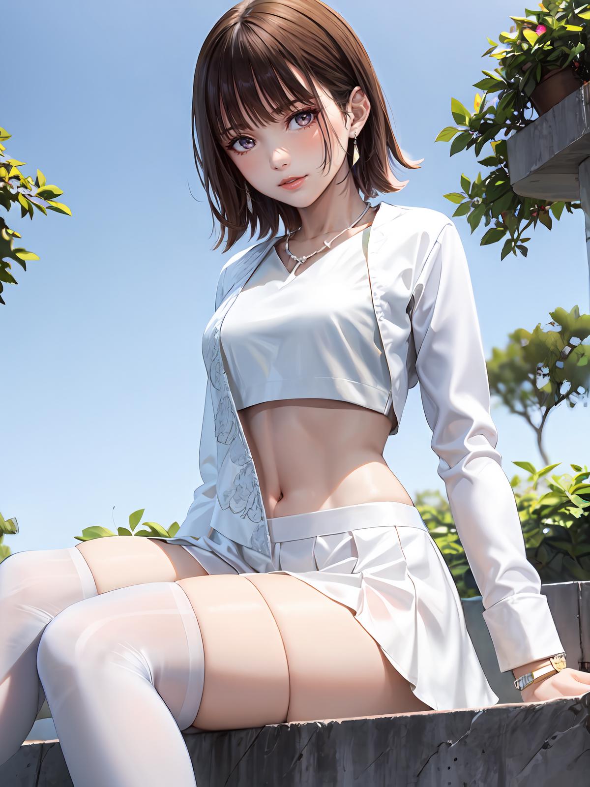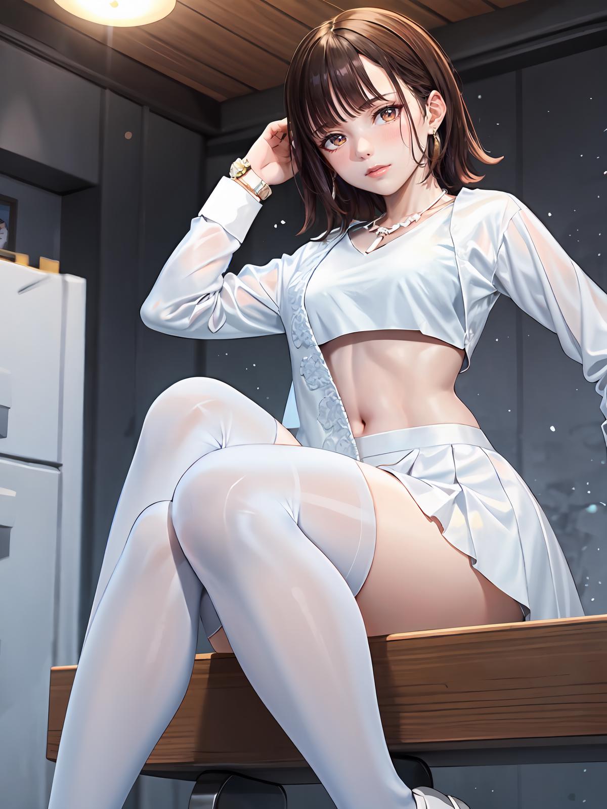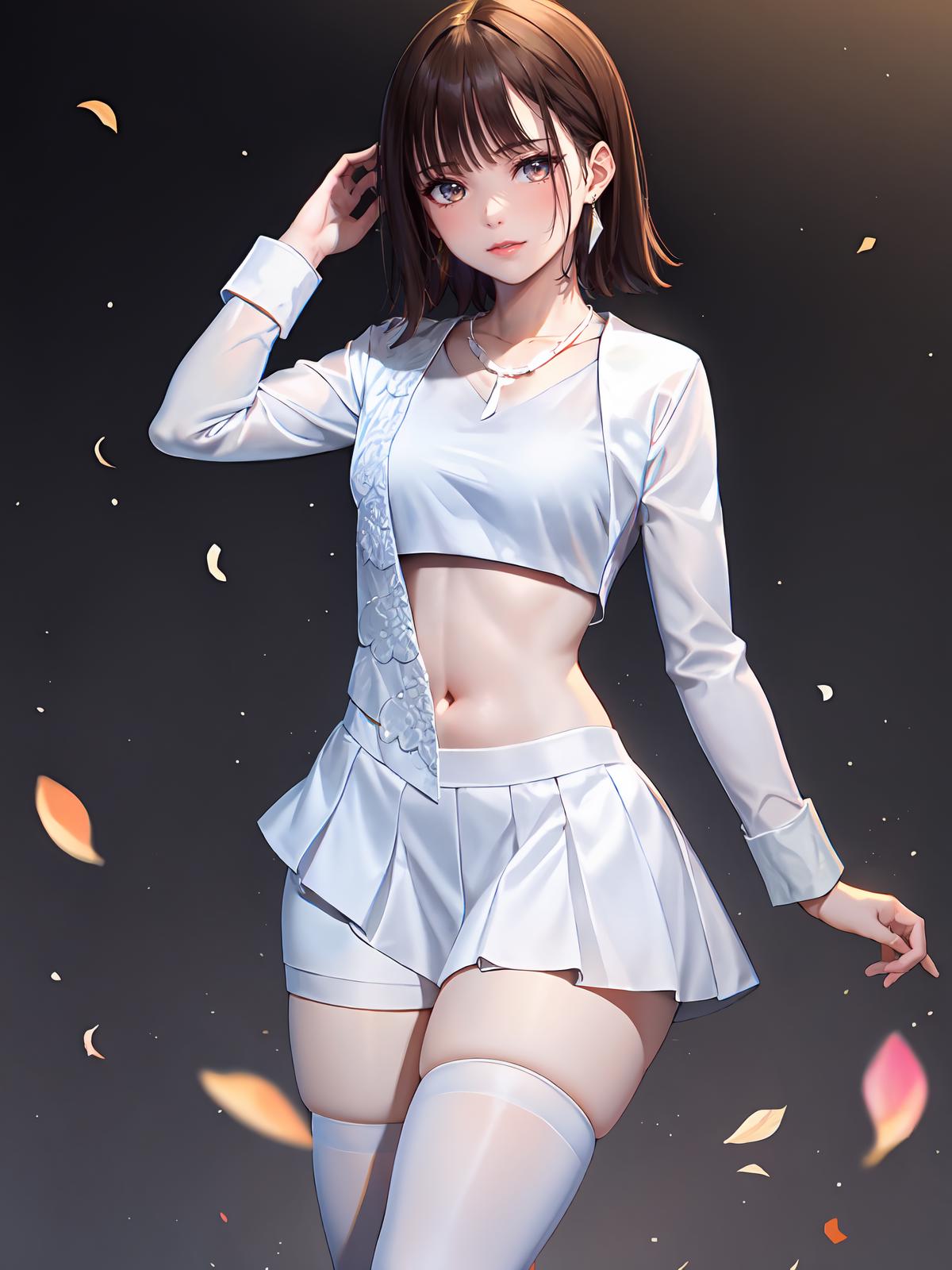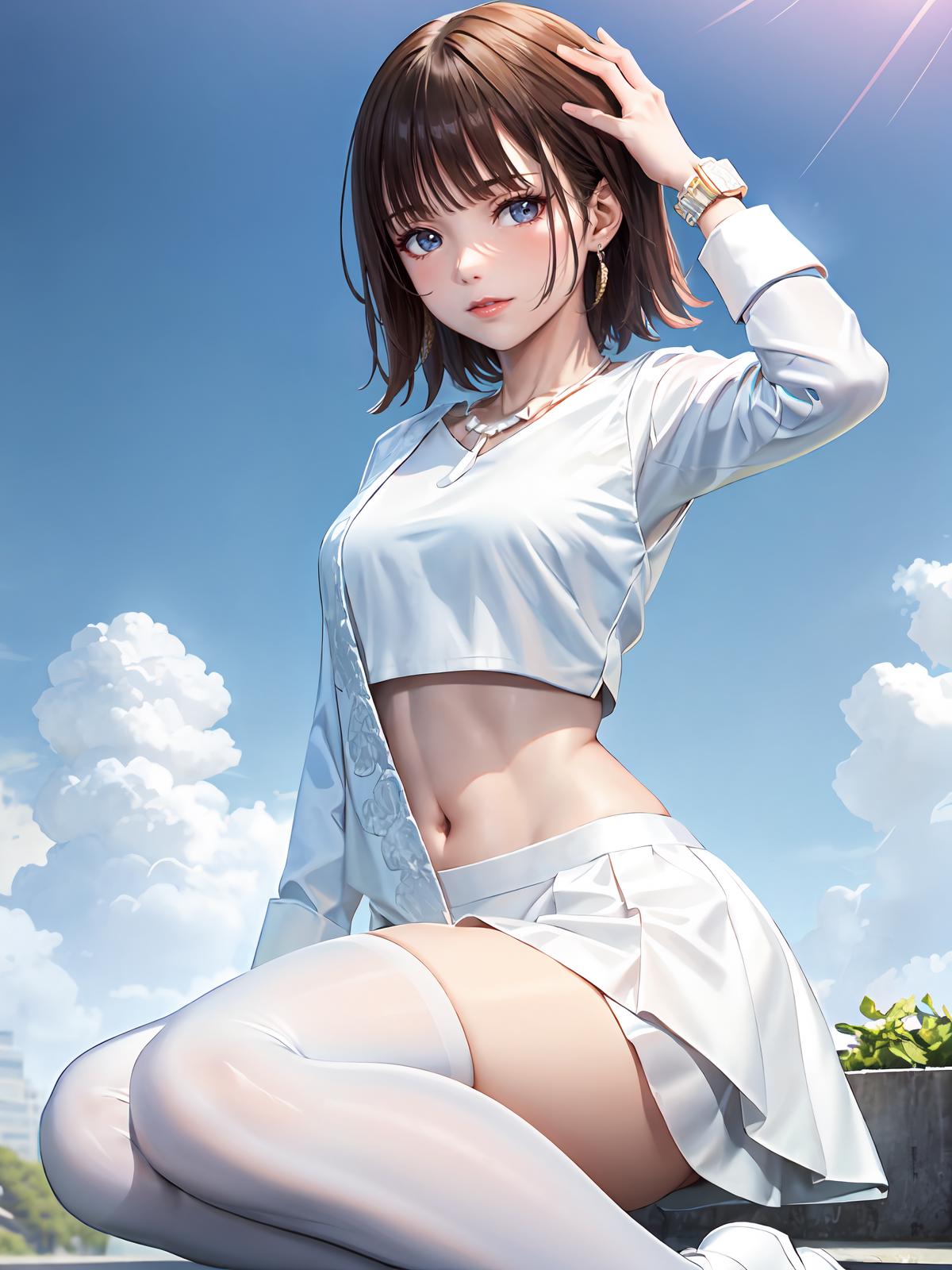 Prompts: , white short,shorts,miniskirt,bracelet,white jacket, white footwear,long sleeves,navel,midriff,crop top, white skirt, white shirt,necklace,jewelry, thighhighs ,earrings,skirt