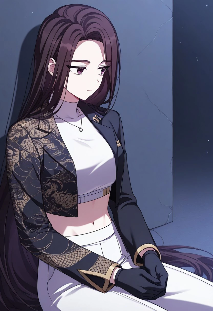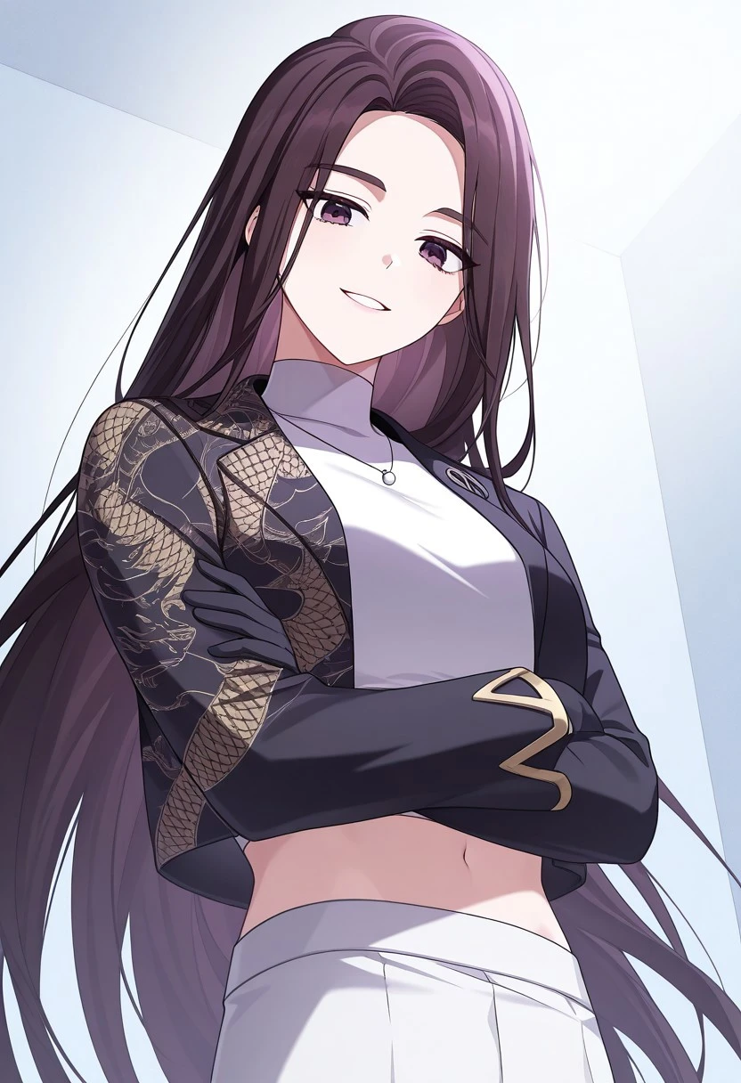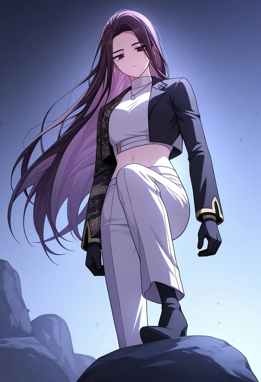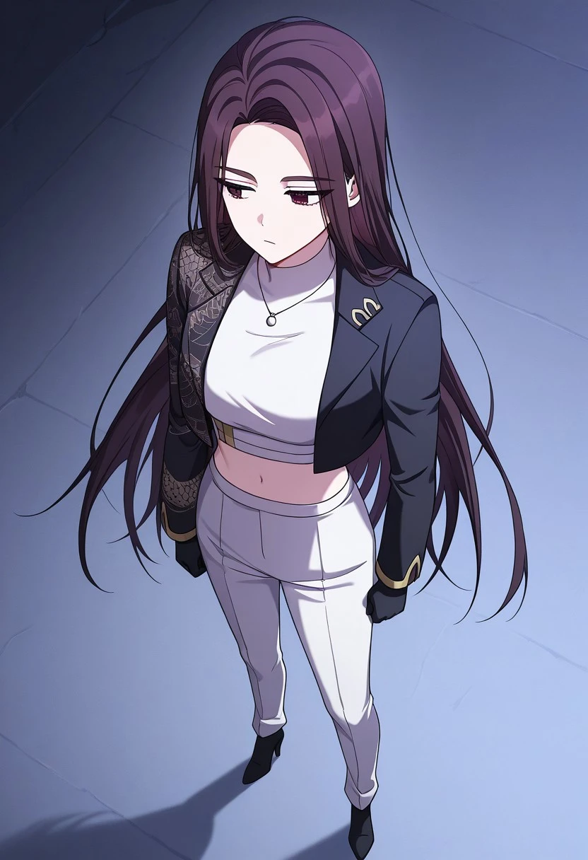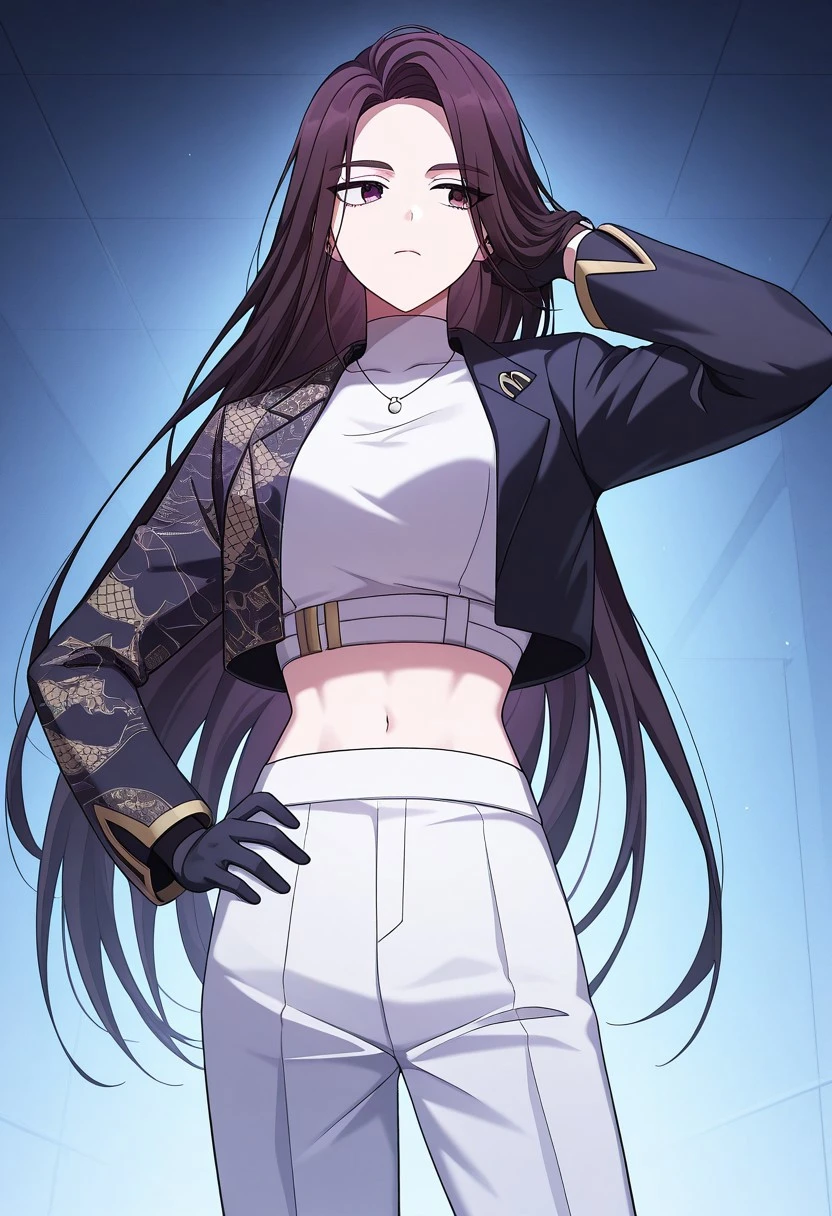 dragon jacket, long sleeves, white turtleneck, white pants, jewelry, necklace, midriff, navel, black gloves, black footwear, high heels