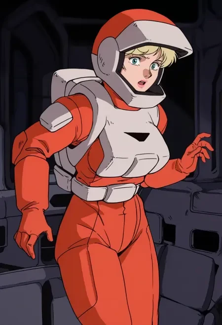 VGundamMyraSpacesuit, 1girl, blonde hair, bangs, green eyes, lipstick, aged up,