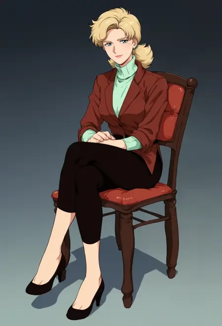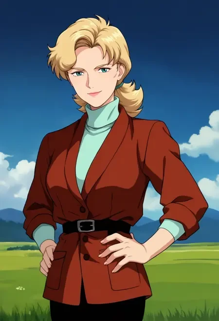 VGundamMyraMiggell, 1girl, blonde hair, low ponytail, green eyes, lipstick, aged up,