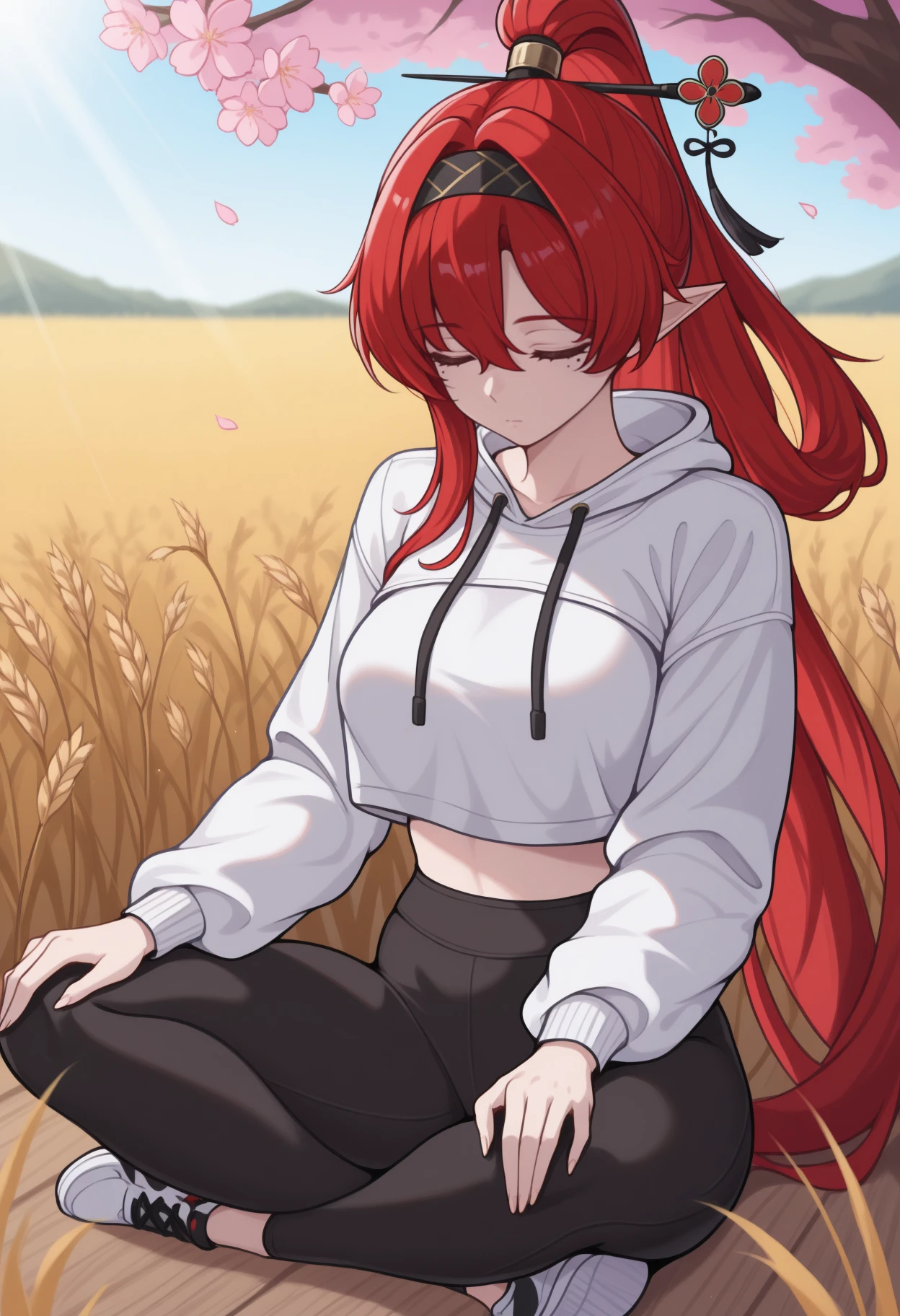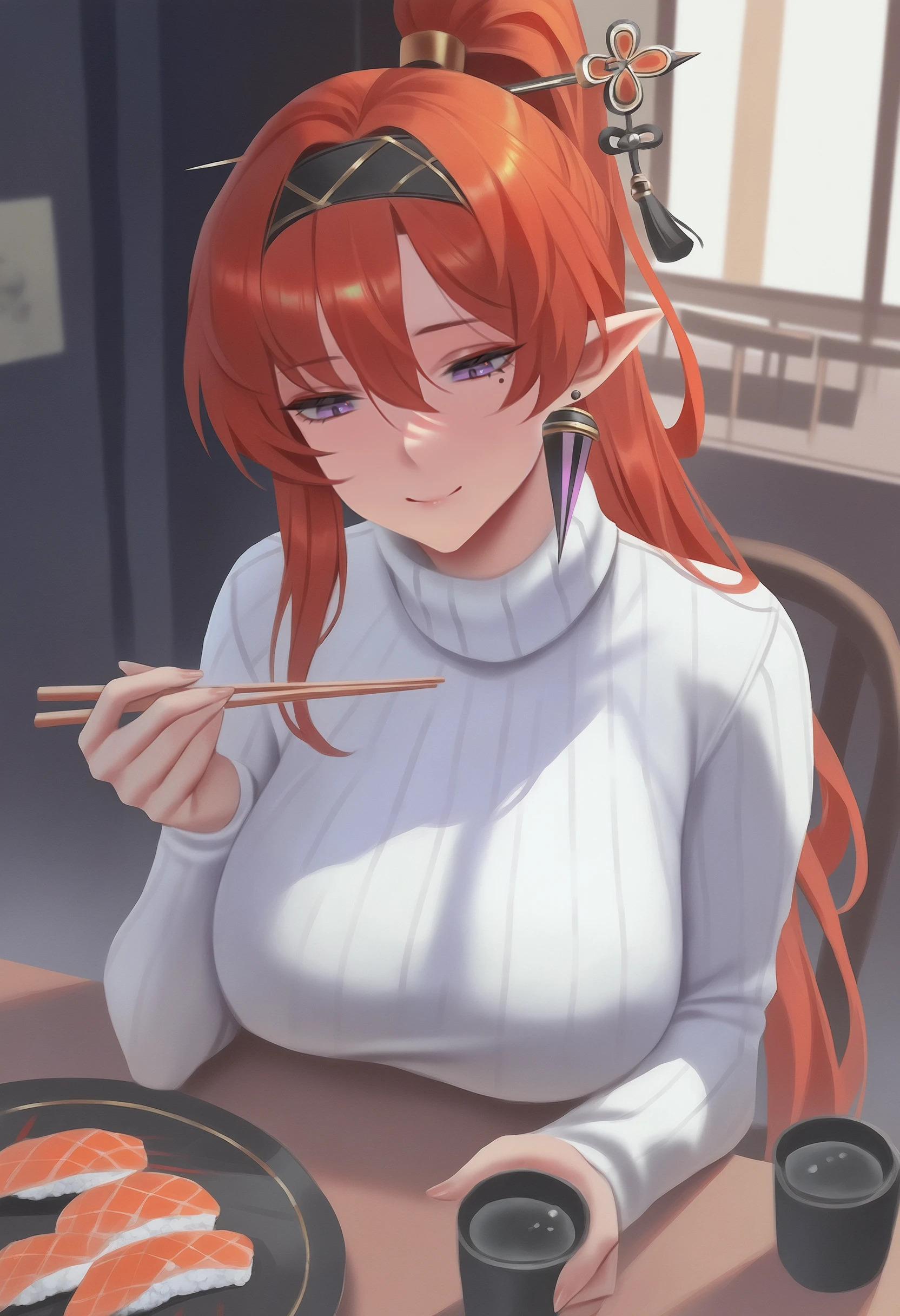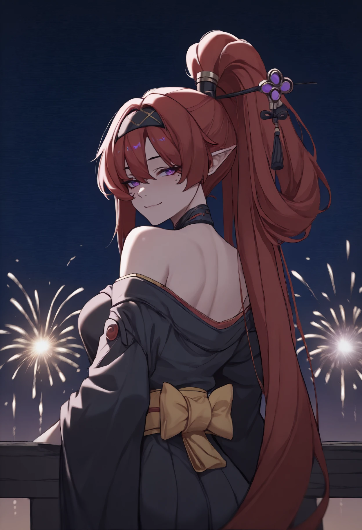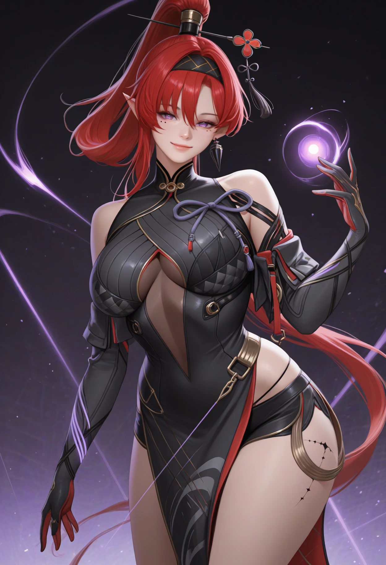 Trigger + Appearance: yinl1n, mole under eye, leg tattoo, long hair, red hair, hair between eyes, ponytail, hair stick, black hairband, pointy ears, purple eyes, large breasts