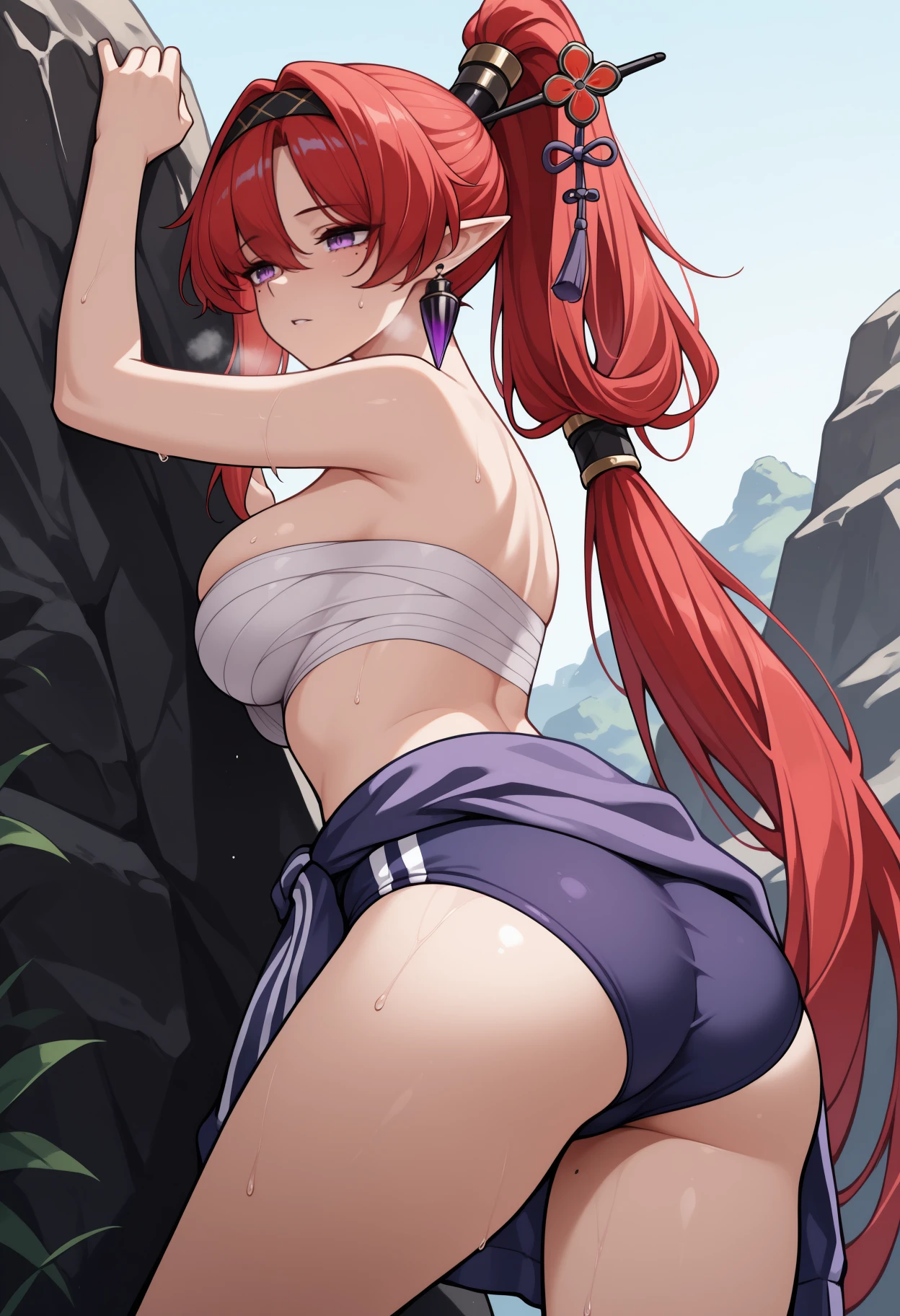 yinl1n, mole under eye, leg tattoo, long hair, red hair, hair between eyes, ponytail, hair stick, black hairband, pointy ears, purple eyes, large breasts