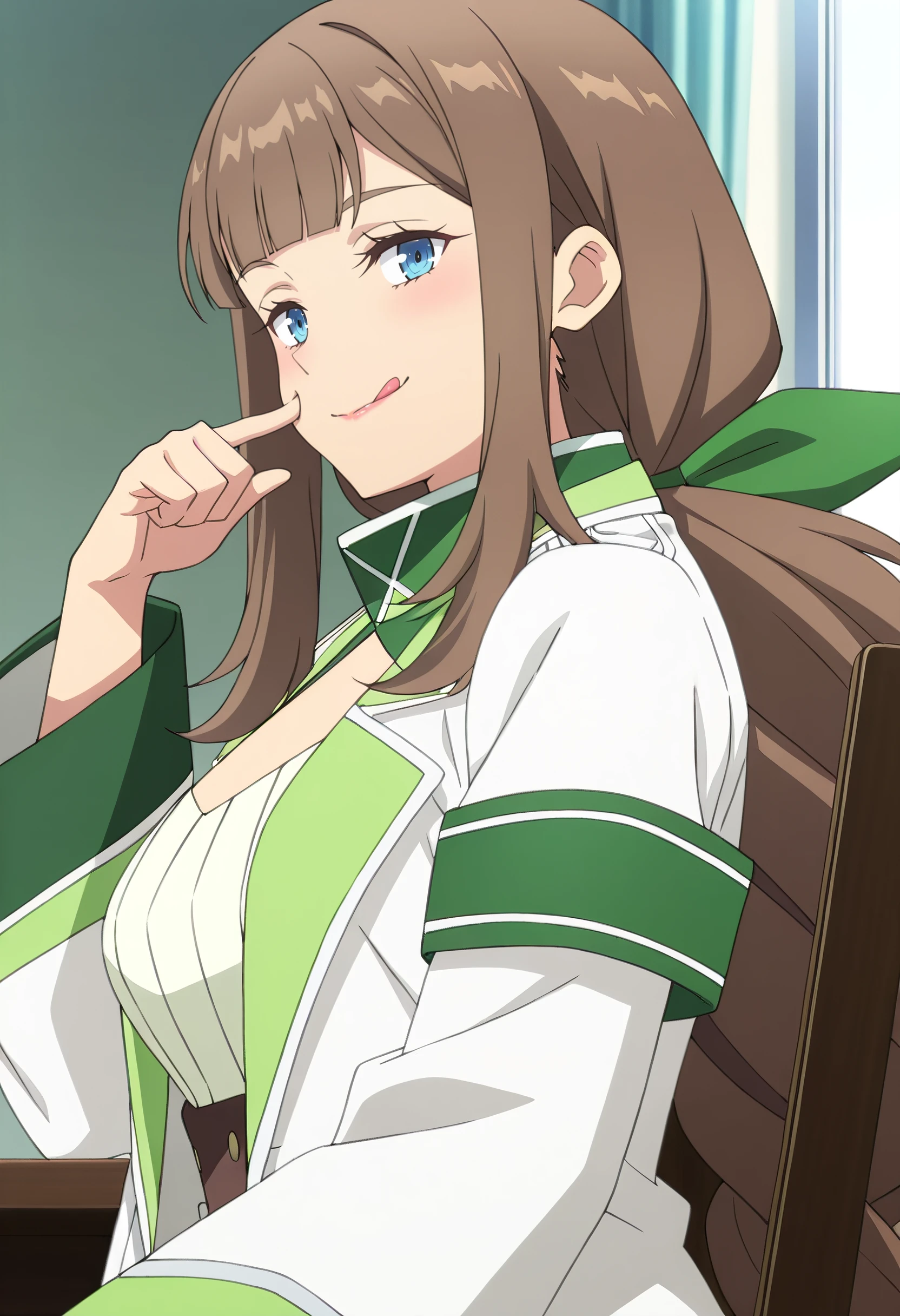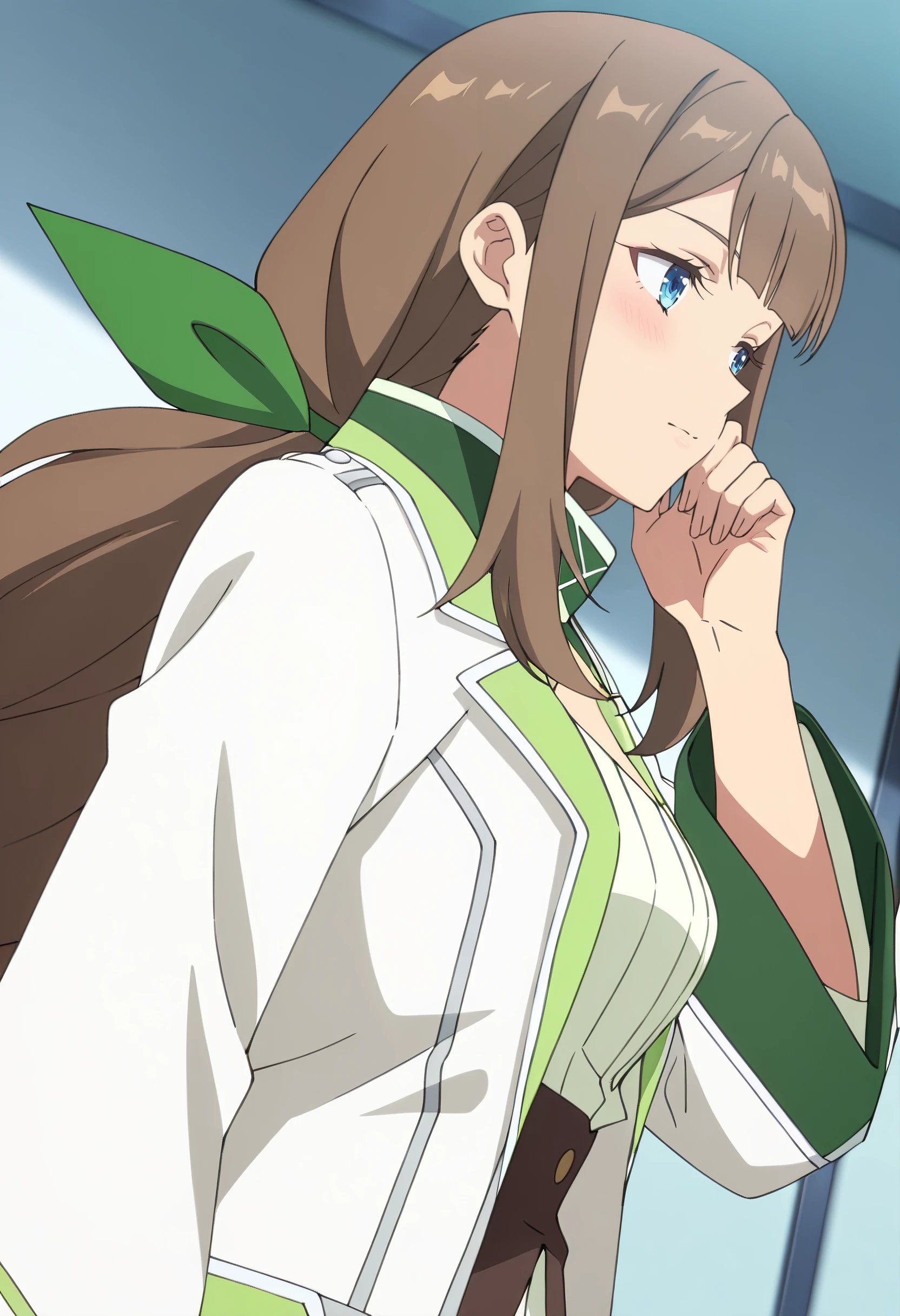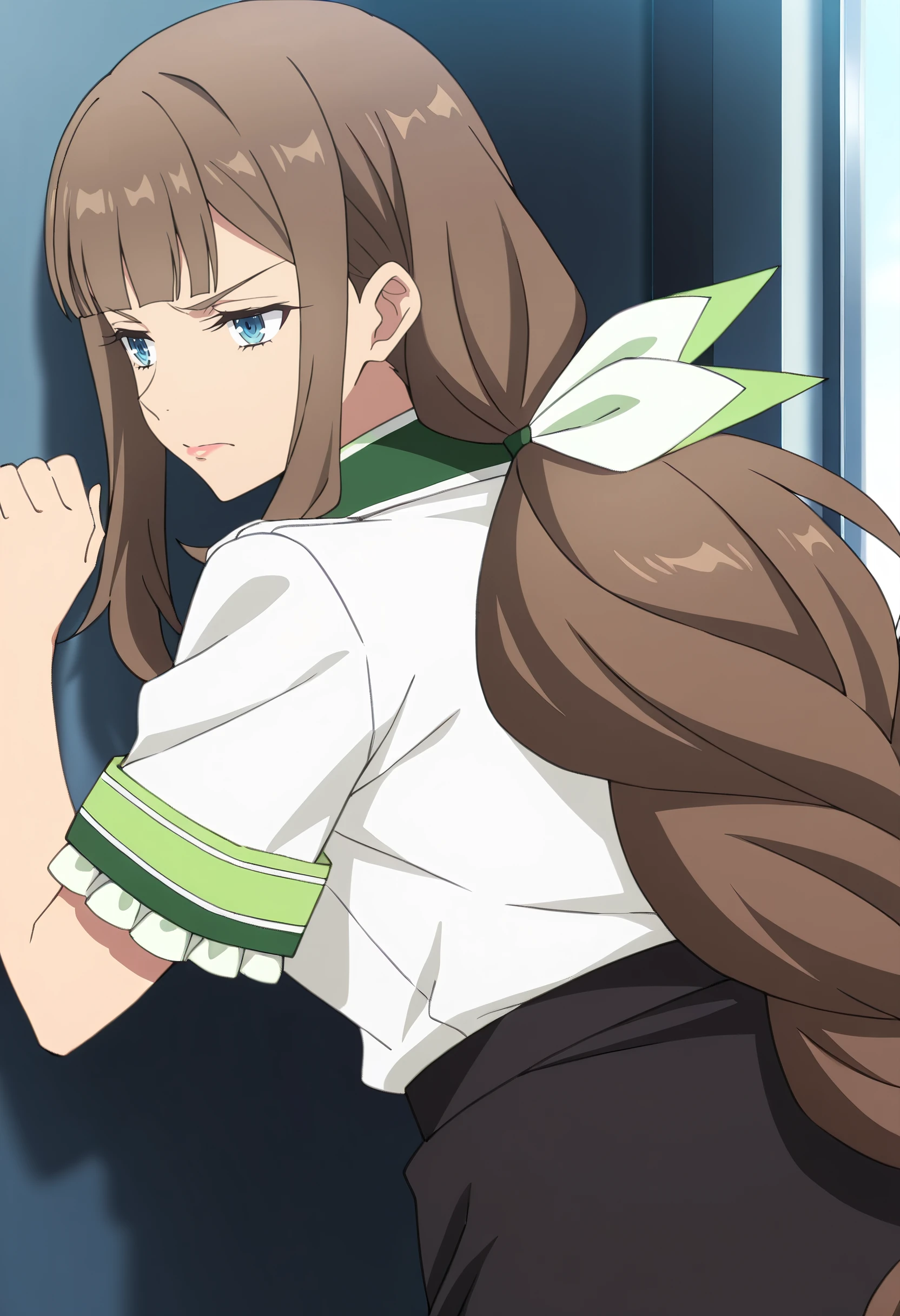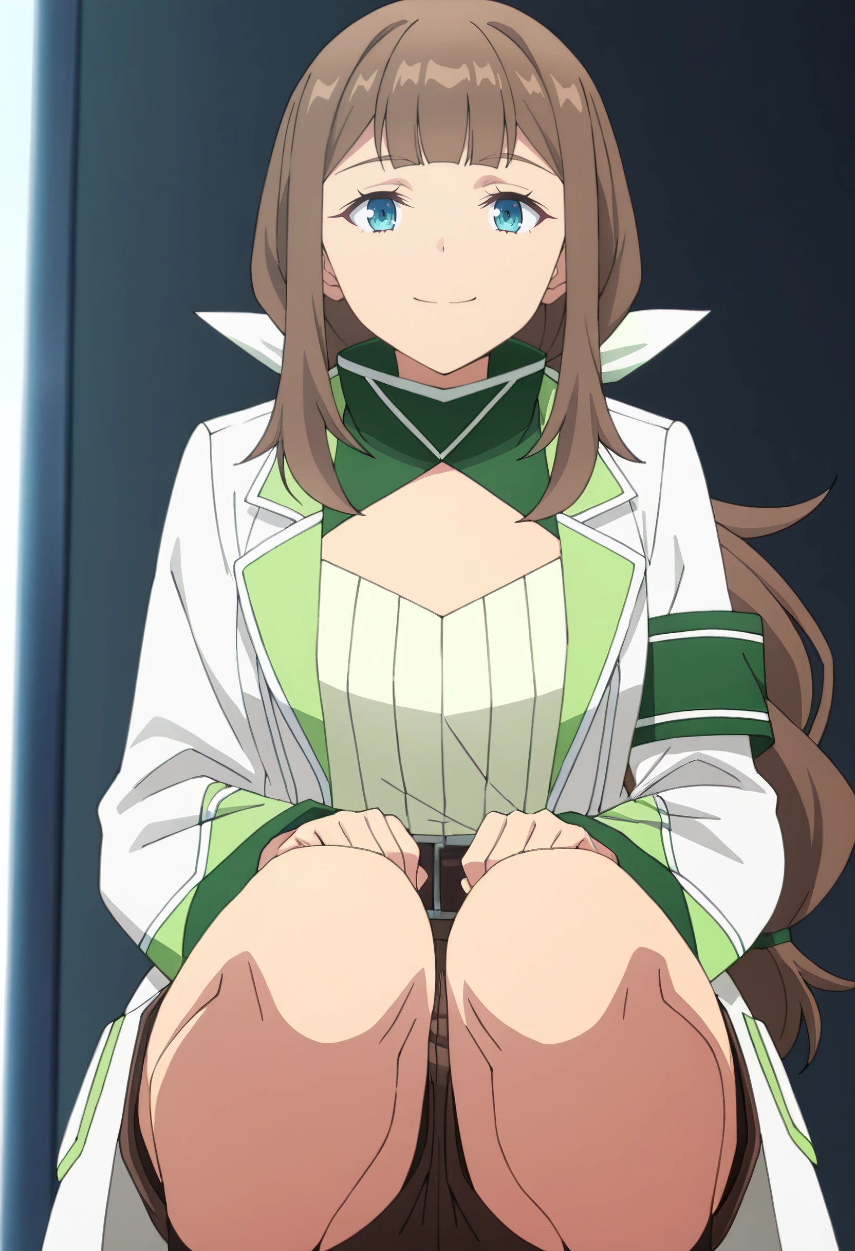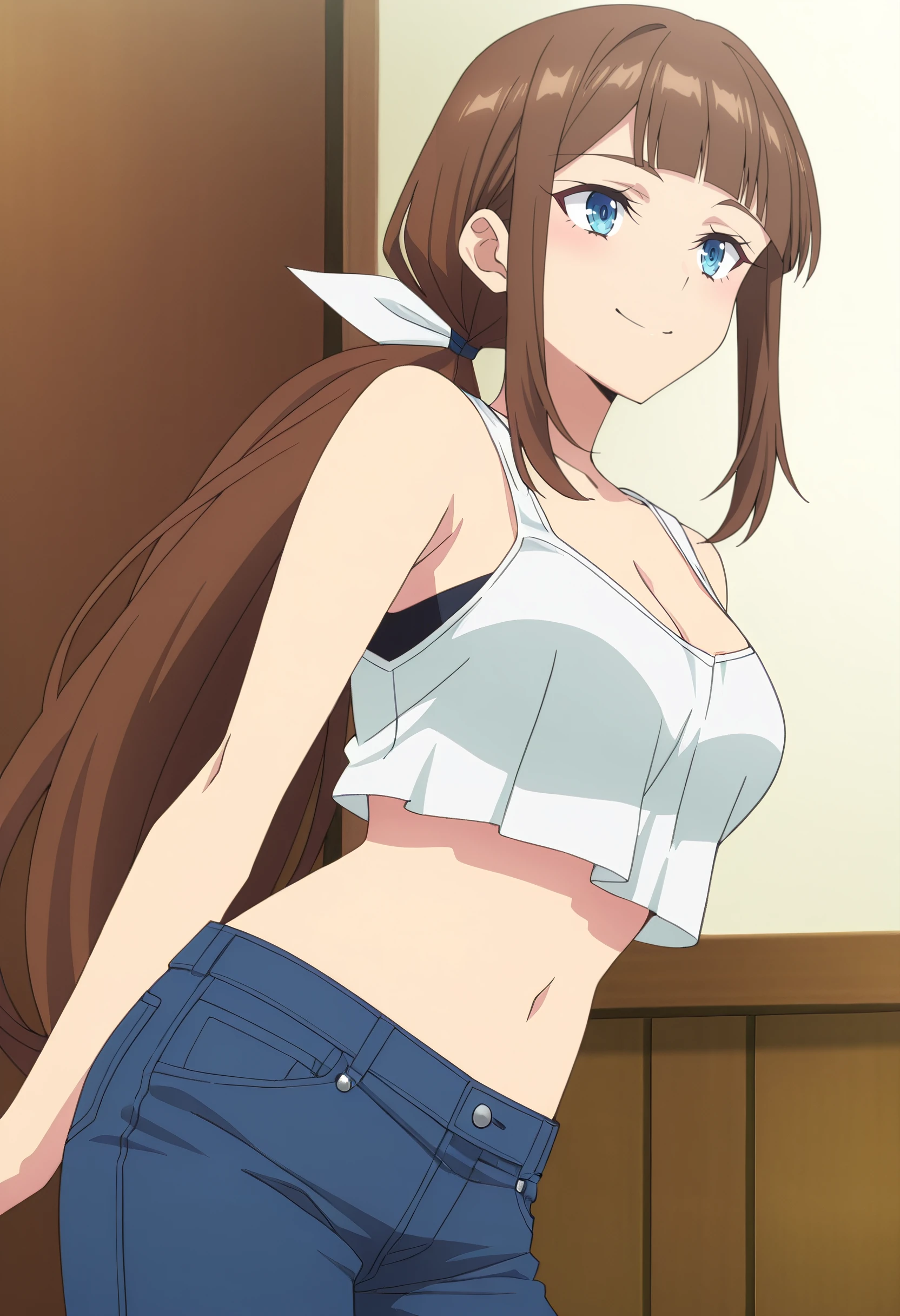 GirShelley, long hair, bangs, brown hair, blue eyes, sidelocks, blunt bangs, eyebrows visible through hair, low ponytail, ponytail,