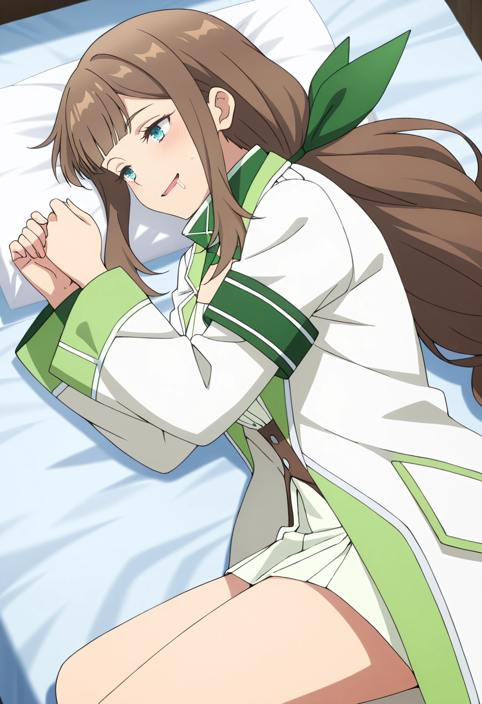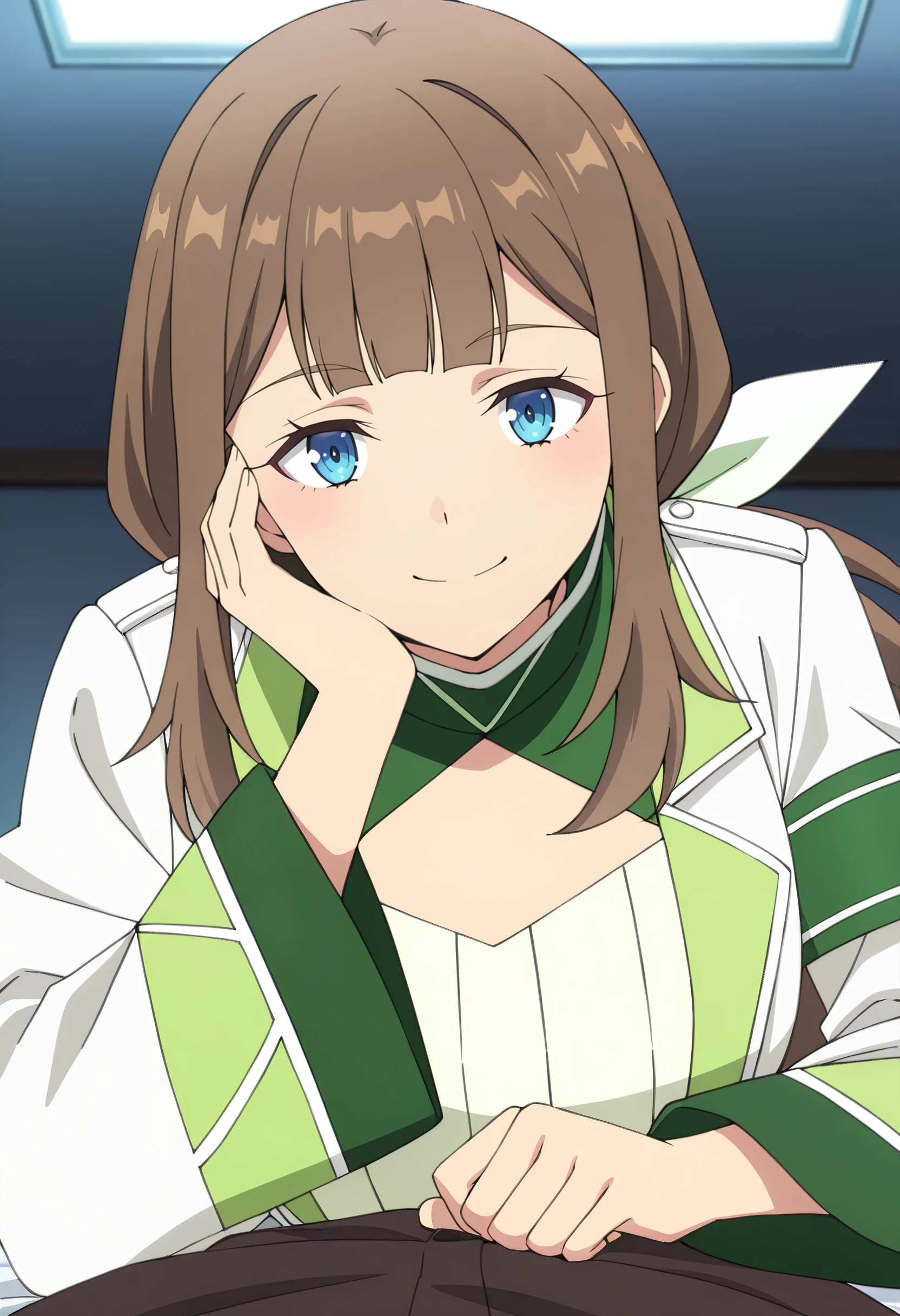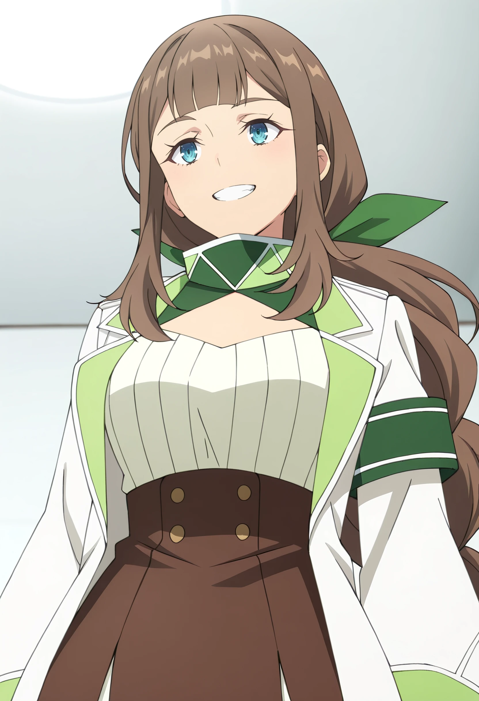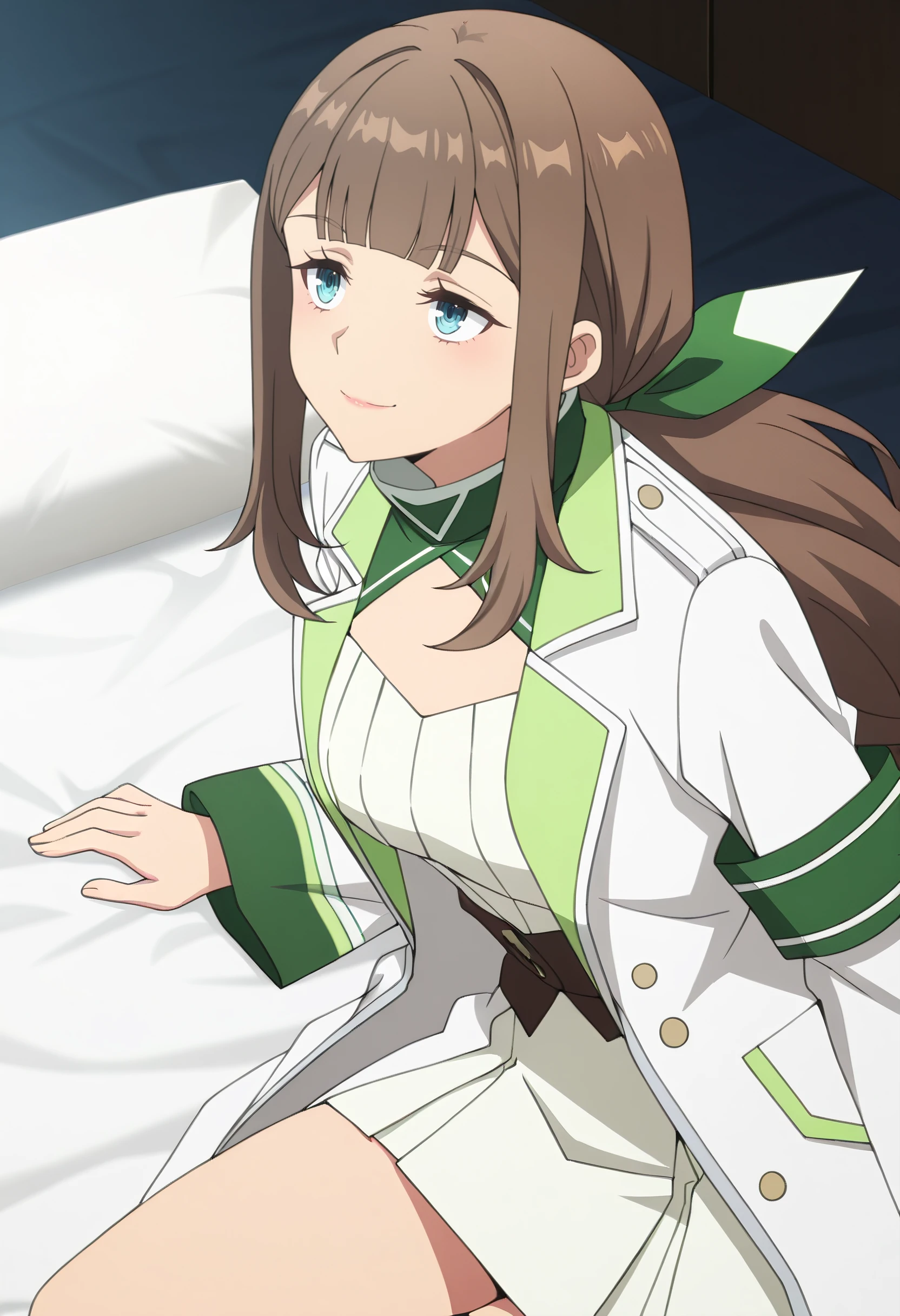 long sleeves, ribbon, jacket, serafuku, sailor collar, shirt, hair bow, turtleneck, green bow, skirt, white shirt, green neckerchief, wide sleeves, white jacket,