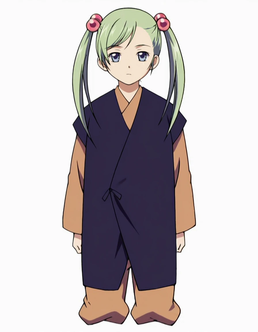 sh0k4tsury0uk0um31, 1girl, long hair, twintails, green hair, hair bobbles, blue eyes, japanese clothes, vest, blue vest, shirt, brown shirt, flat chest, pants, brown pants