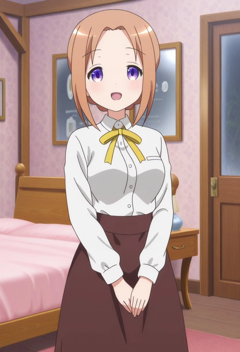hoto mocha gochiusa movie1 my dear sister hot bakery waitress outfit, neck ribbon, yellow ribbon, dress shirt, collared shirt, white shirt, long sleeves, shirt tucked in, long skirt, brown skirt,