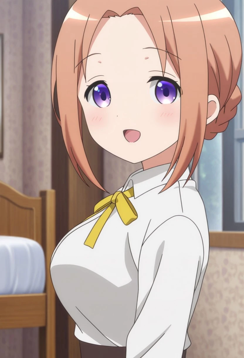 hoto chiyoko gochiusa anime style, braided bun, single hair bun, brown hair, purple eyes, medium breasts,