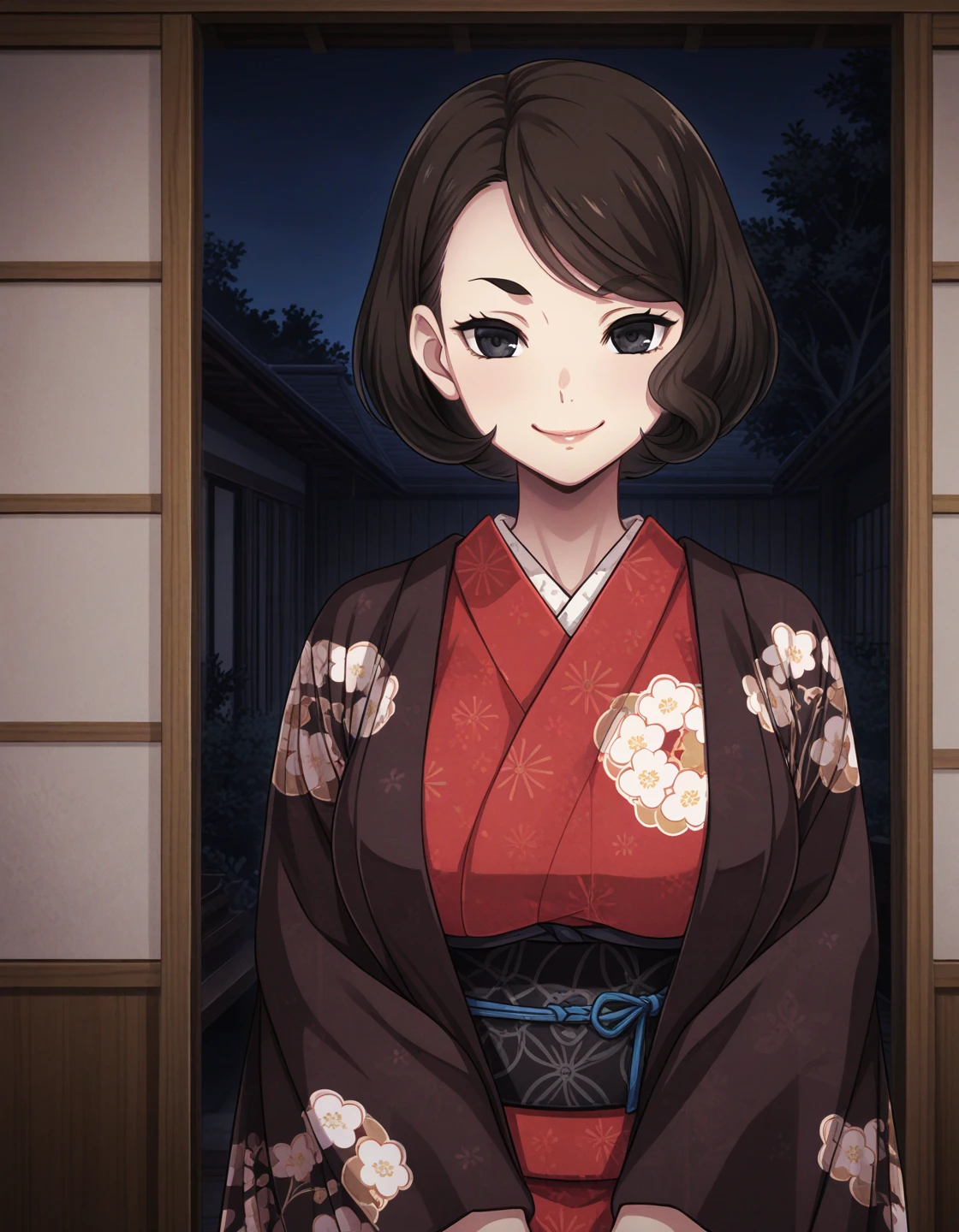 ajiki yachiyo, HS_1, brown hair, short hair, swept bangs, black eyes, lips, red kimono, pattern kimono, dark brown haori, black obi