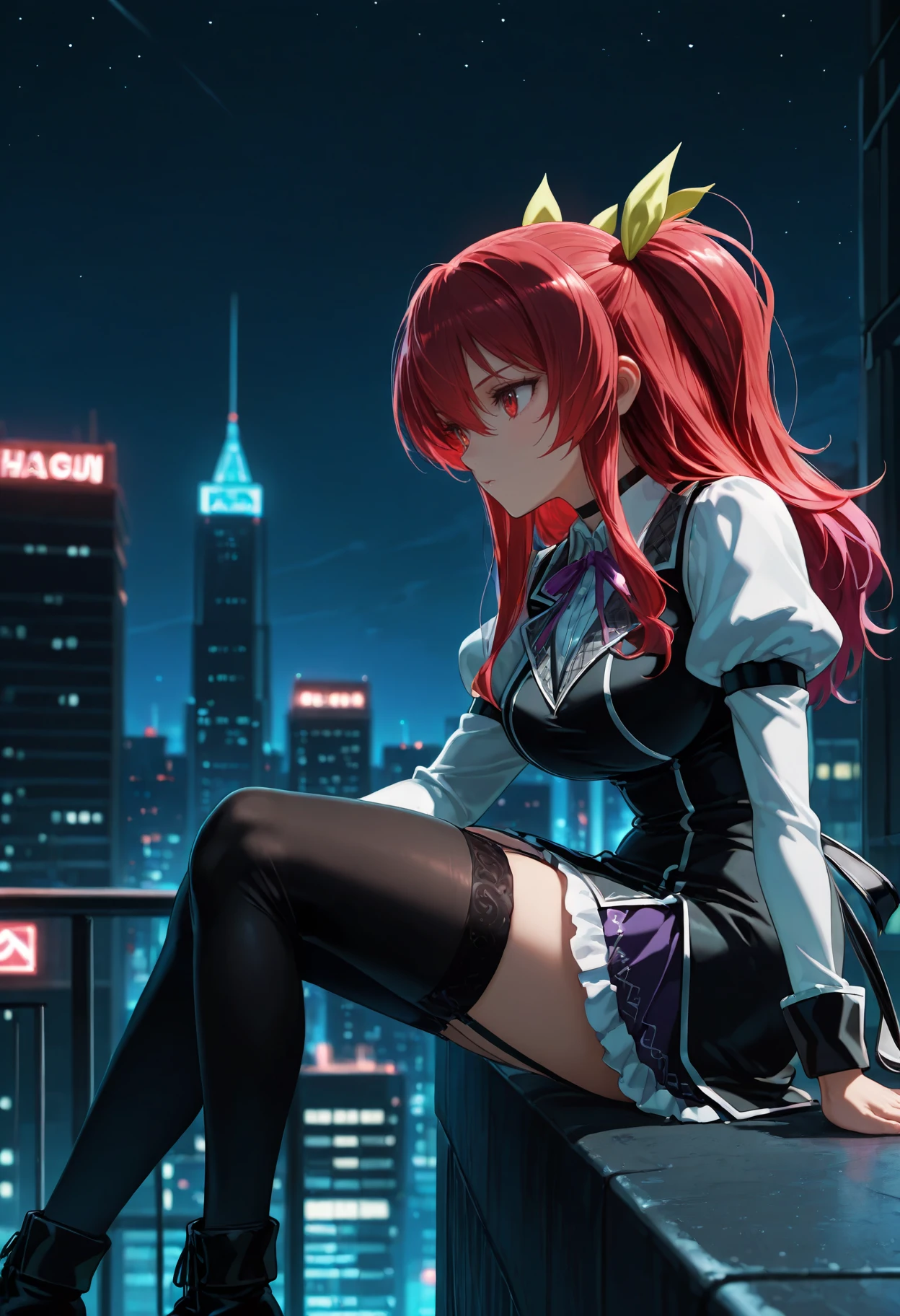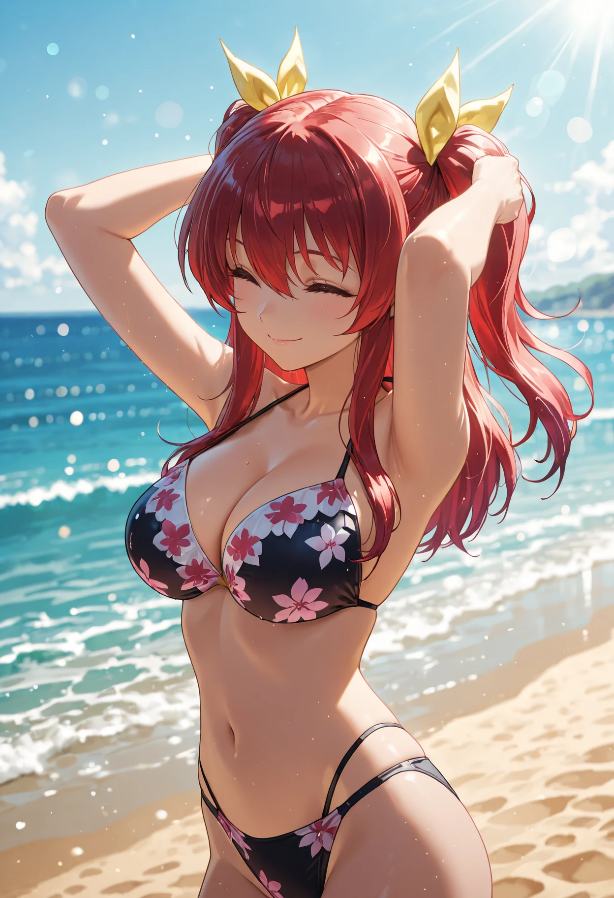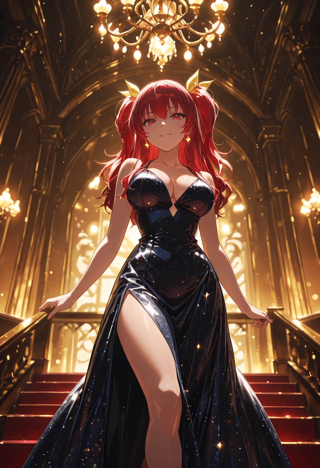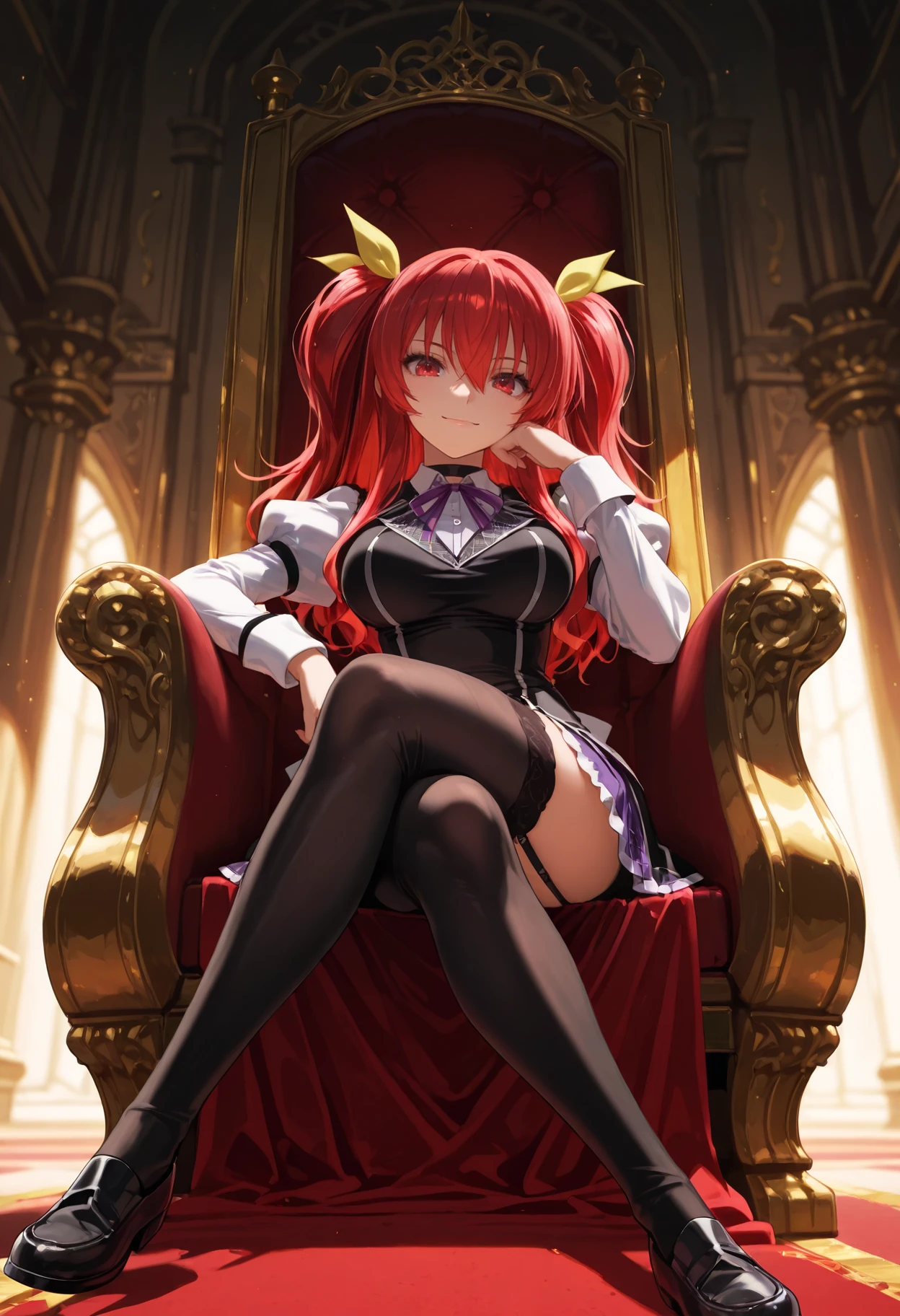 stellavermillionxl, red eyes, red hair, two side up, long hair, twintails, hair between eyes, long sidelocks, hair bow, yellow bow,