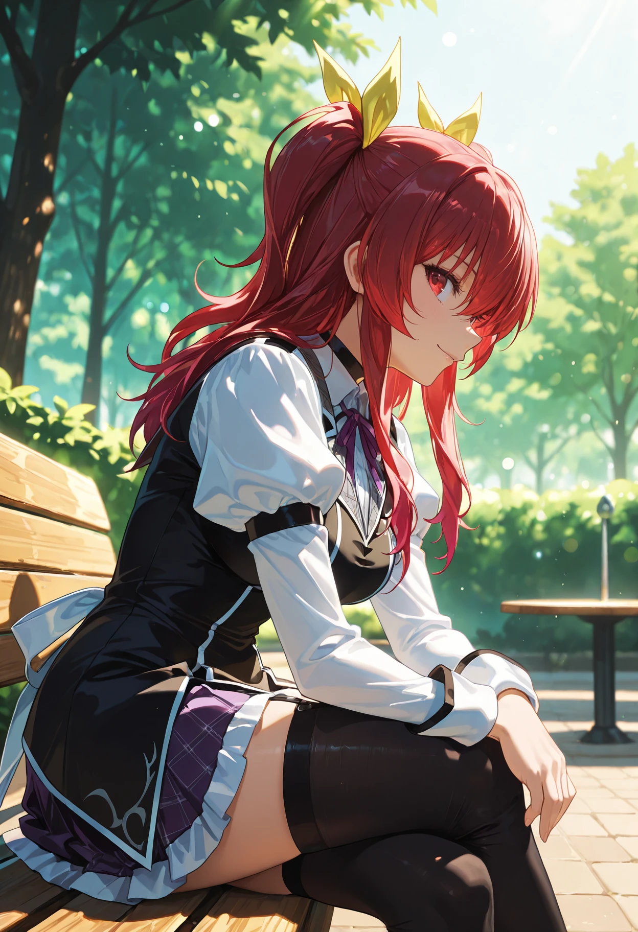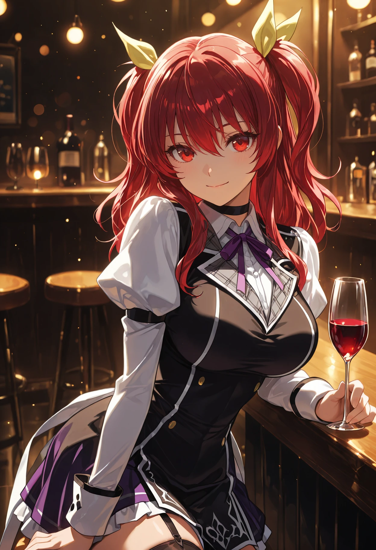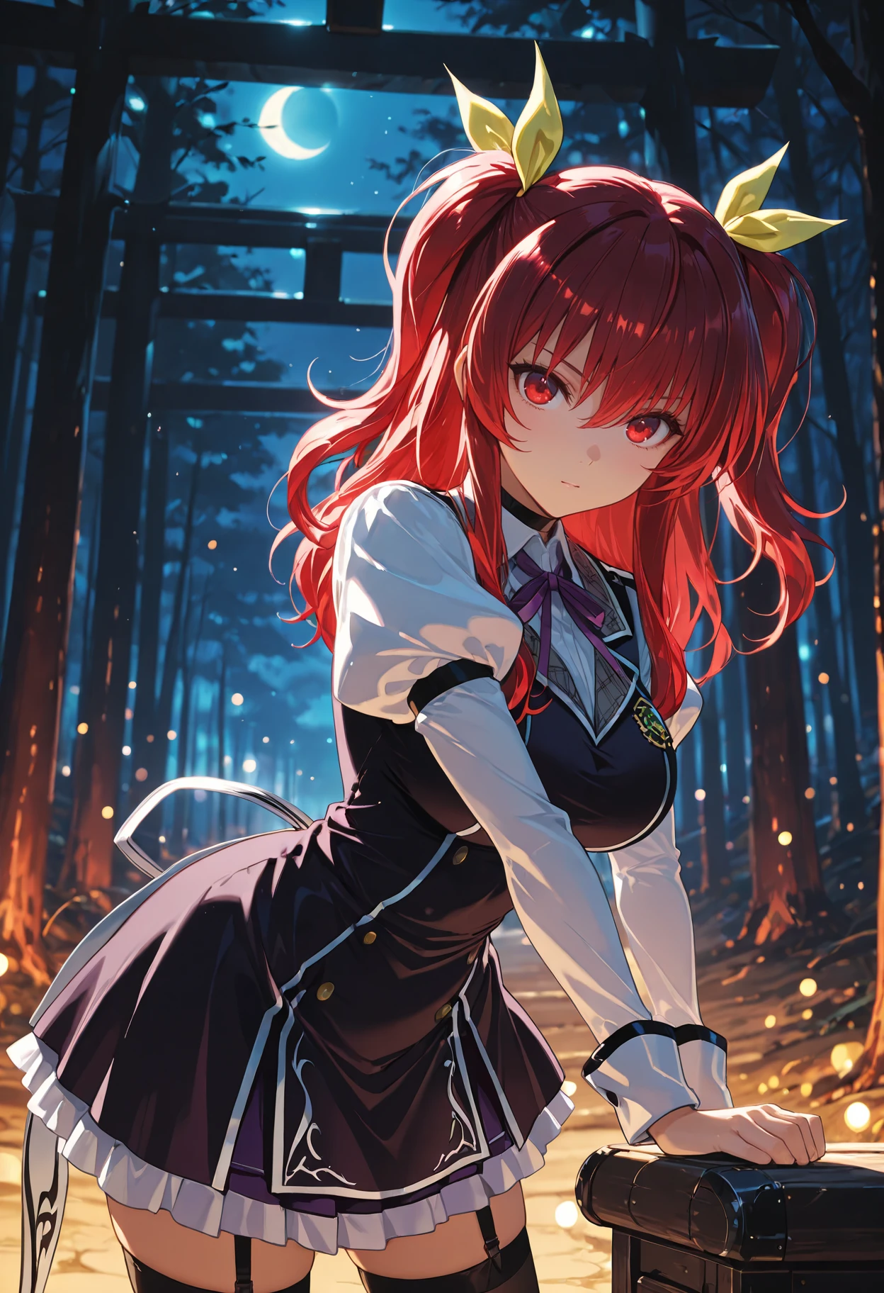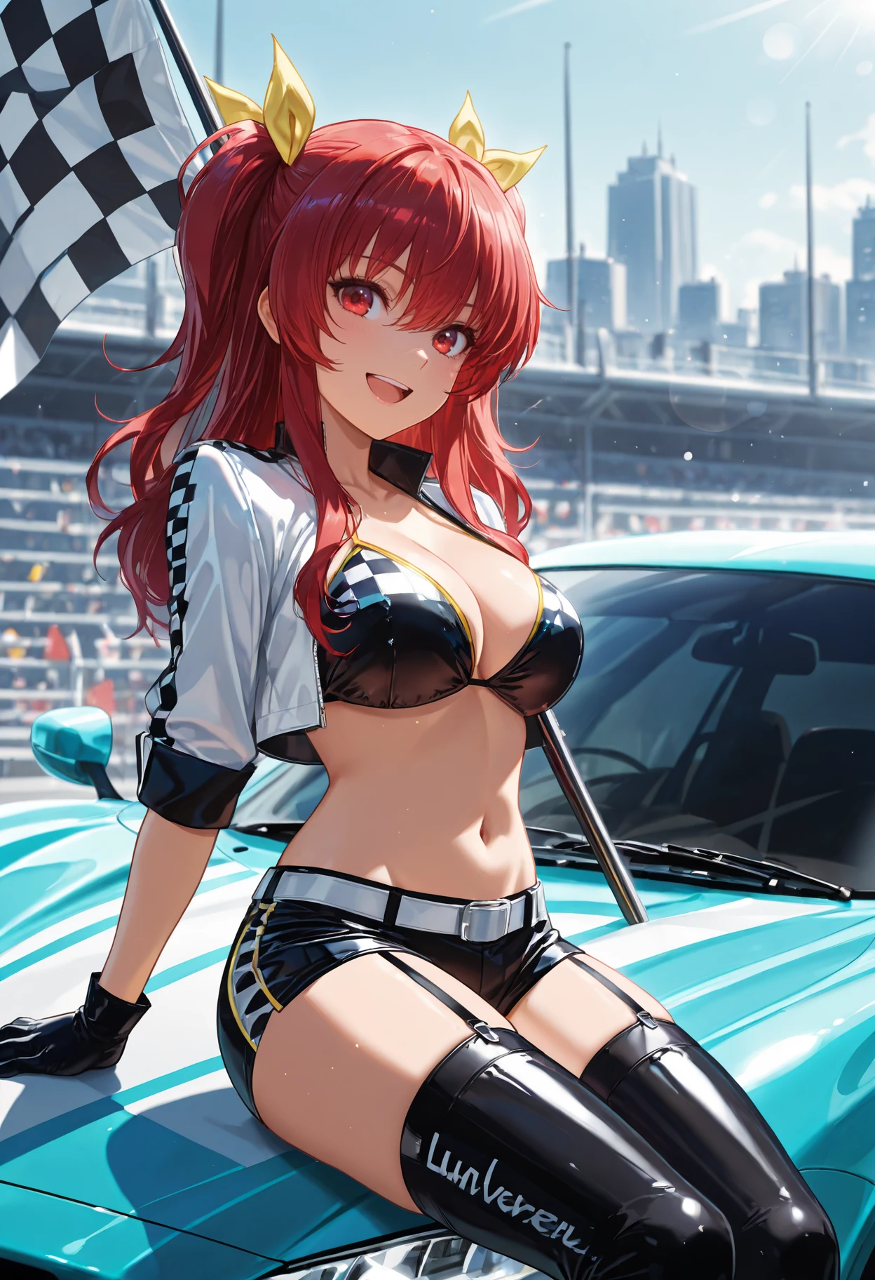 stellavermillionxl, red eyes, red hair, two side up, long hair, twintails, hair between eyes, long sidelocks, hair bow, yellow bow,