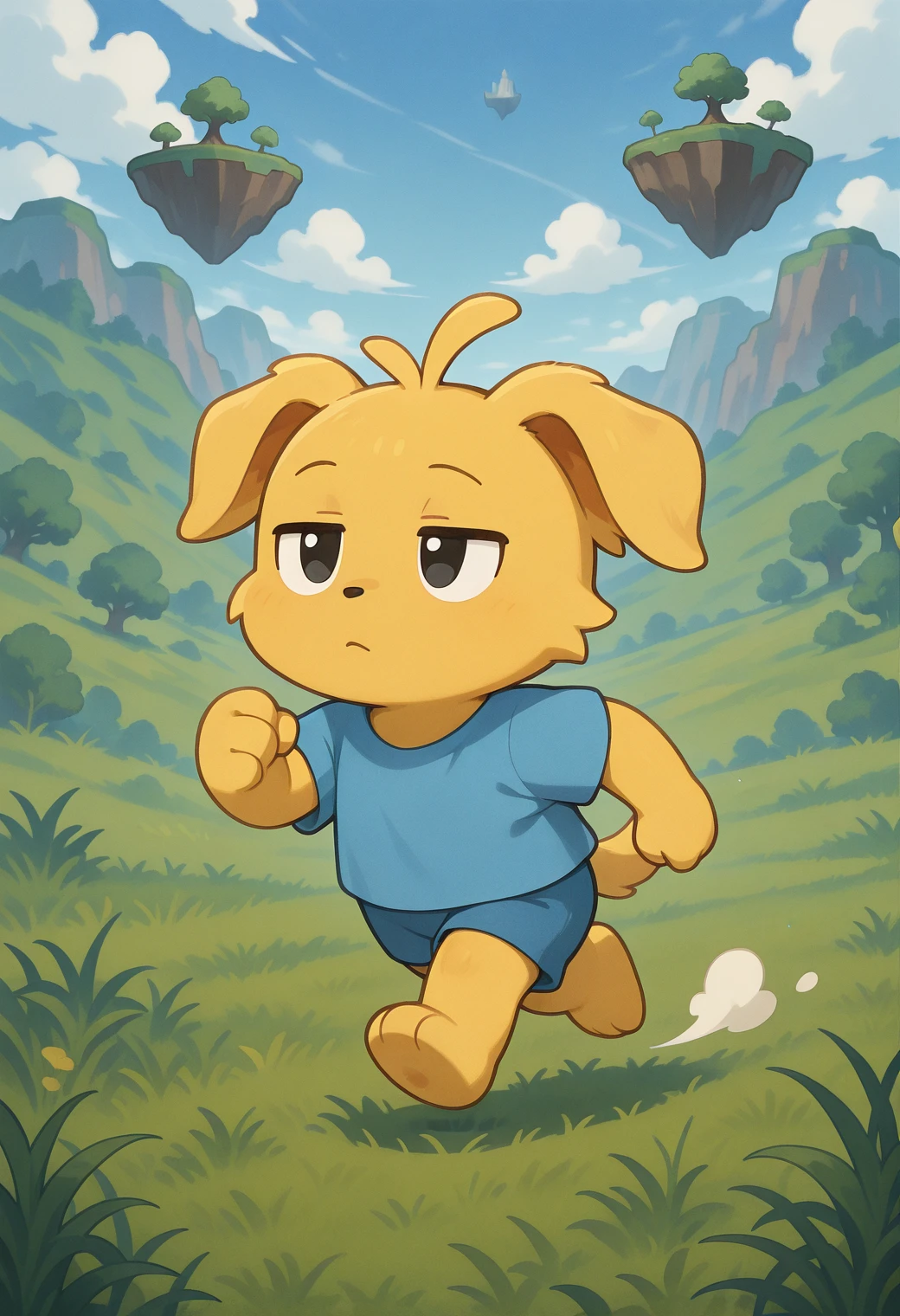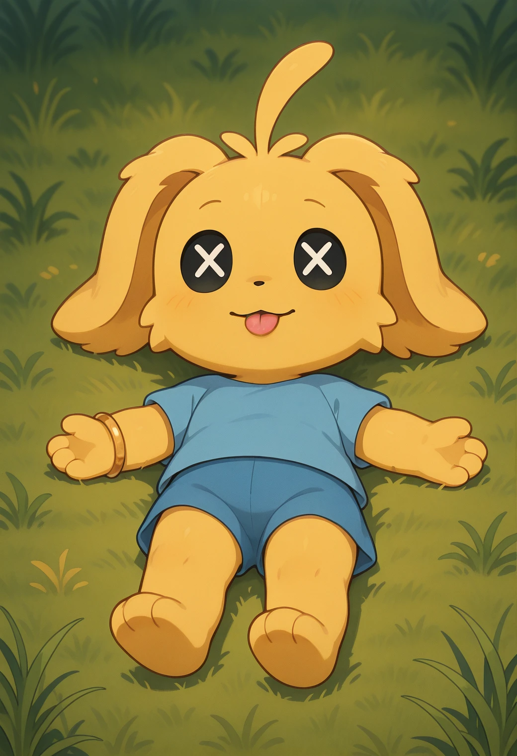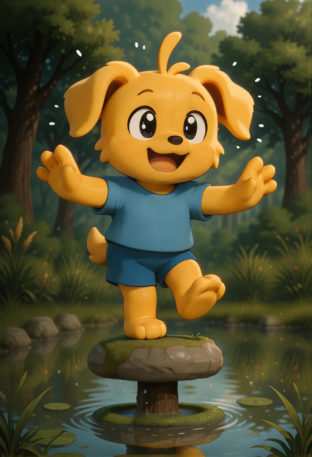 Optional Prompting: yellow fur, blue shirt, blue shorts