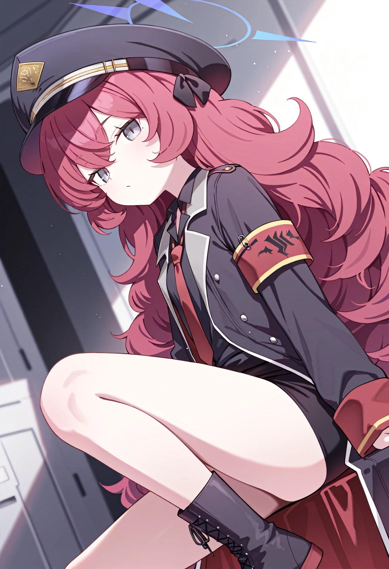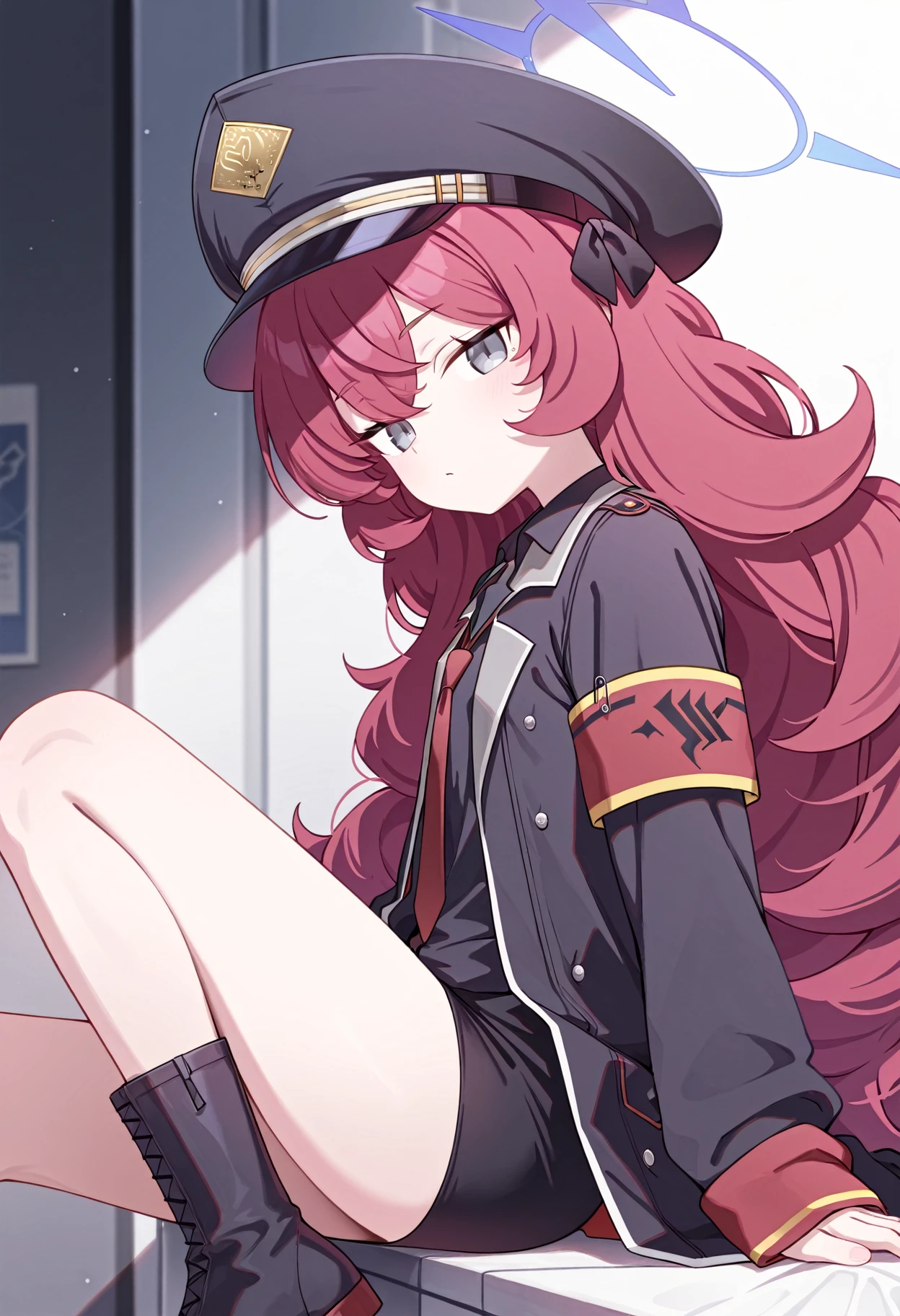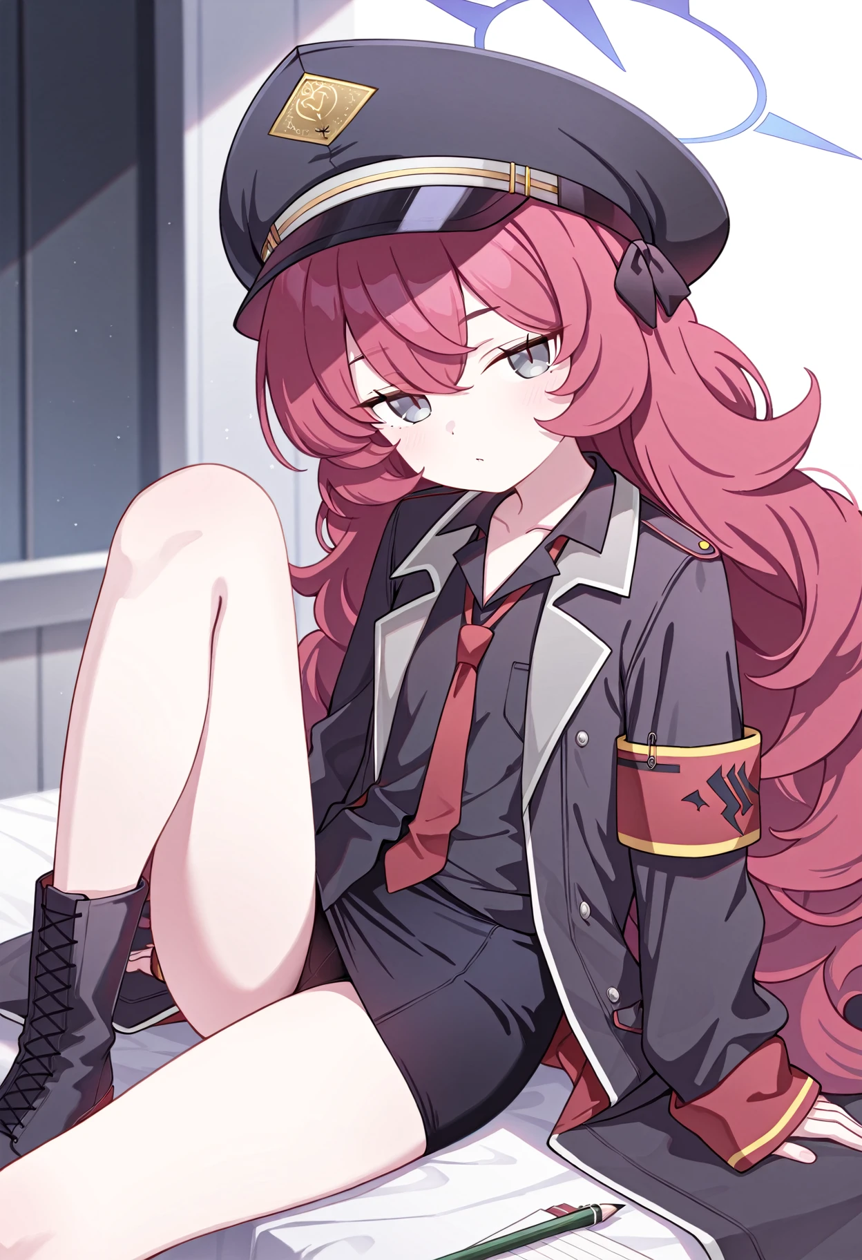 iroha_(blue_archive), peaked cap, grey eyes, red hair, wavy hair ,long hair, red necktie, red armband, pencil skirt, collared shirt, black shirt, boots, halo, open coat, jacket