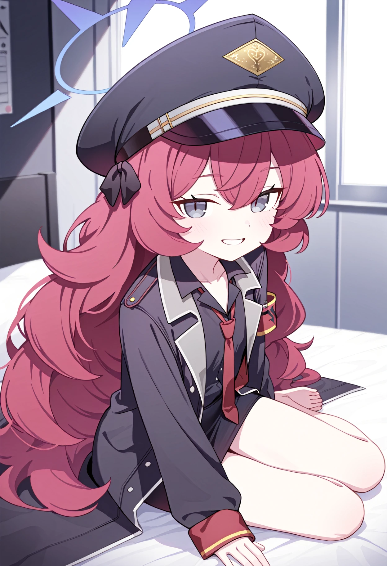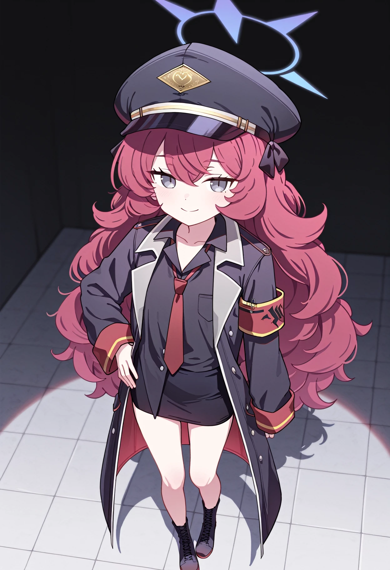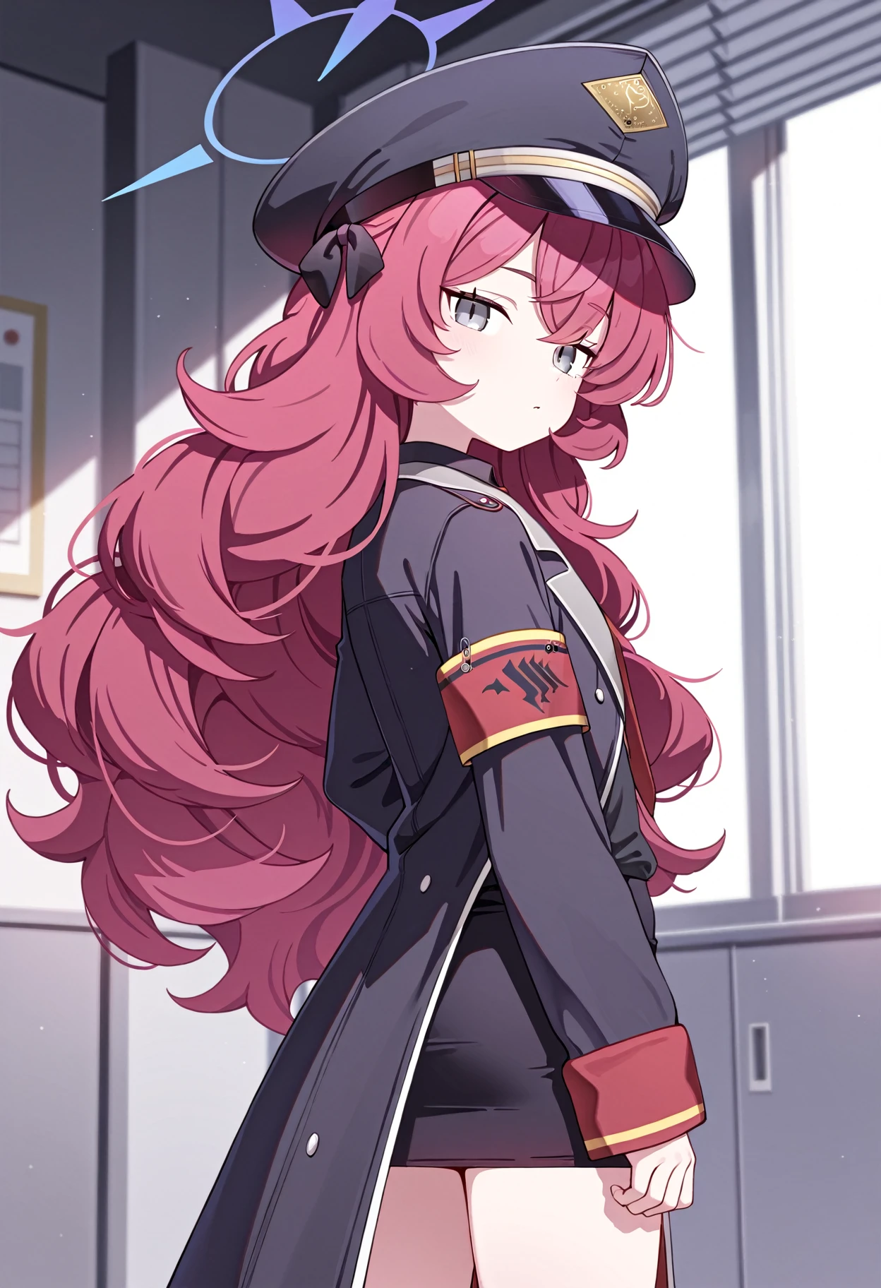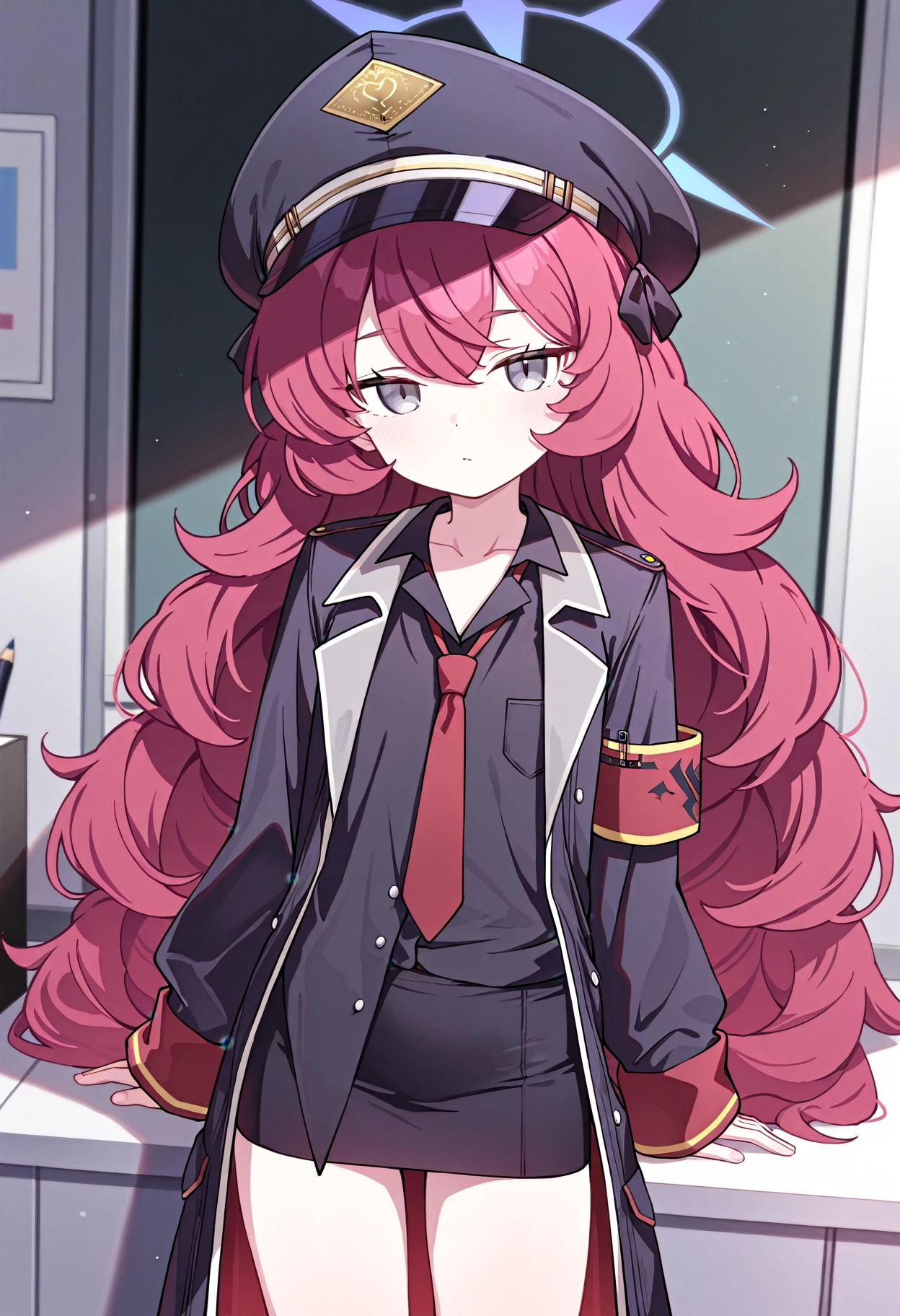 iroha_(blue_archive), peaked cap, grey eyes, red hair, wavy hair ,long hair, red necktie, red armband, pencil skirt, collared shirt, black shirt, boots, halo, open coat, jacket