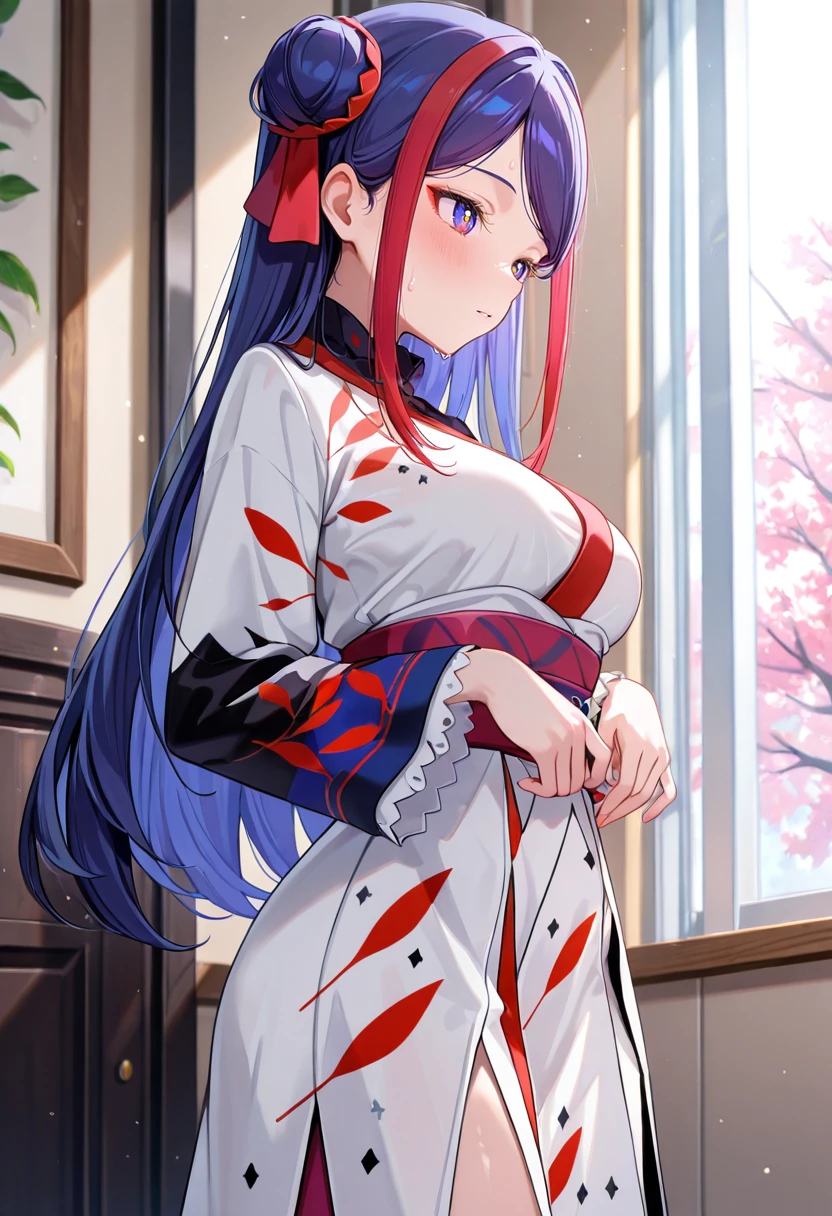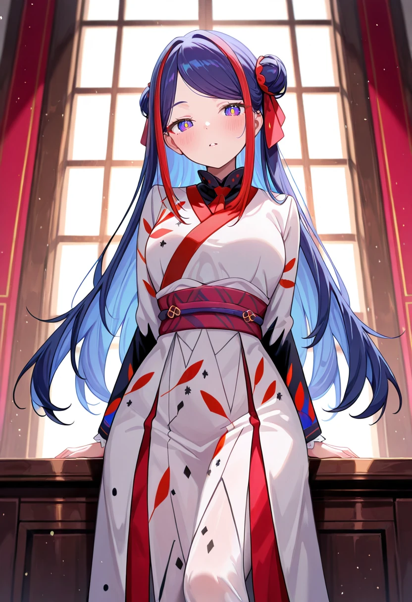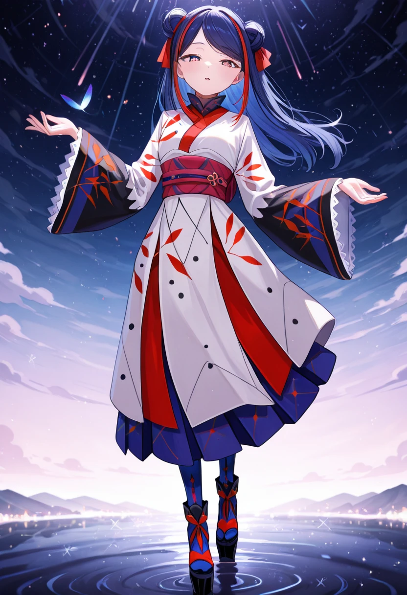 double bun,multicolored hair,streaked hair,red ribbon,two-tone hair,multicolored eyes,long hair,blue hair,red hair,Outfits: