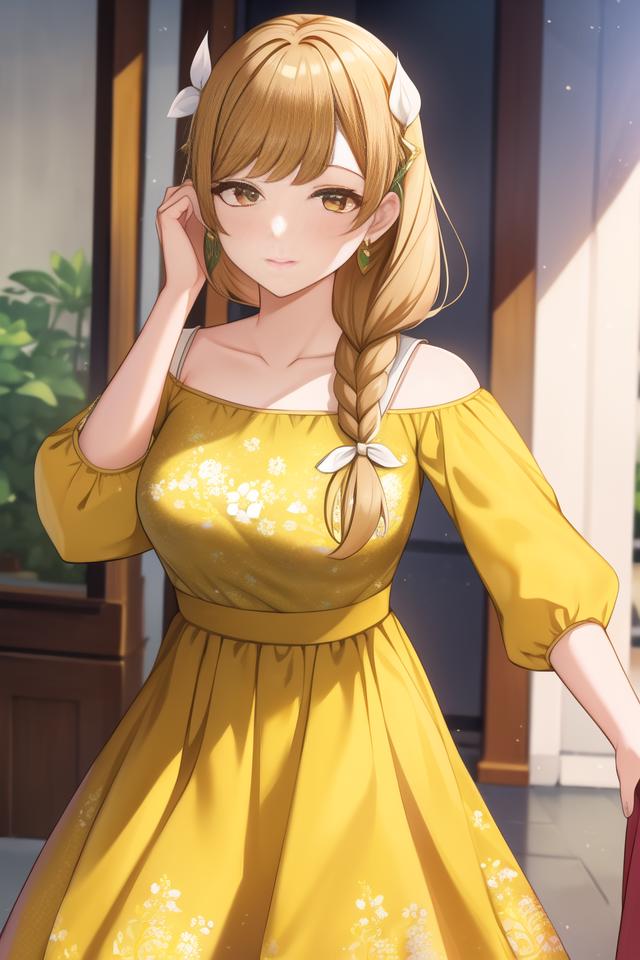 Somniel Outfit: goldmary, goldmarysomniel, yellow dress, single braid, hair ornament, floral print, long sleeves, hair over shoulder, collarbone, jewelry, ribbon,