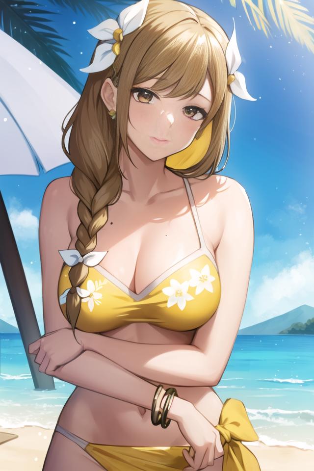 Swimsuit: goldmary, goldmaryswimsuit, yellow bikini, bracelet, sarong, single braid, hair ornament, bare shoulders, jewelry, hair over shoulder, hair flower, earrings, mole on breast,