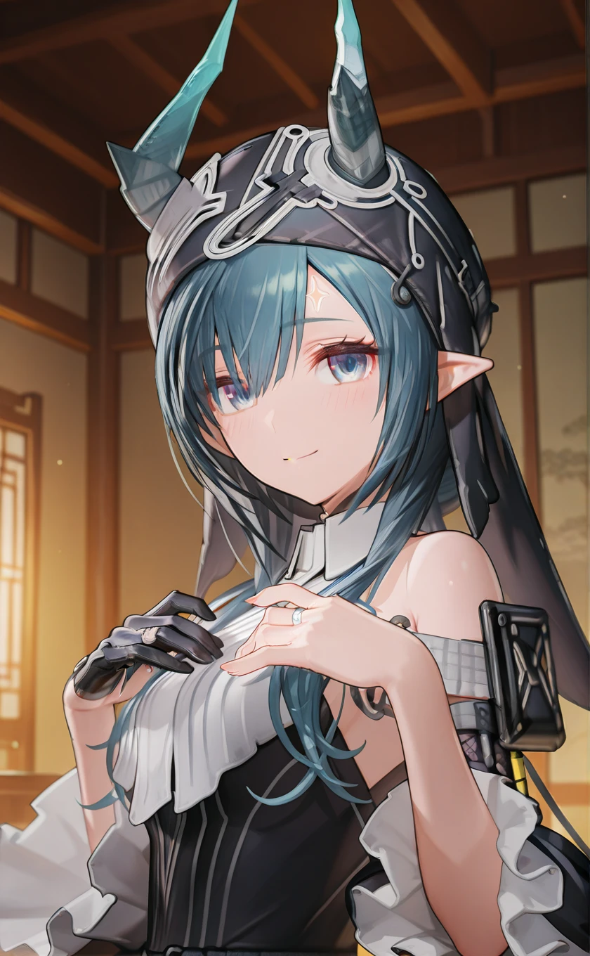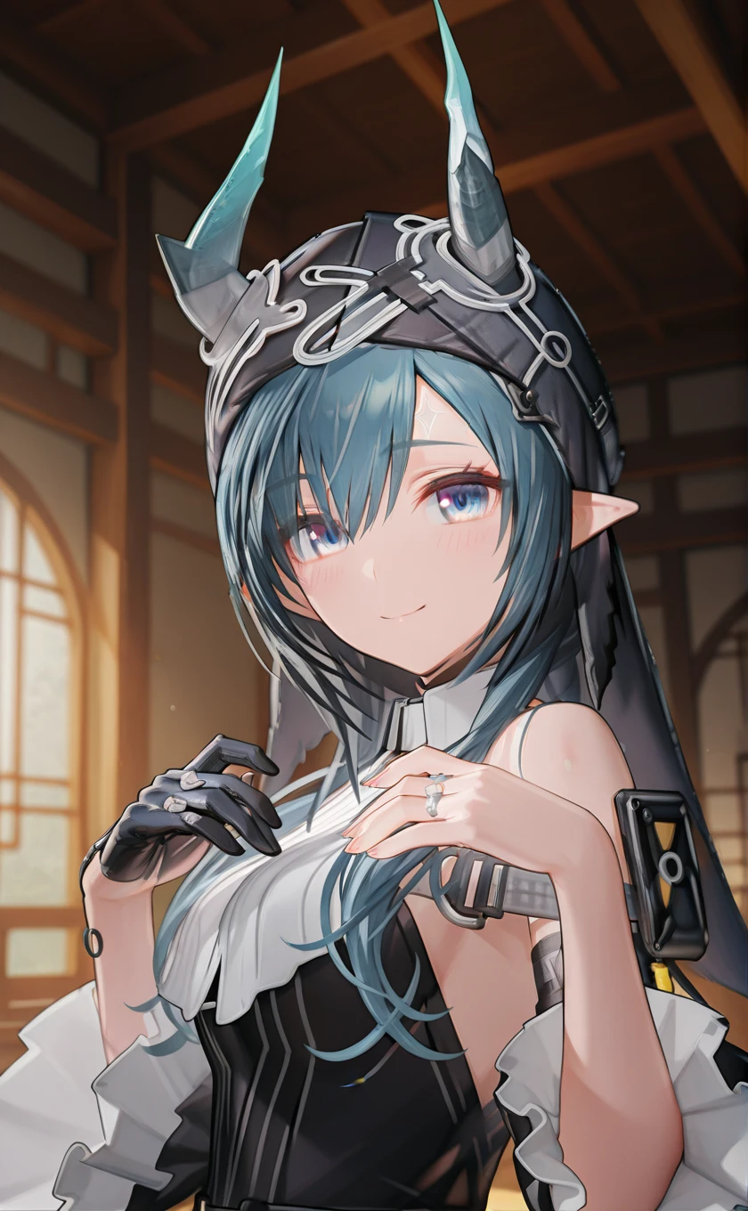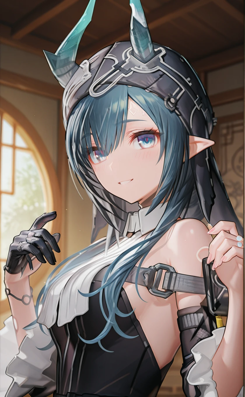 dragon horns,horns through headwear,long hair,blue hair,pointy ears,sidelocks,blue eyes