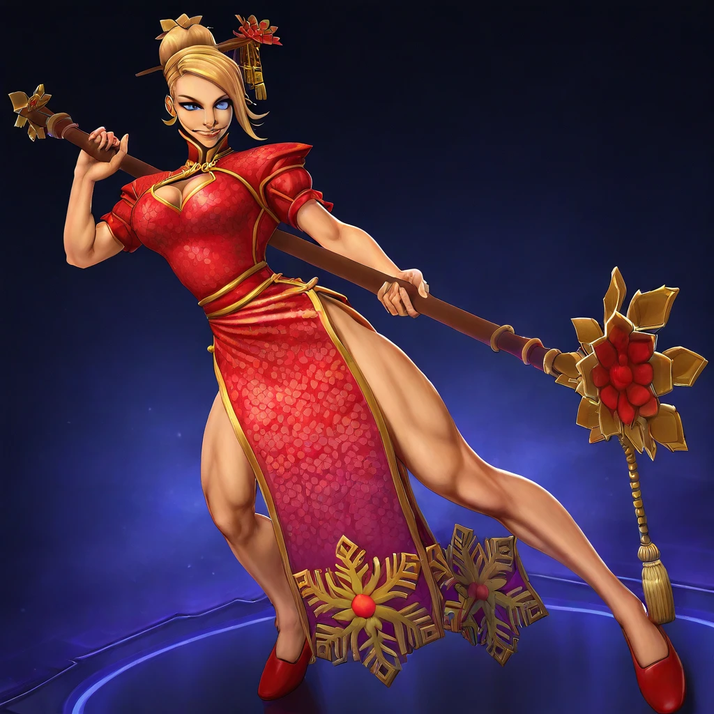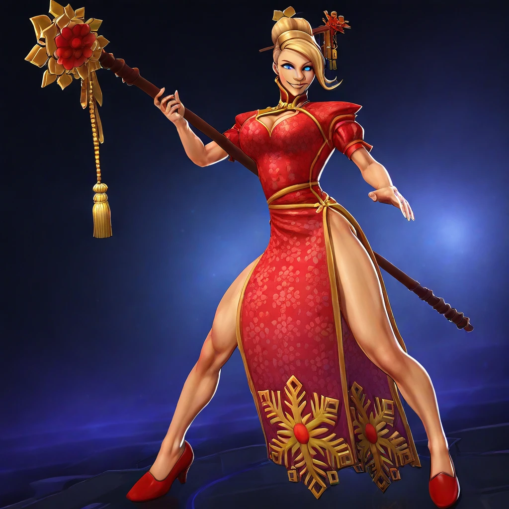 LunarJainaHoTS, 1girl, solo, blonde hair, long hair, hair ornament, hair stick, hair flower, bangs, blue eyes, full lips, chinese clothes, chinese dress, large breasts, cleavage cutout, gold ornaments, elegant red dress with gold accents, high neckline, thick thighs, magic staff with golden floral motif, red shoes,