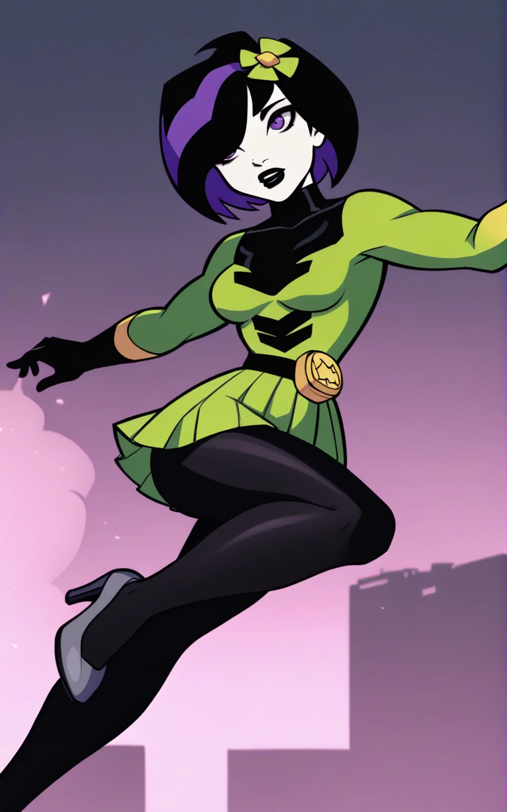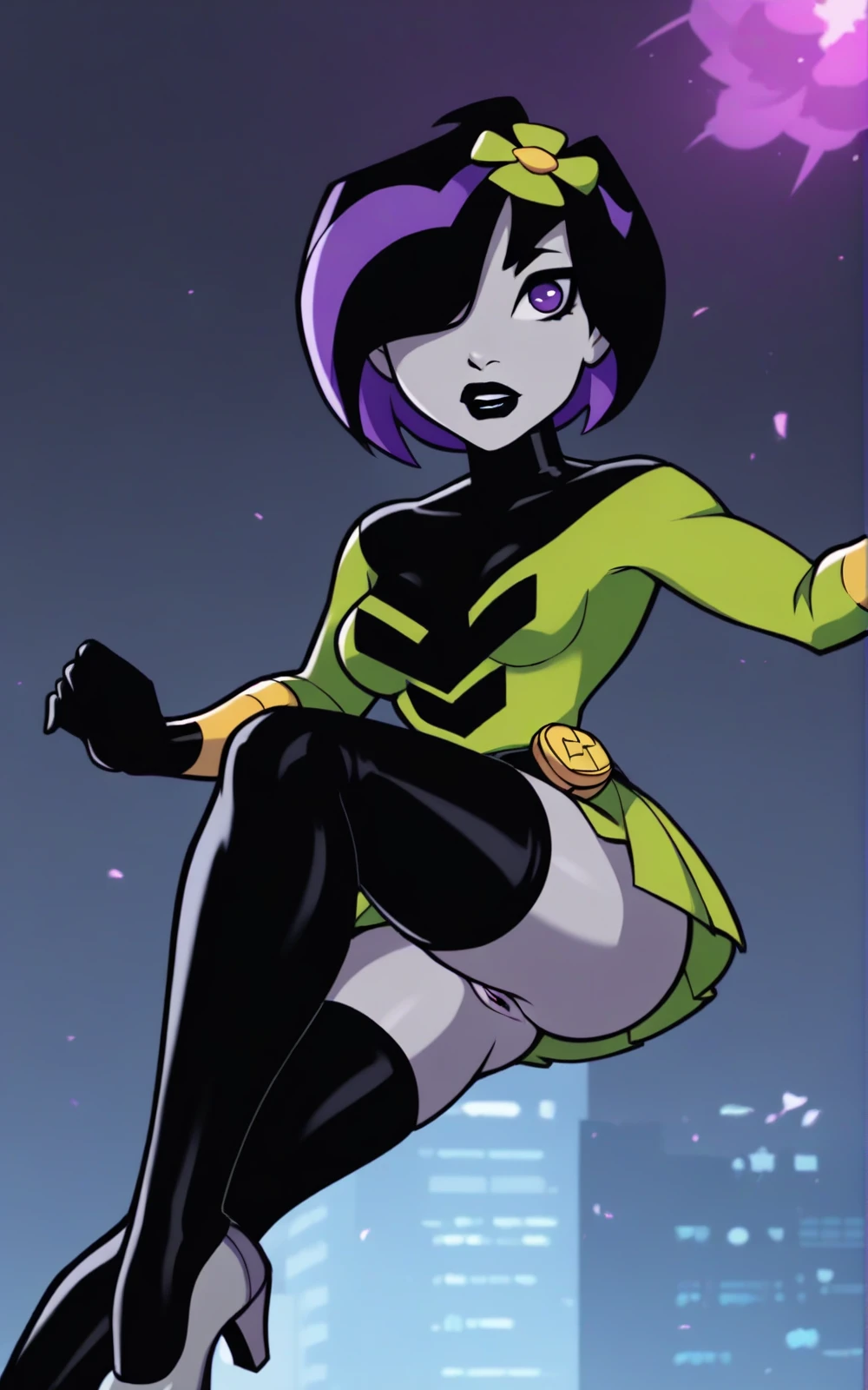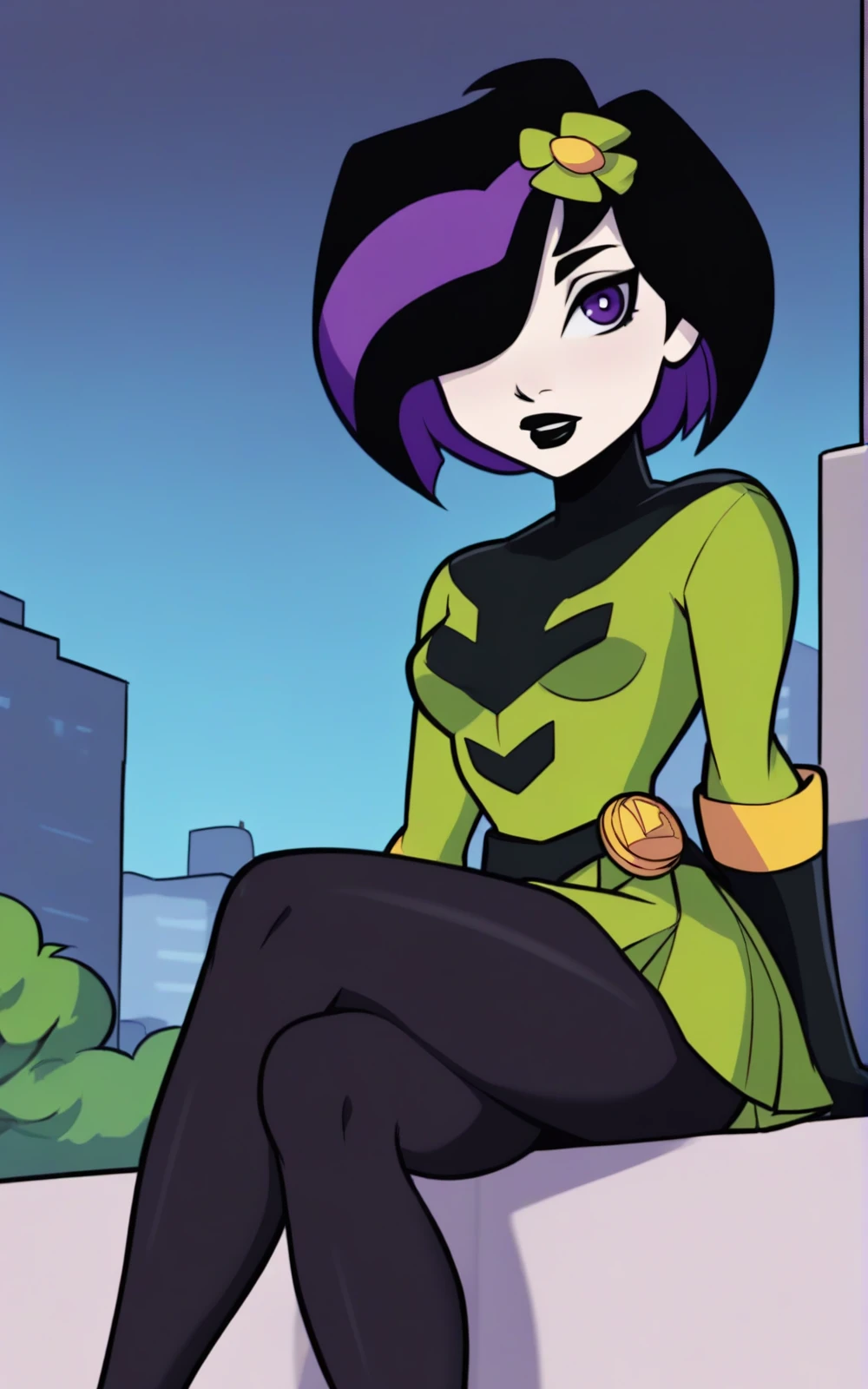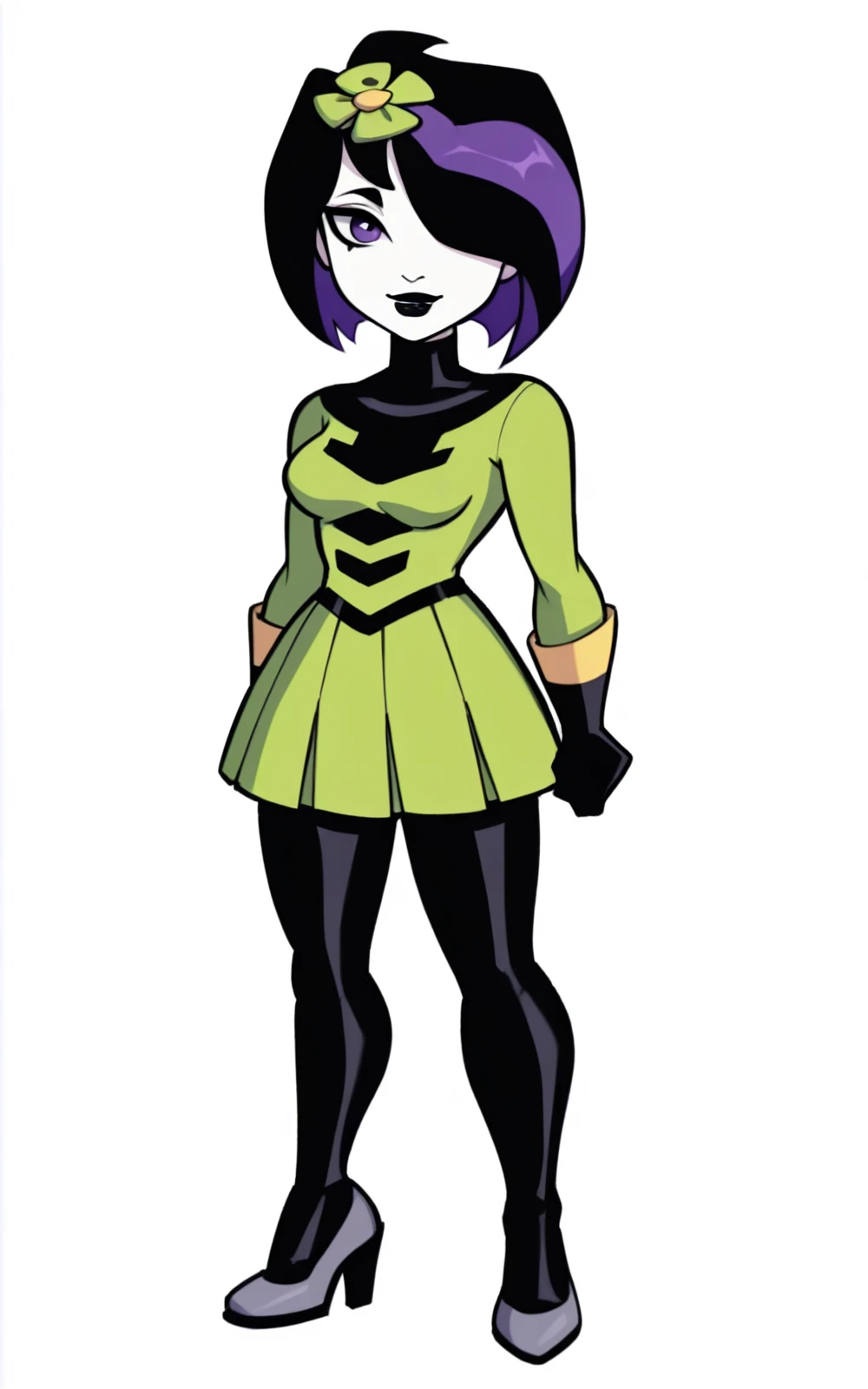 Reinforcement Tags: black lips, multicolored hair, black hair, purple hair, short hair, two-tone hair, hair over one eye, hair ornament, purple eyes, grey skin