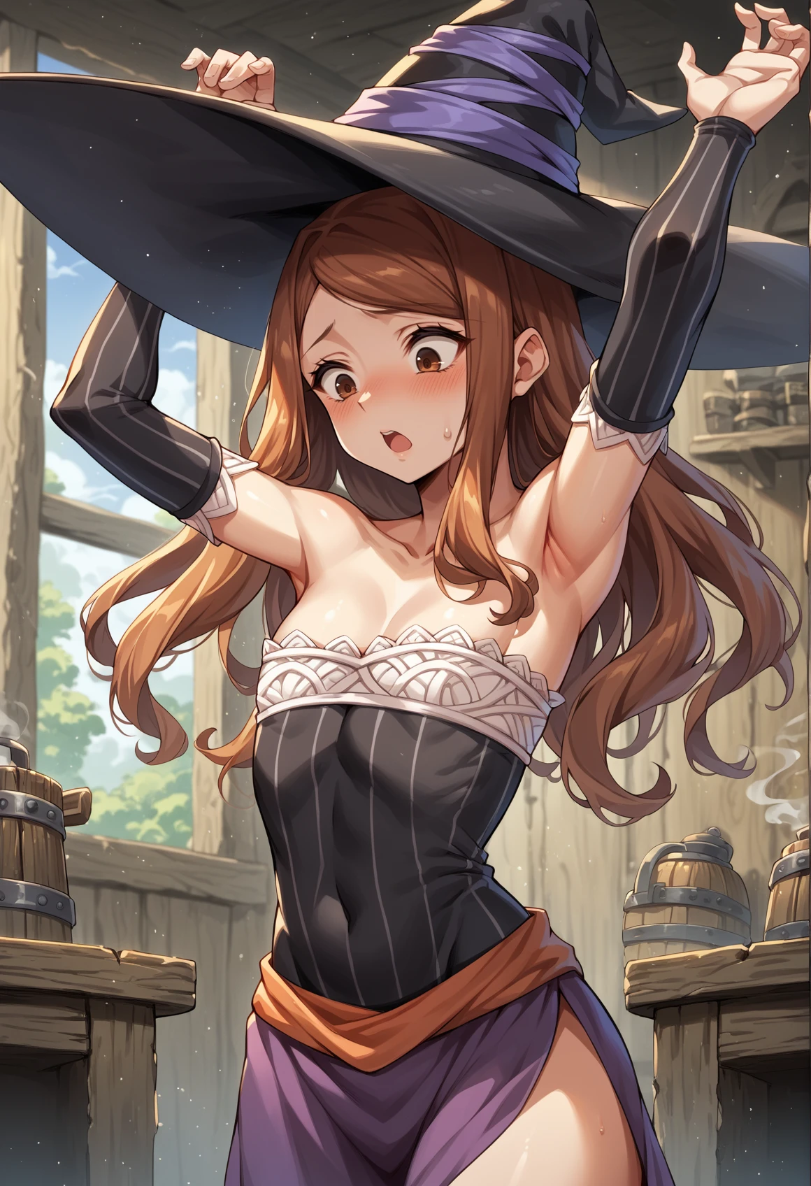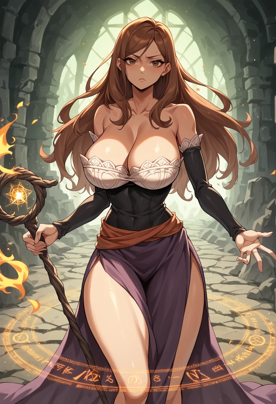 brown hair, brown eyes, long hair, witch hat, dress, cleavage, detached sleeves, side slit