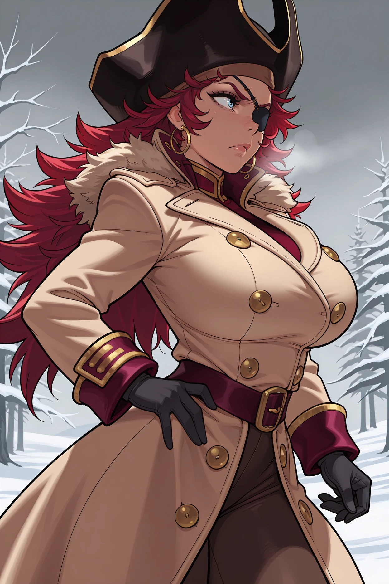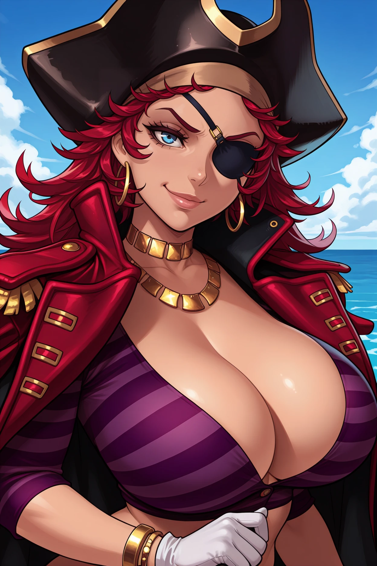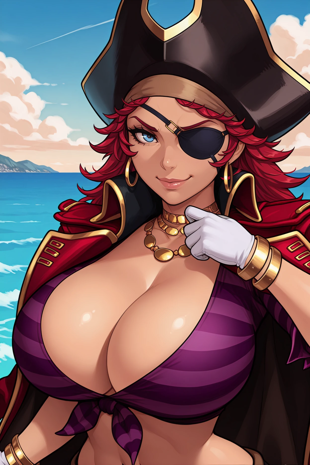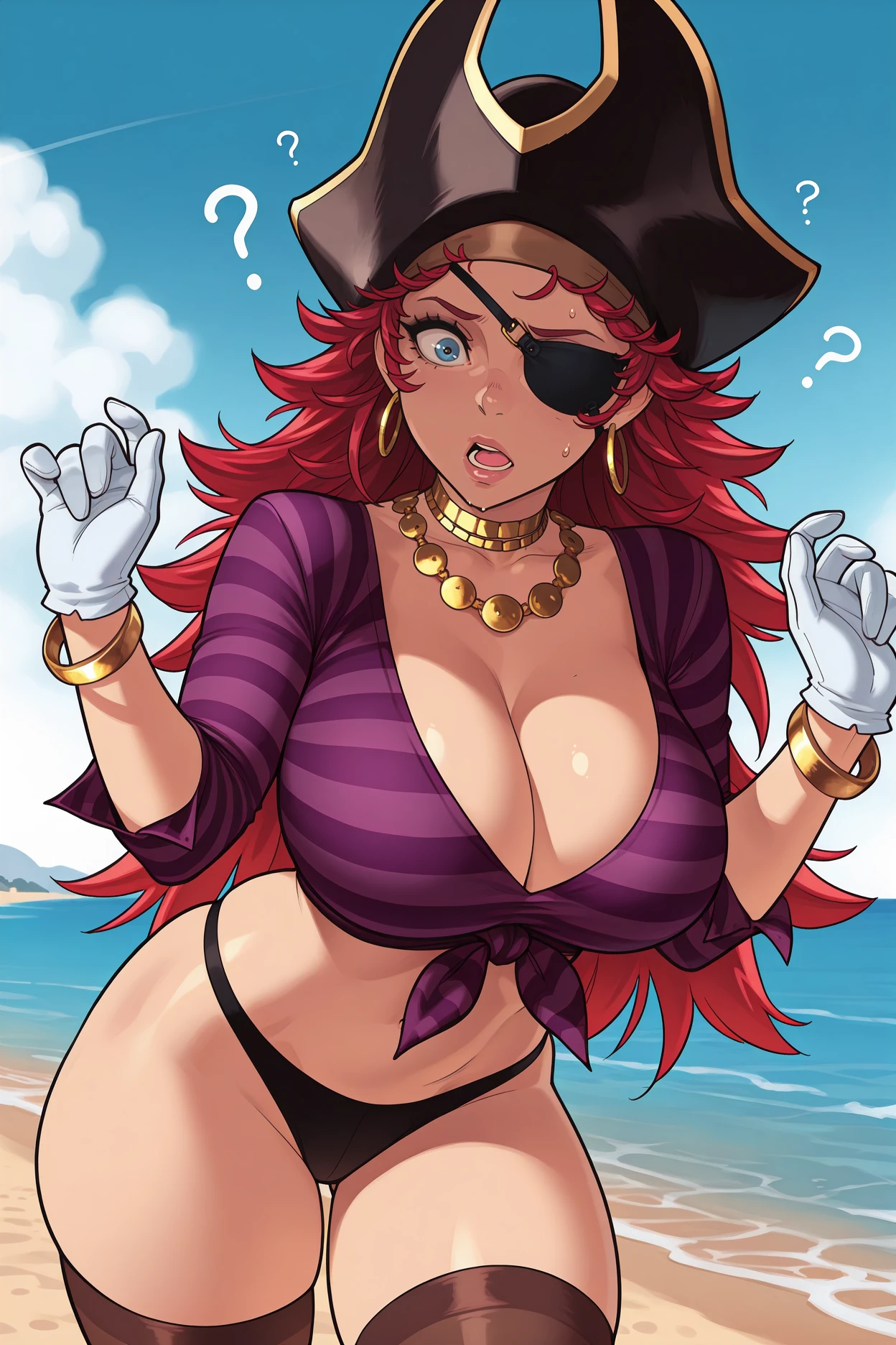 Add "pirate hat, hoop earrings, gold necklace, striped shirt, purple shirt, tied shirt, black stripes, cropped shirt, cleavage, red coat, coat on shoulders, black panties, white gloves, gold bracelet, brown thighhighs, brown boots, knee boots" for her typical look.