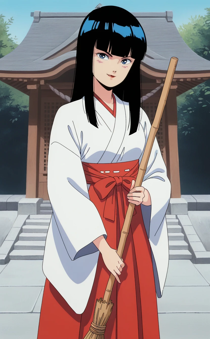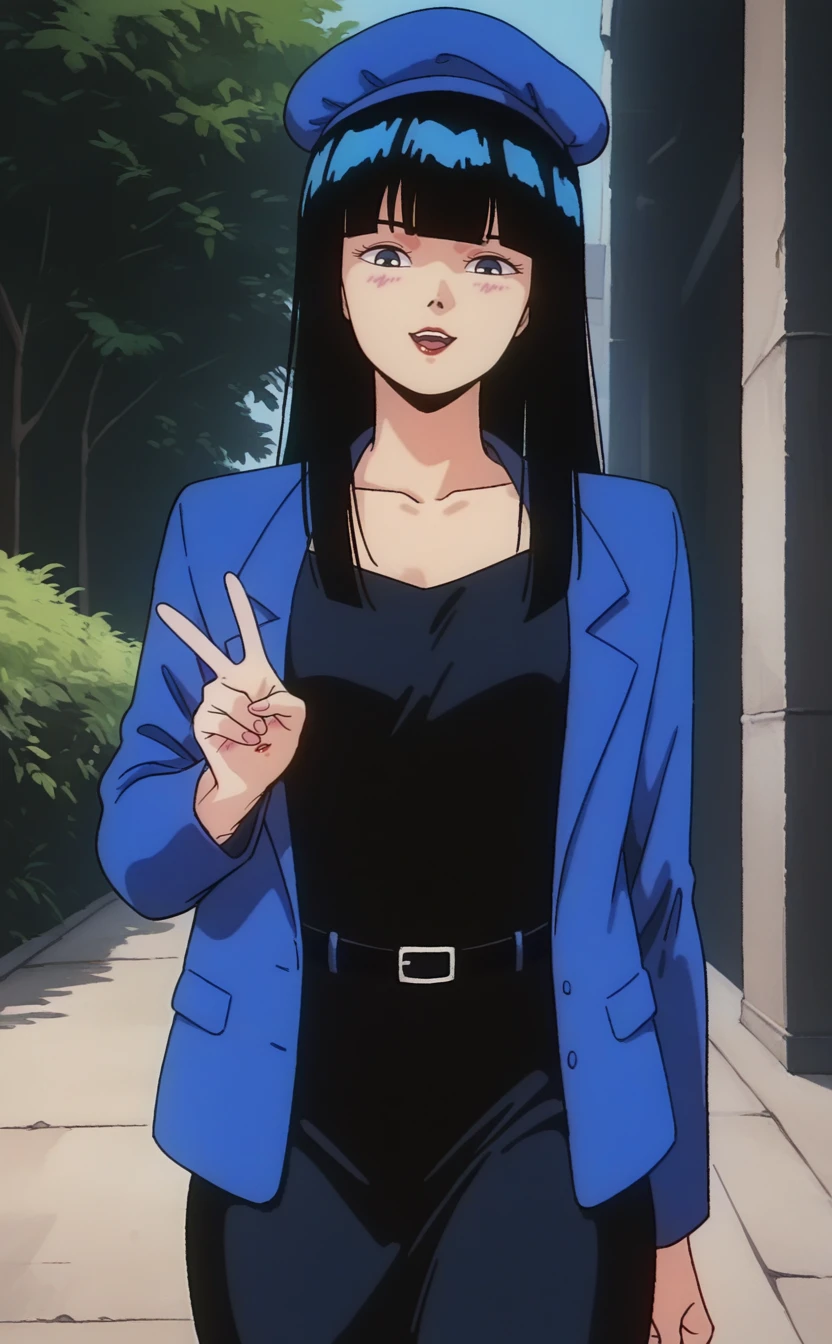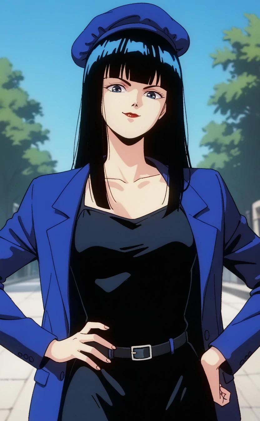 1girl,urotsuk1sukba,1980s \(style\),retro artstyle,solo, black hair, long hair,straight hair,small breasts,blunt bangs,blue eyes, red lips, black eyes,(half-closed eyes:0.8) ,(pale skin:0.9),blue jacket, collarbone, black dress, blue headwear,black belt, beret,outdoors,seductive smile,looking at viewer,best quality,masterpiece,sensitive, <lora:UrotsukiDoujiSkeban2:1>