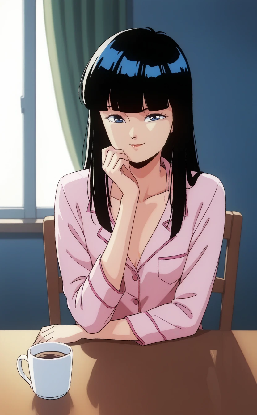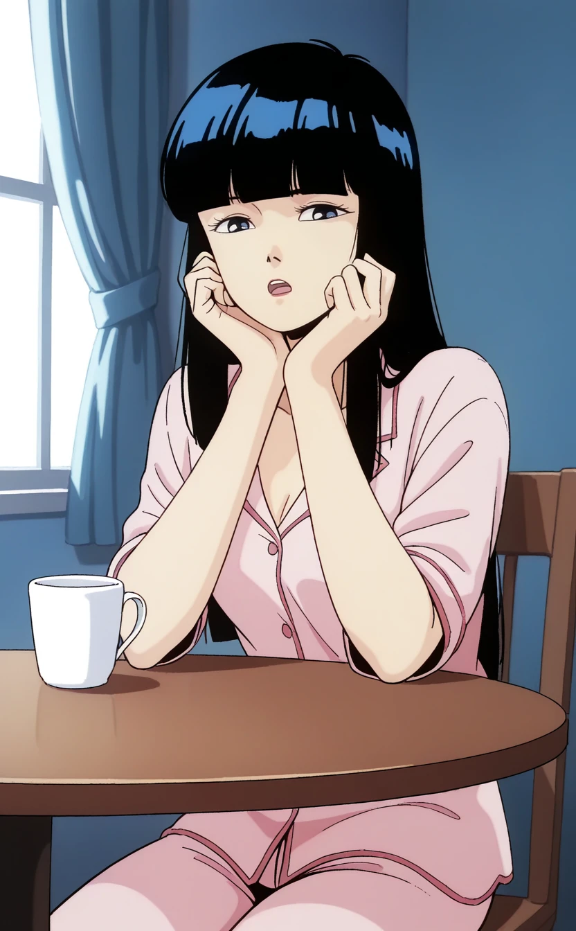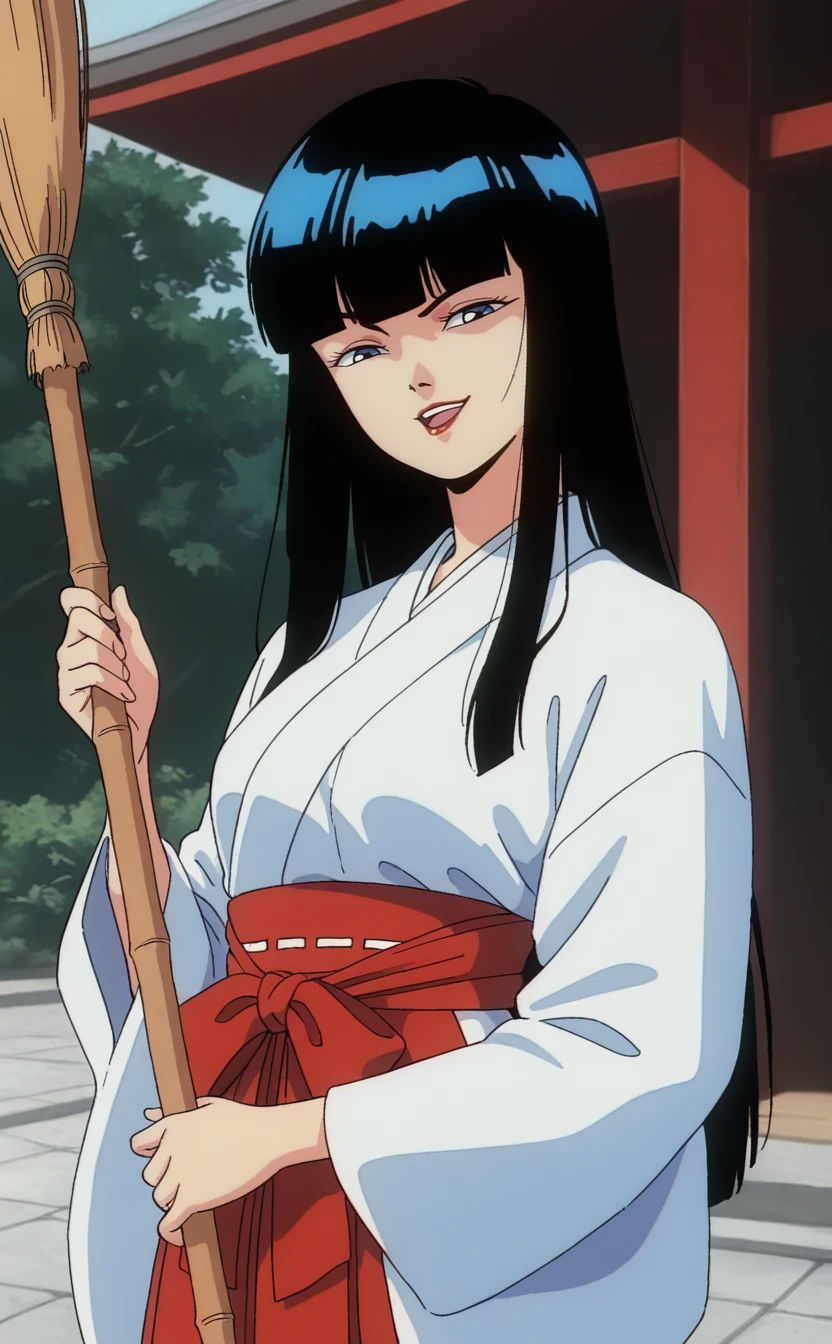 1girl,urotsuk1sukba,1980s \(style\),retro artstyle,solo, black hair, long hair,straight hair,small breasts,blunt bangs,blue eyes, red lips, black eyes,(half-closed eyes:0.8) ,(pale skin:0.9),blue jacket, collarbone, black dress, blue headwear,black belt, beret,outdoors,seductive smile,looking at viewer,best quality,masterpiece,sensitive, <lora:UrotsukiDoujiSkeban2:1>