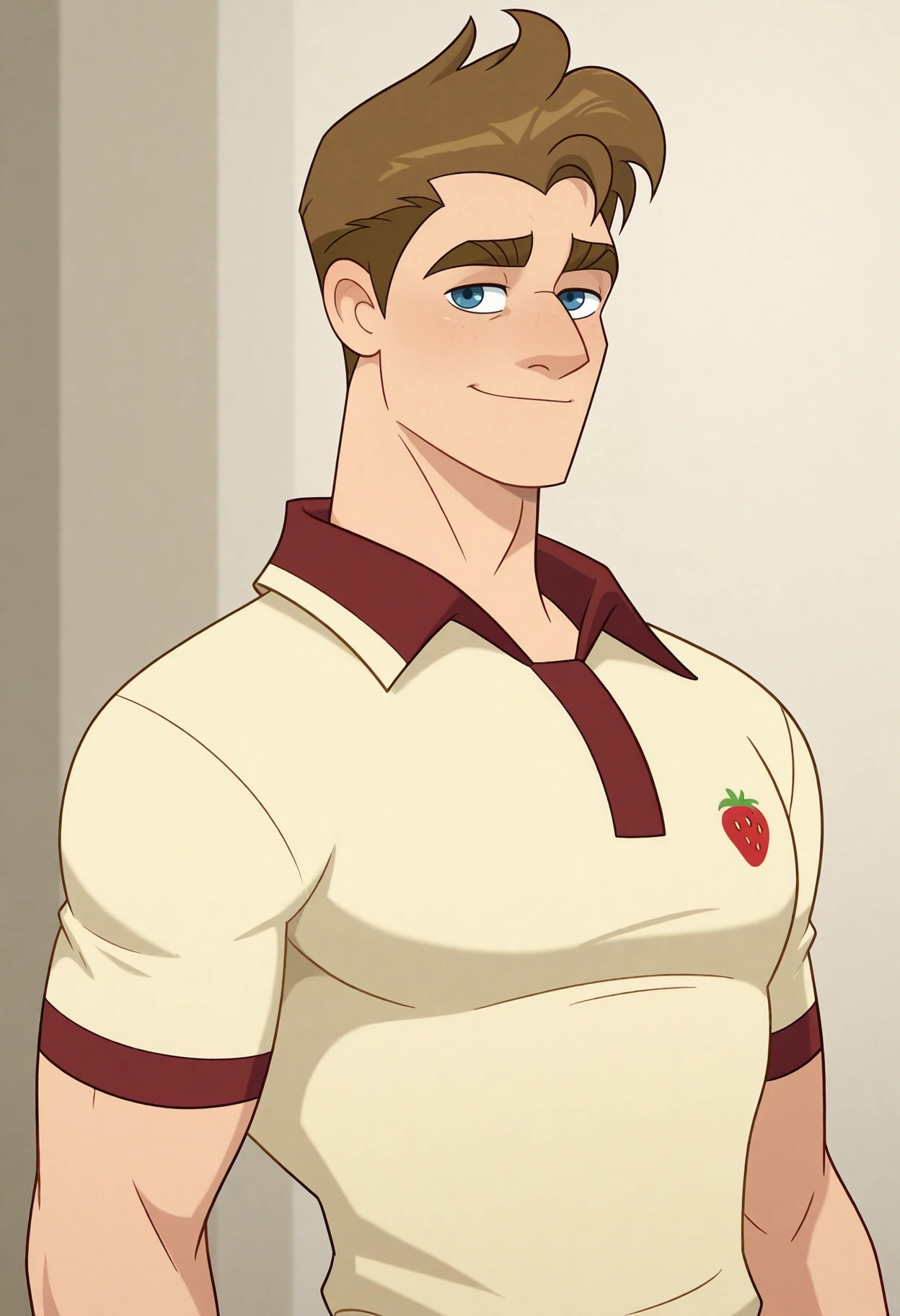 beige polo shirt with a strawberry logo and red trimbrown beltdark pantsmaroon socksgrey sneakers