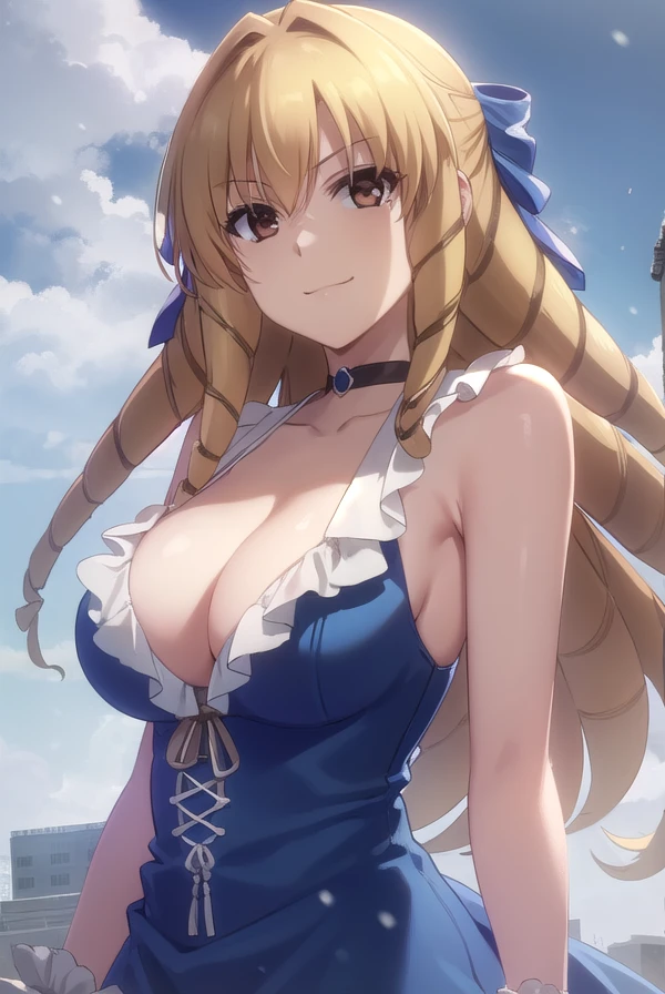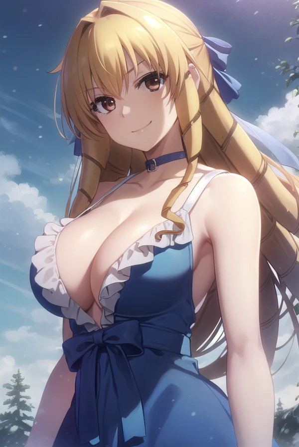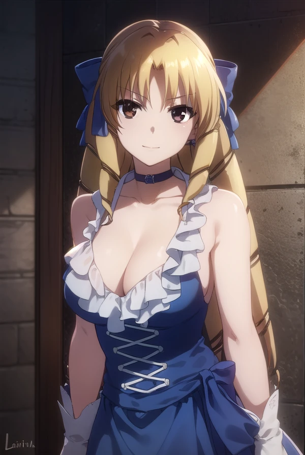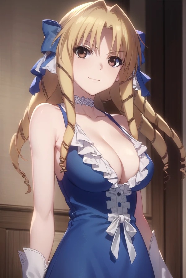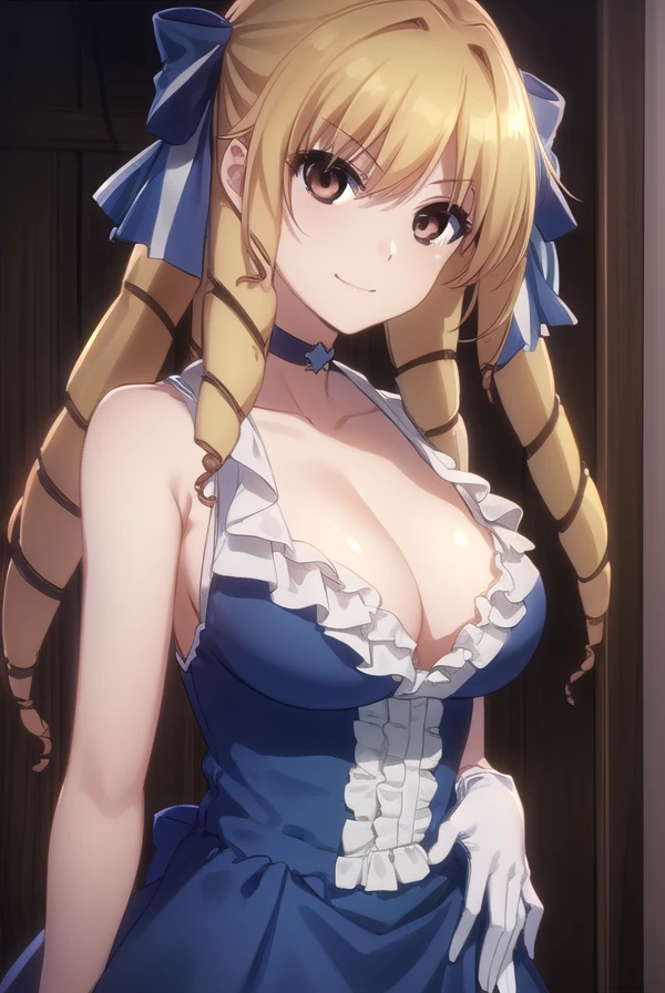 gloves, dress, cleavage, frills, choker, white gloves, blue dress,