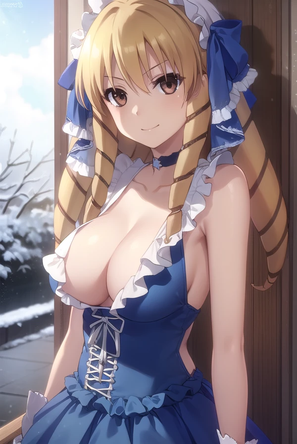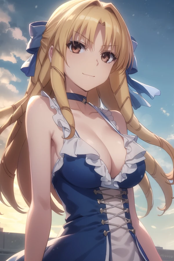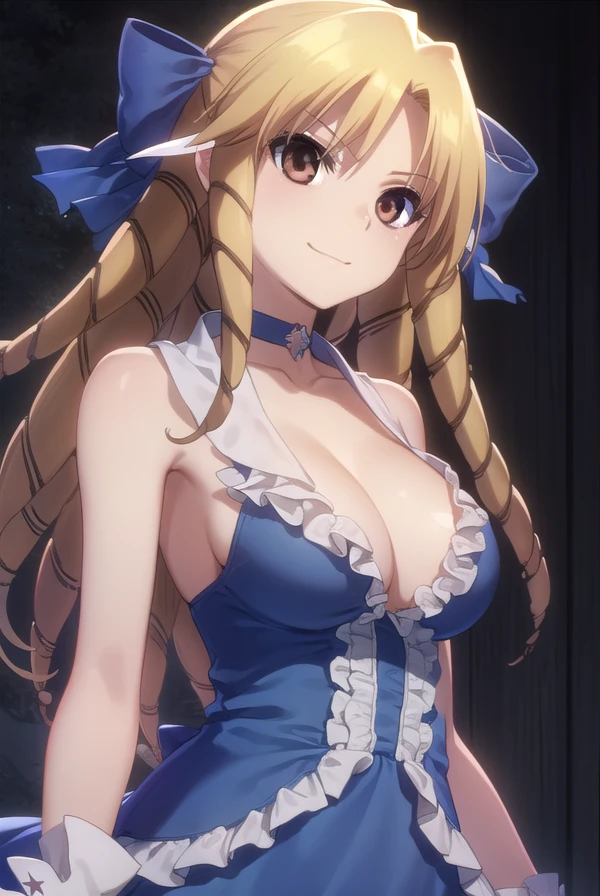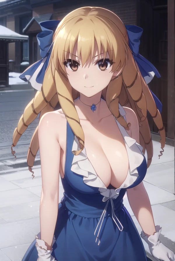 luviagelita edelfelt, long hair, (brown eyes:1.5), hair bow, blonde hair, drill hair,